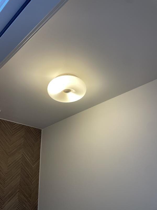 Die minimalistische Basis sorgt für eine sichere Installation, während der runde, sandfarbene Glasschirm das Licht sanft und gleichmäßig streut und so eine praktische, blendfreie Umgebungsbeleuchtung für jedes moderne Interieur bietet.