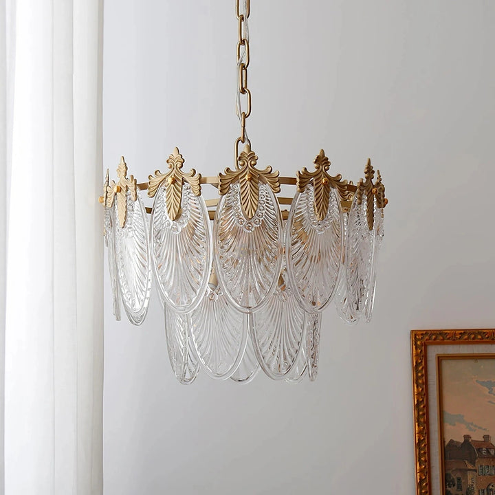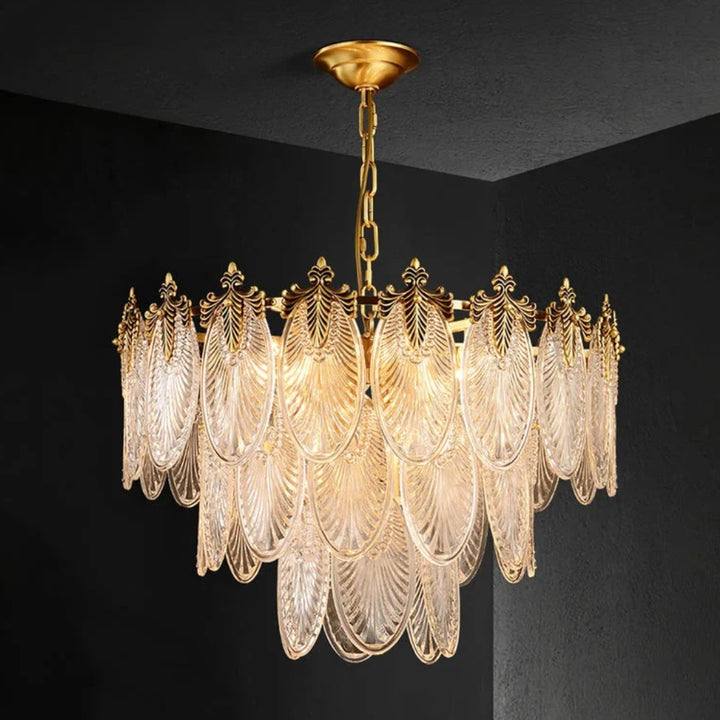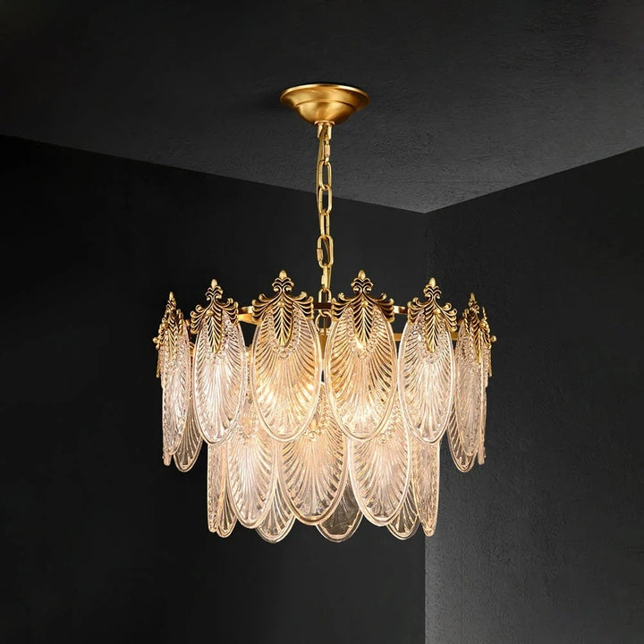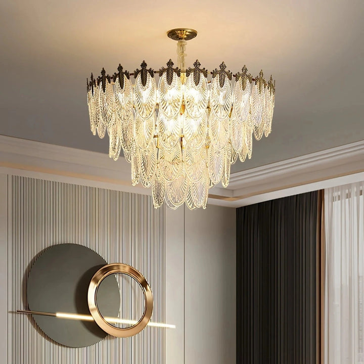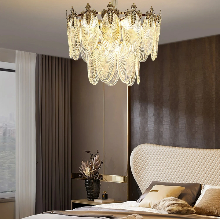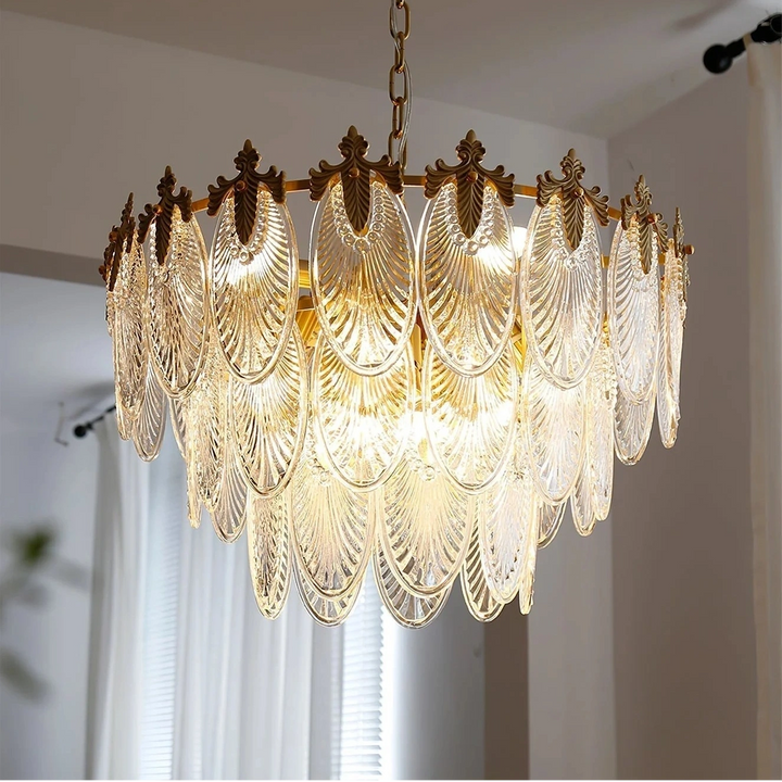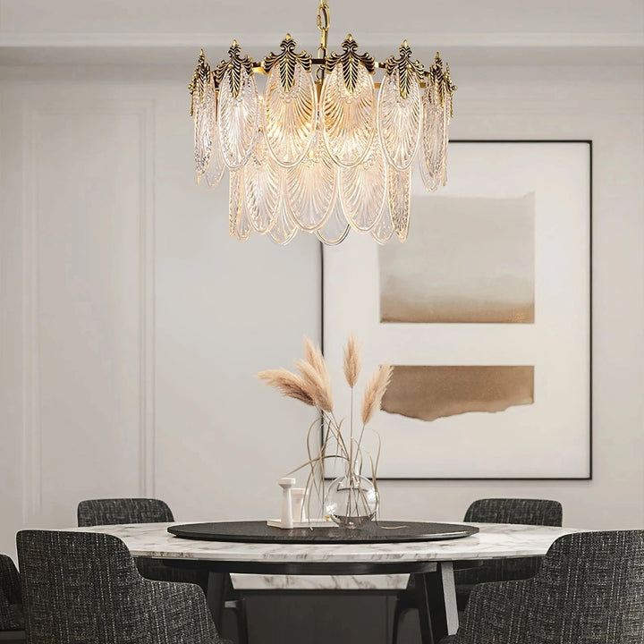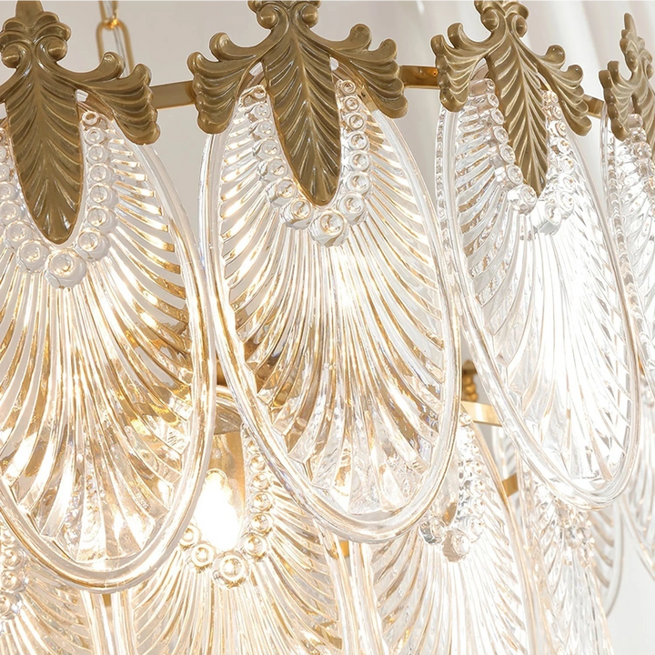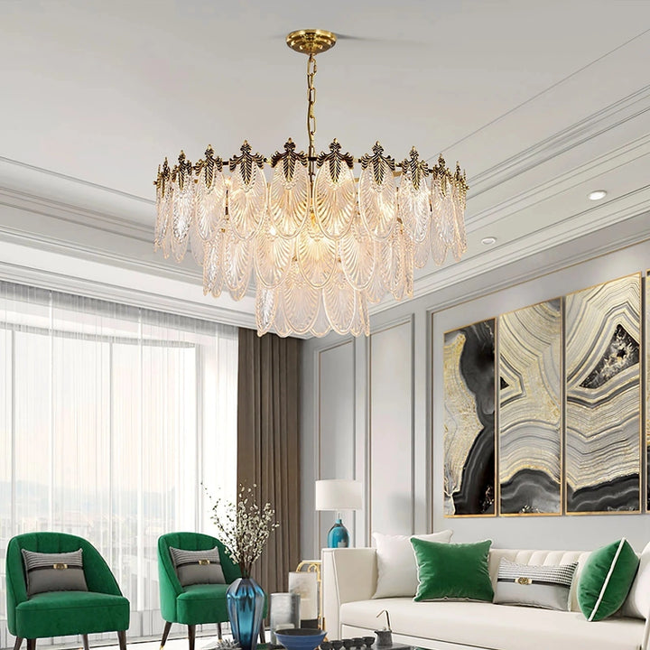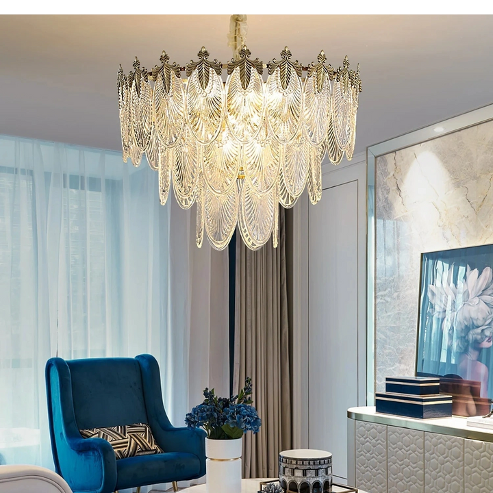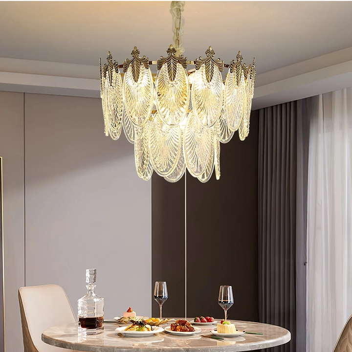 Esta lámpara de araña está hecha de cristal, y la forma de las hojas combinada con acentos de latón añade un toque de lujo retro al marco. Es perfecta para espacios como comedores, salas de estar o vestíbulos.