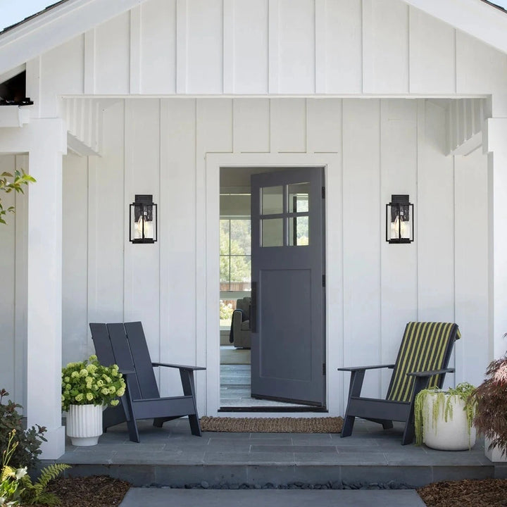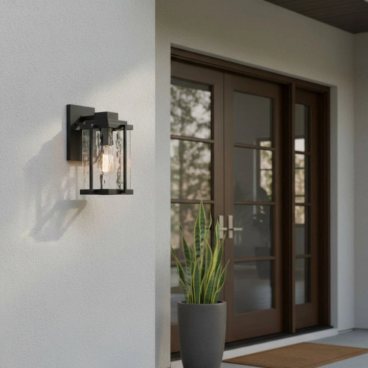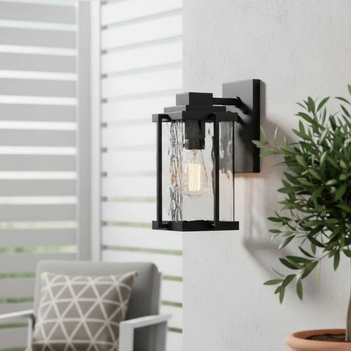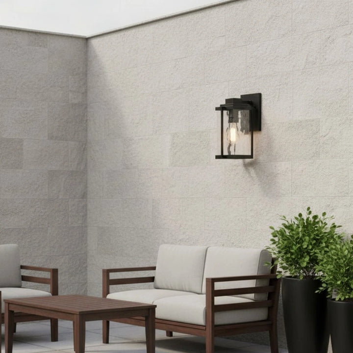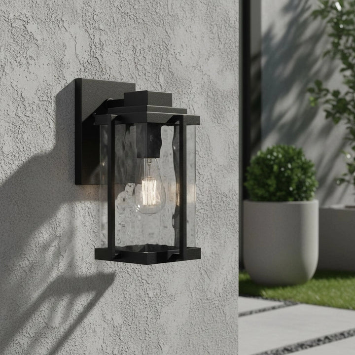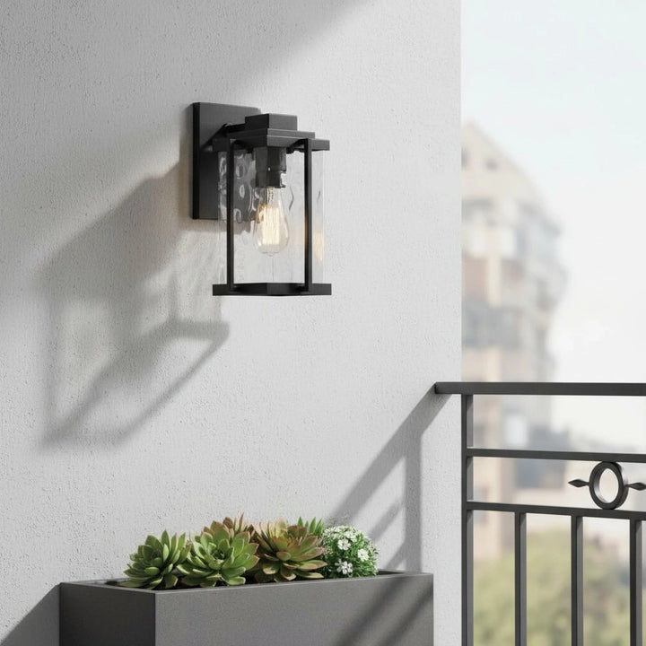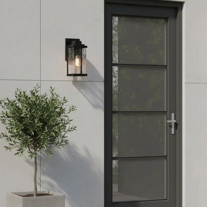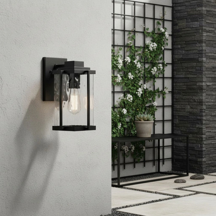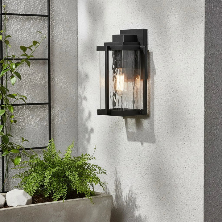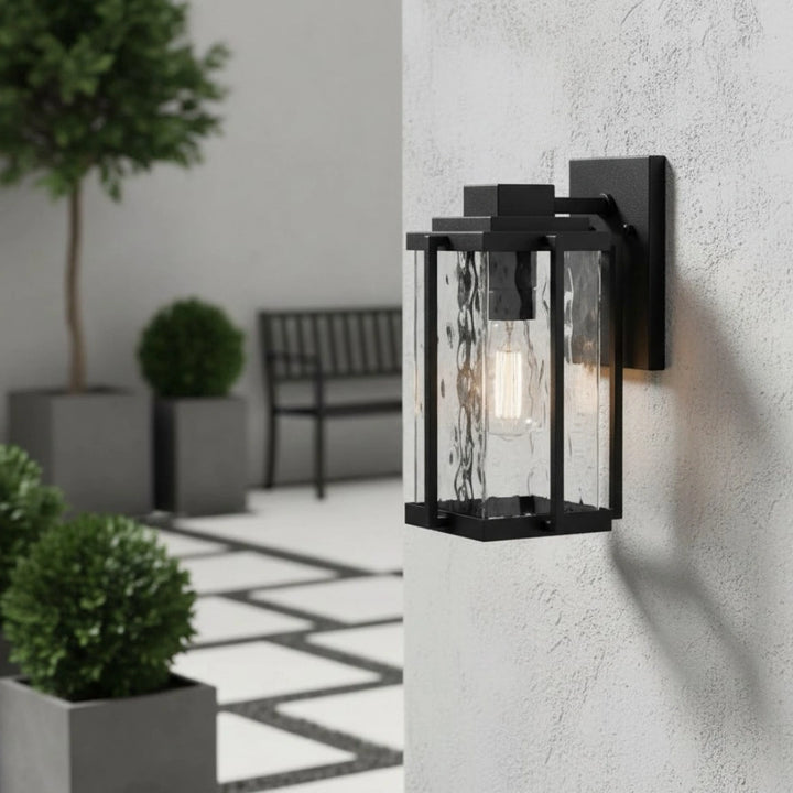 Cette lampe murale extérieure moderne est en métal noir et en verre, et convient pour les patios, entrées, balcons ou jardins.