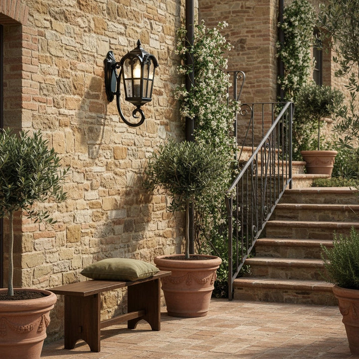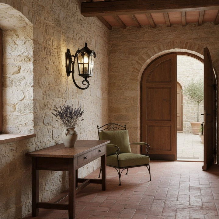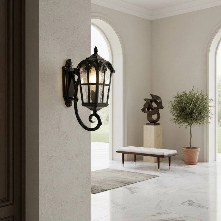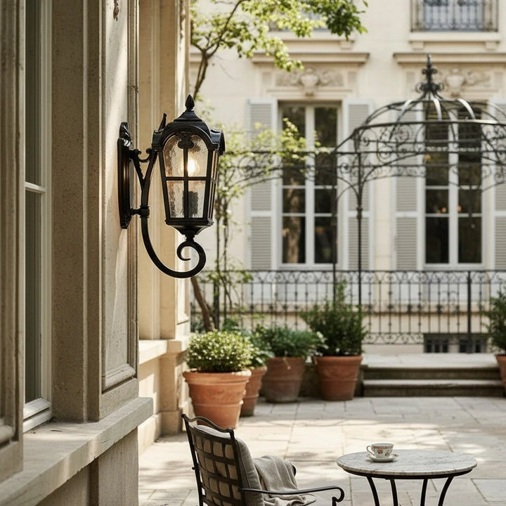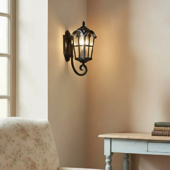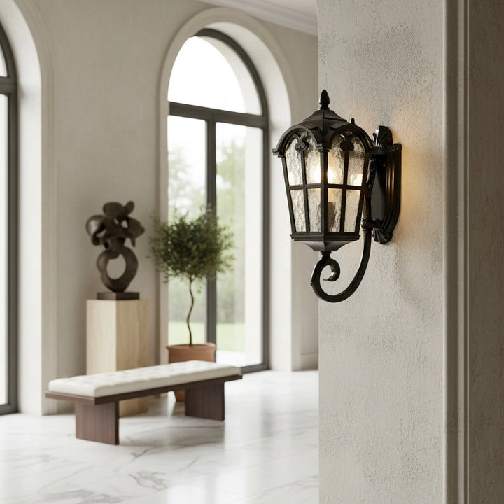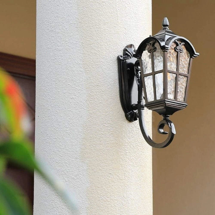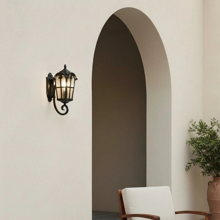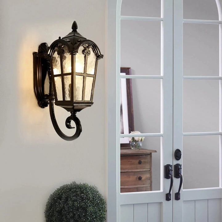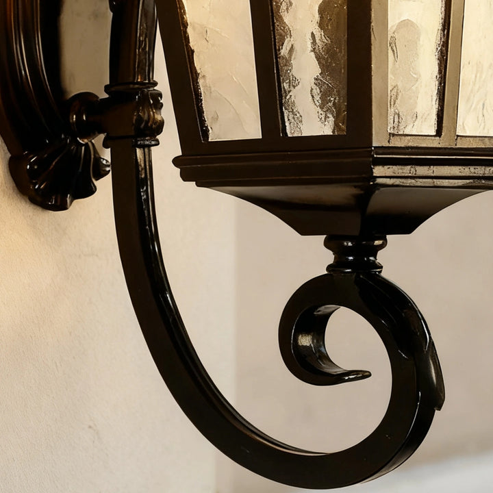 Cette lampe murale est en aluminium et en verre, et son design rétro de chandelier convient pour une installation dans les entrées, terrasses et porches.