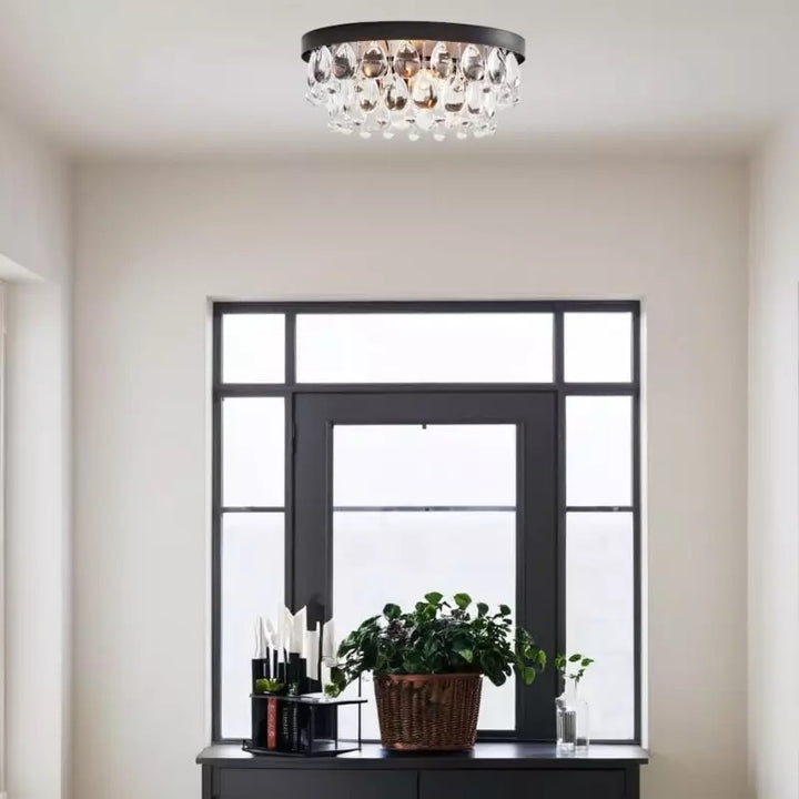 Cette lampe de plafond encastrée est faite de cristaux en forme de gouttes de pluie. Elle convient pour une utilisation dans les chambres, les salons et les salles à manger.