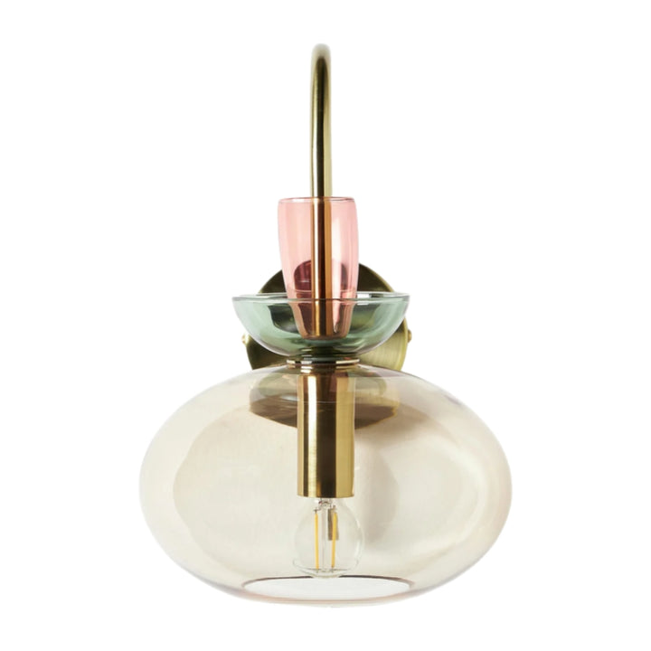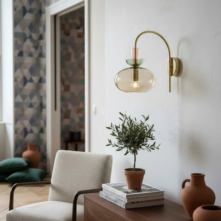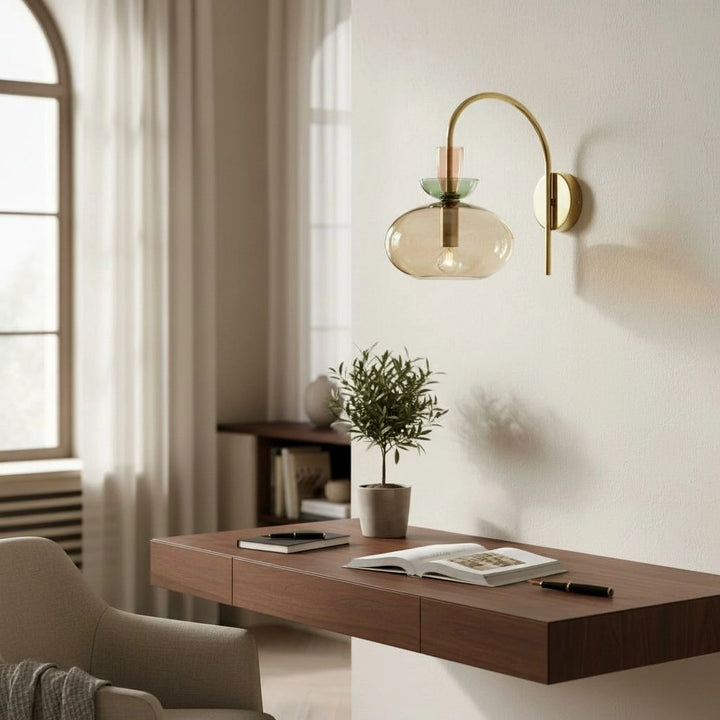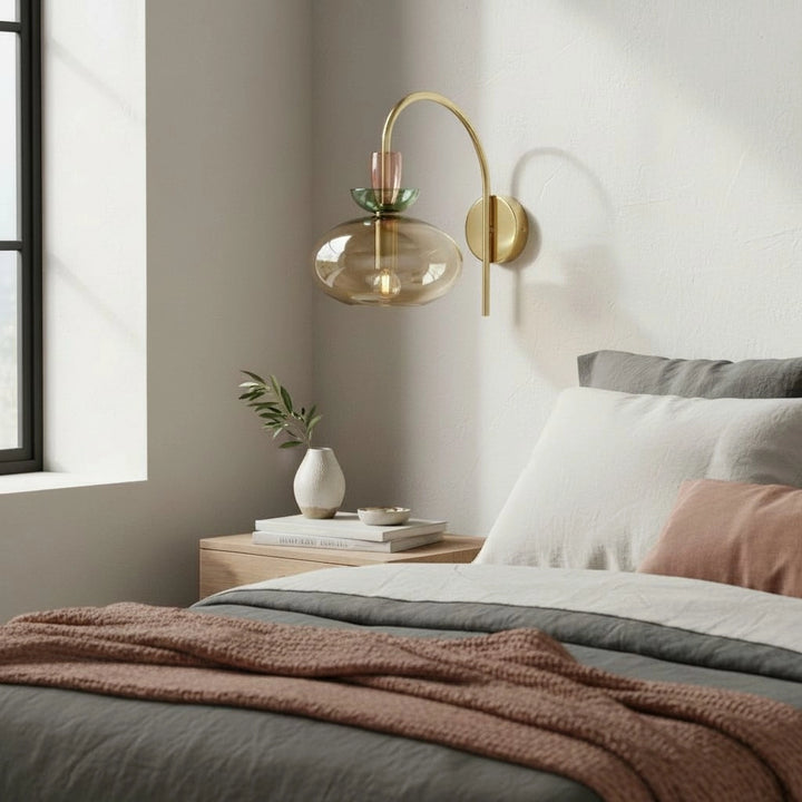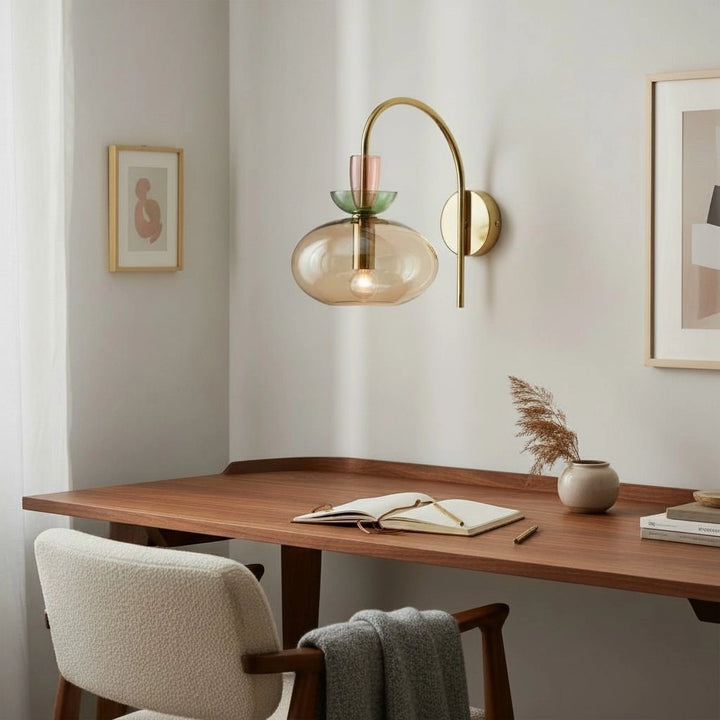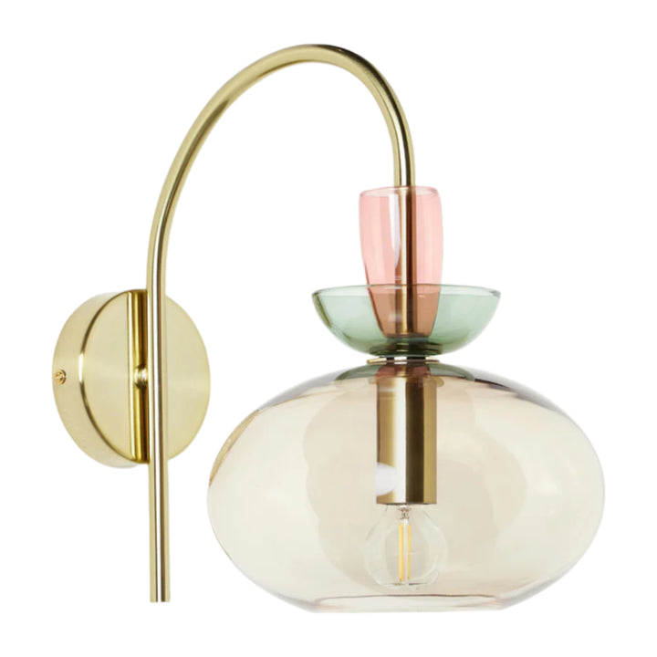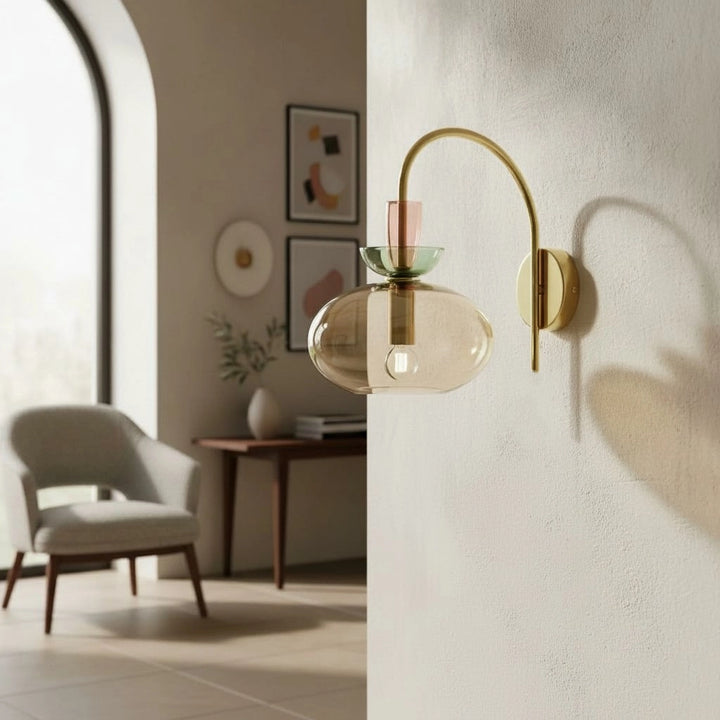 L'applique murale associe un bras en laiton courbé à un verre teinté en couches pour une lumière douce et diffuse. Sa silhouette élégante et moderne ajoute une touche d'élégance ludique aux chambres ou aux espaces de vie.