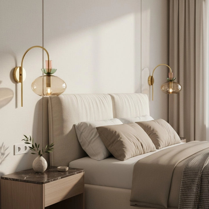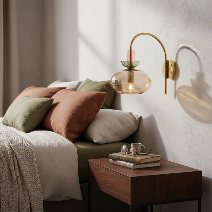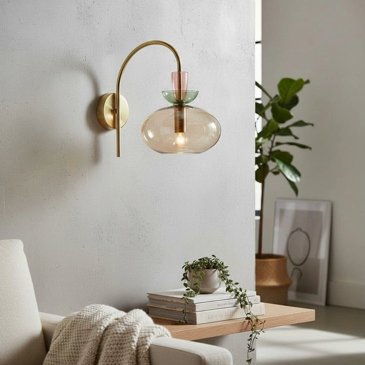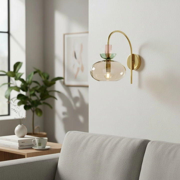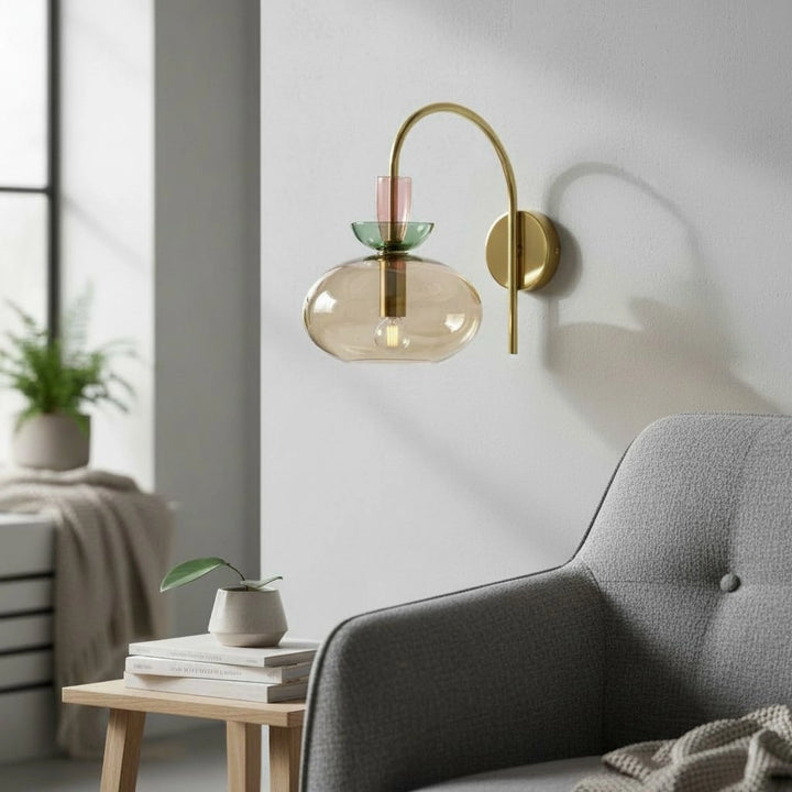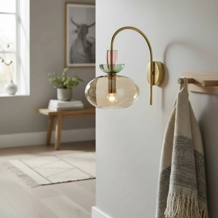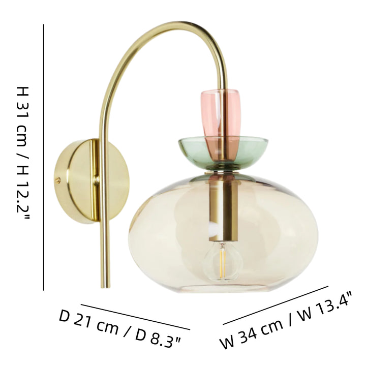 L'applique murale associe un bras en laiton courbé à un verre teinté en couches pour une lumière douce et diffuse. Sa silhouette élégante et moderne ajoute une touche d'élégance ludique aux chambres ou aux espaces de vie.