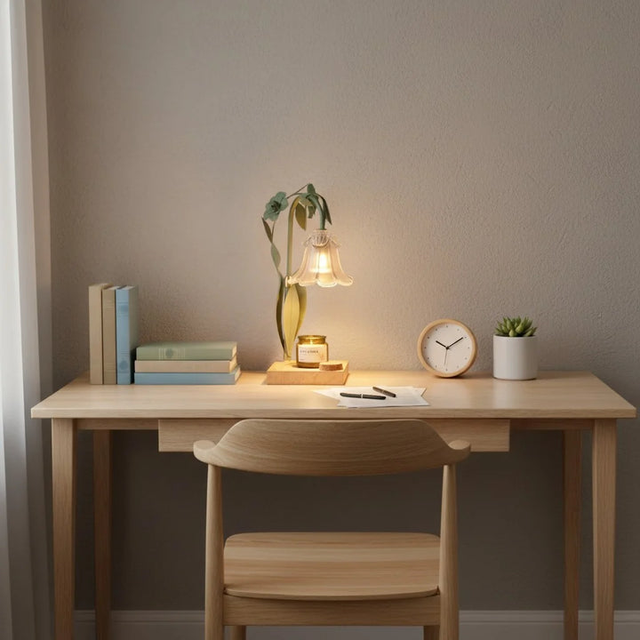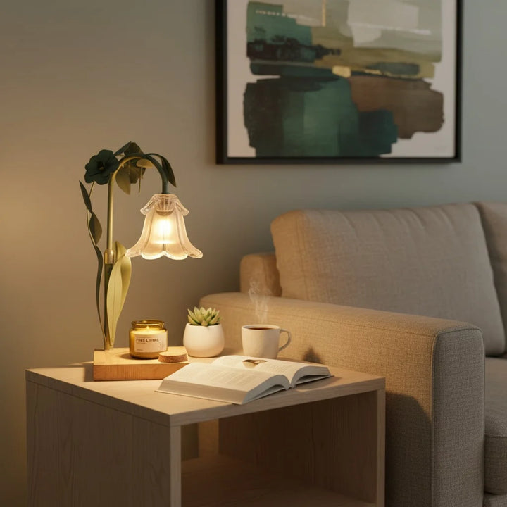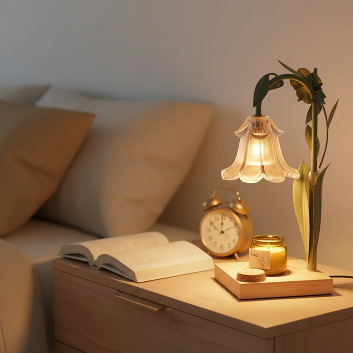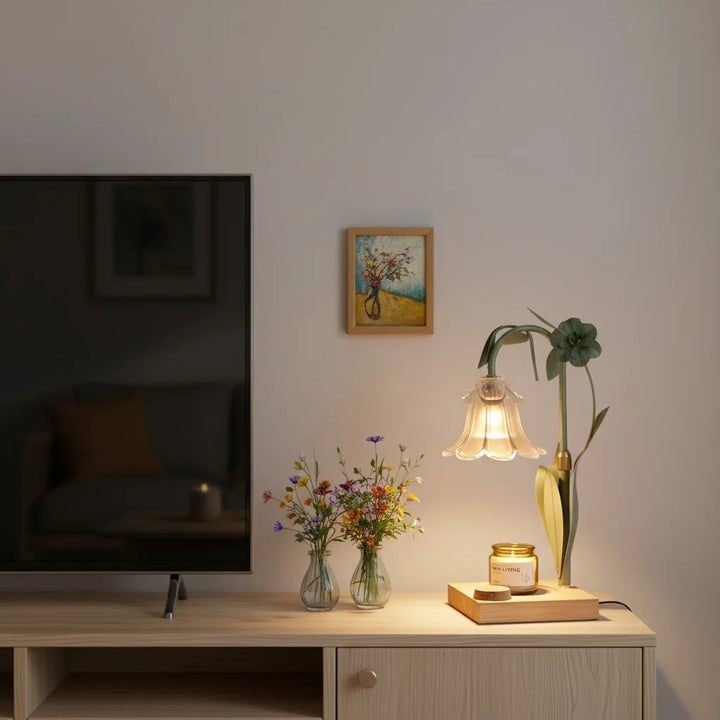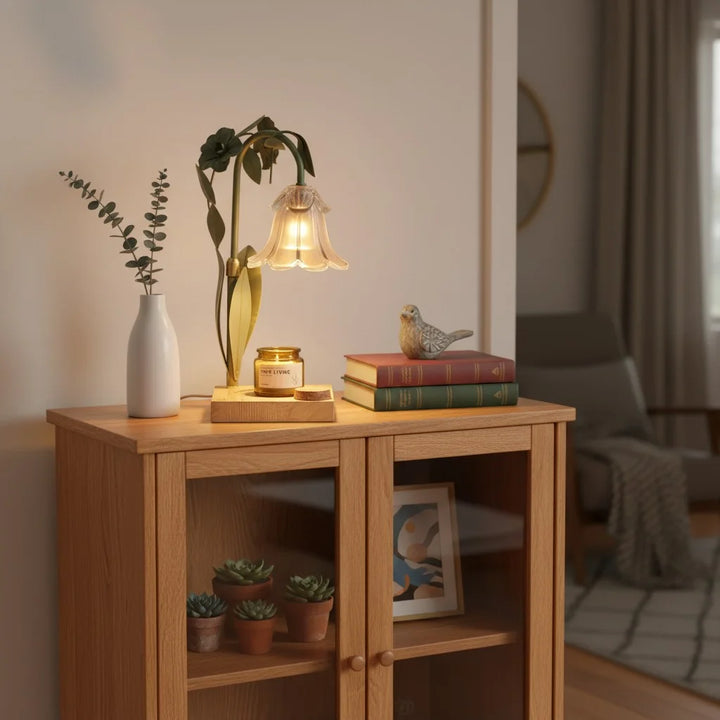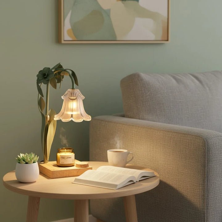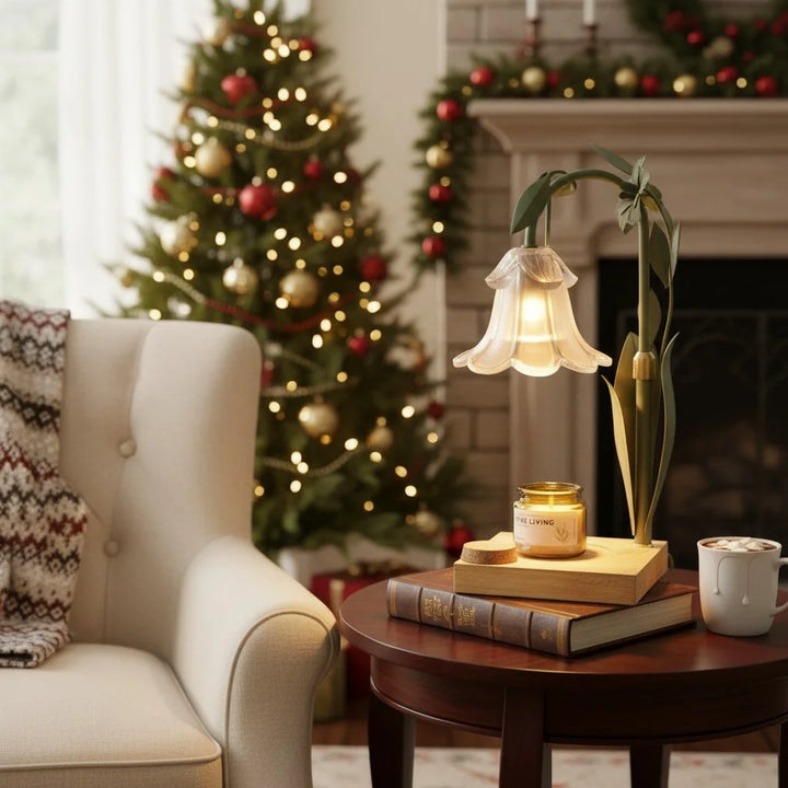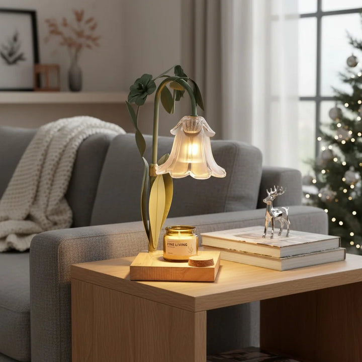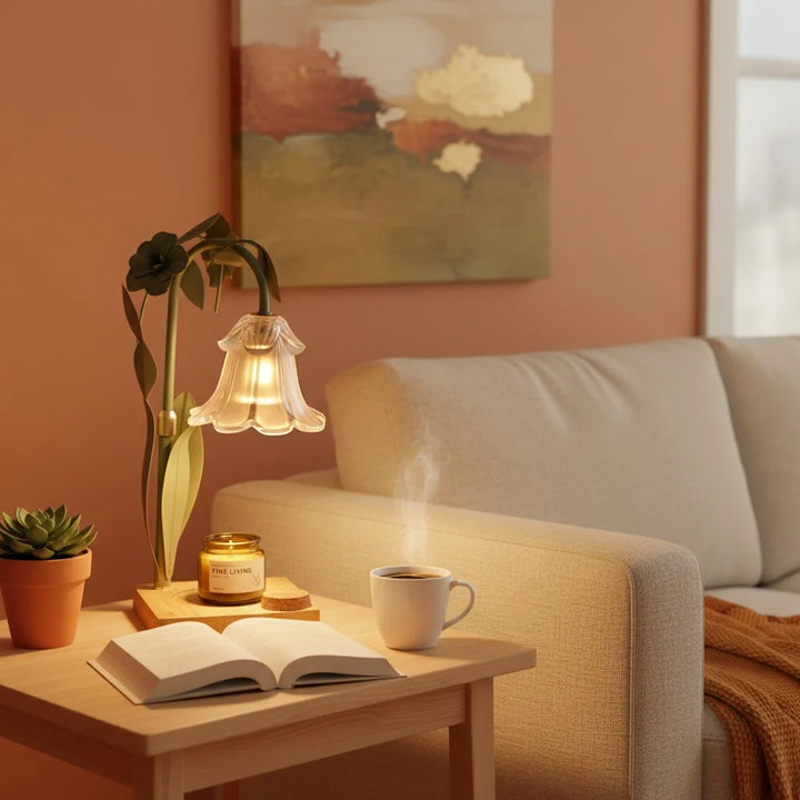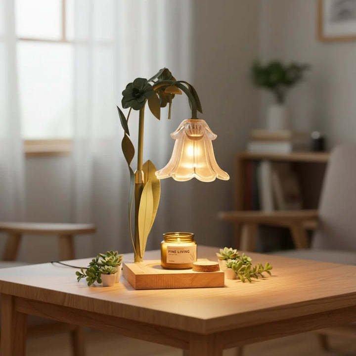 Elegante nella sua forma floreale, questa lampada senza fiamma diffonde la fragranza delle candele. La base rustica in legno e il paralume morbido la rendono un'ottima scelta per l'uso quotidiano o per occasioni speciali come Natale e San Valentino