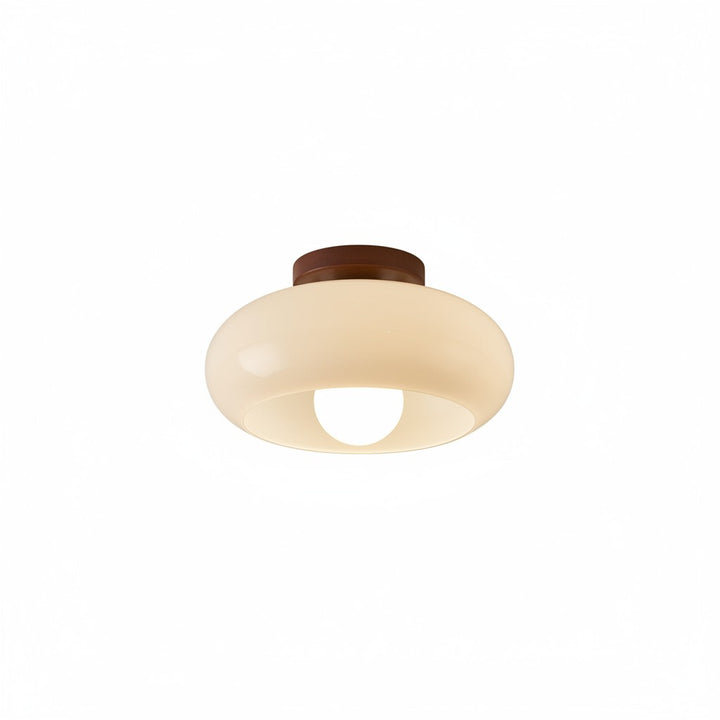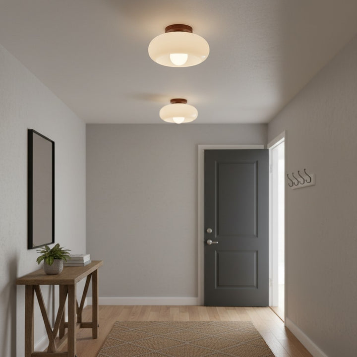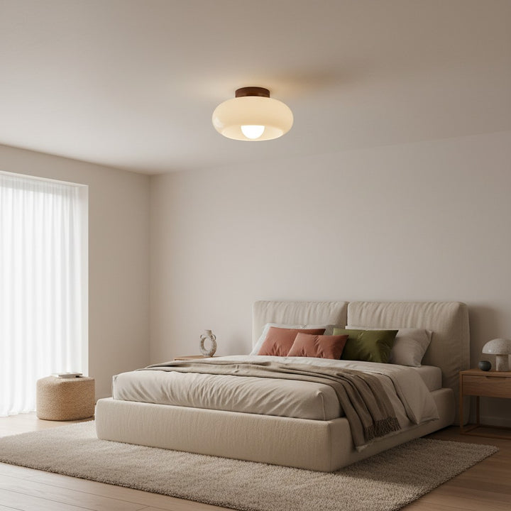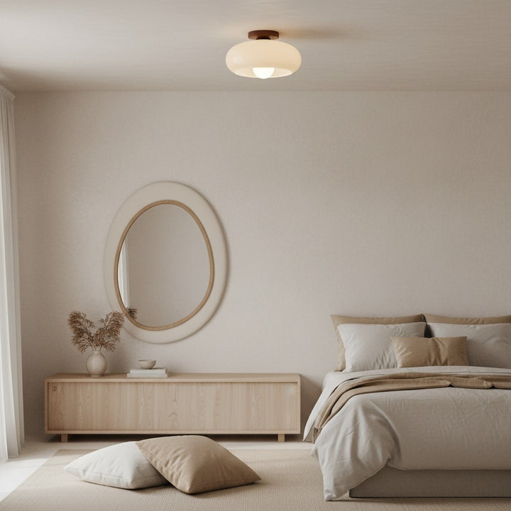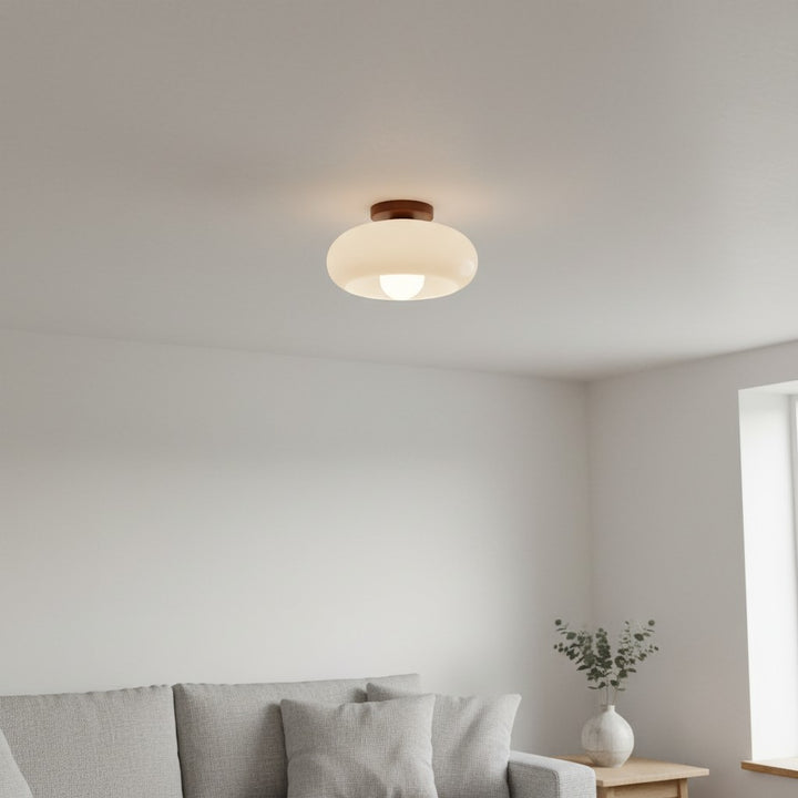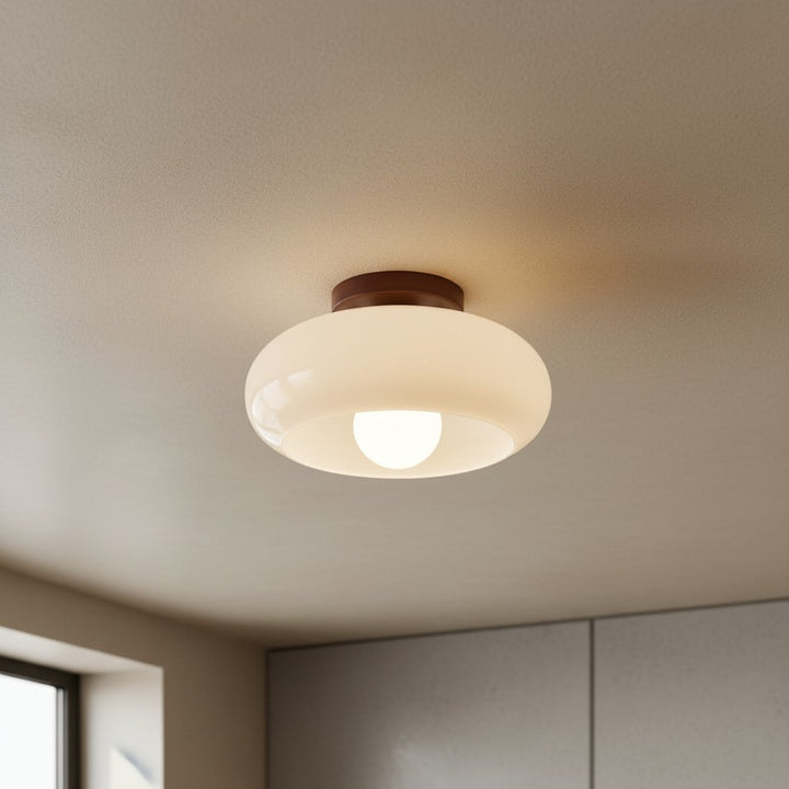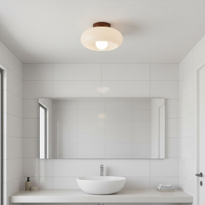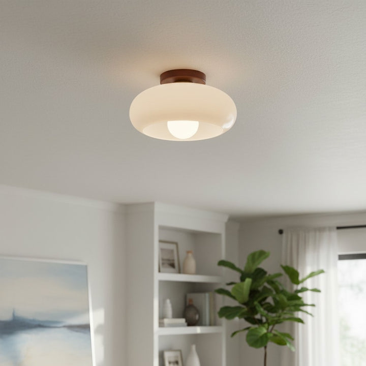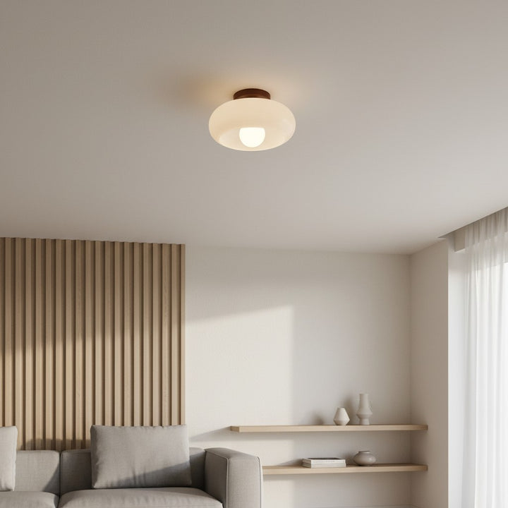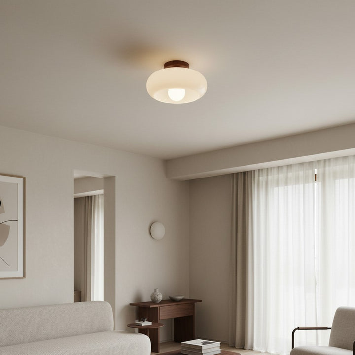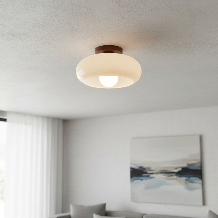Questa lampada da soffitto francese Bauhaus color crema, realizzata con un paralume in vetro, corpo in metallo e base in noce, emana un'eleganza sobria e una luce soffusa, integrandosi facilmente sia negli stili di design d'interni classici che moderni
