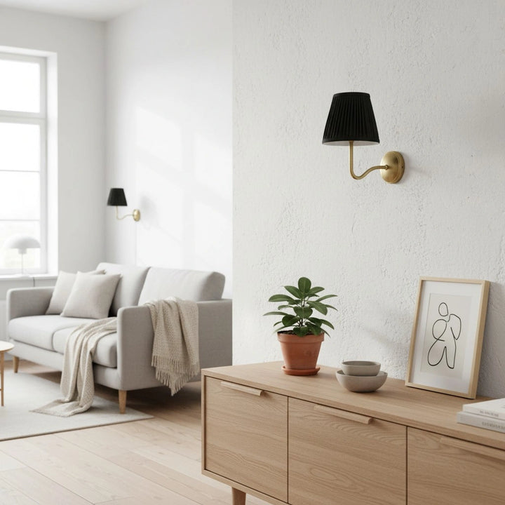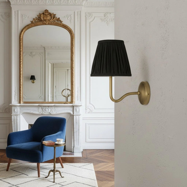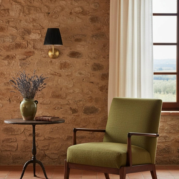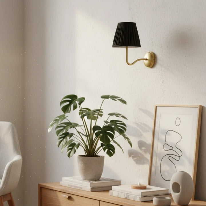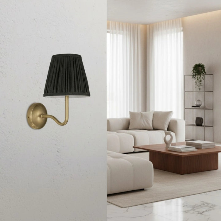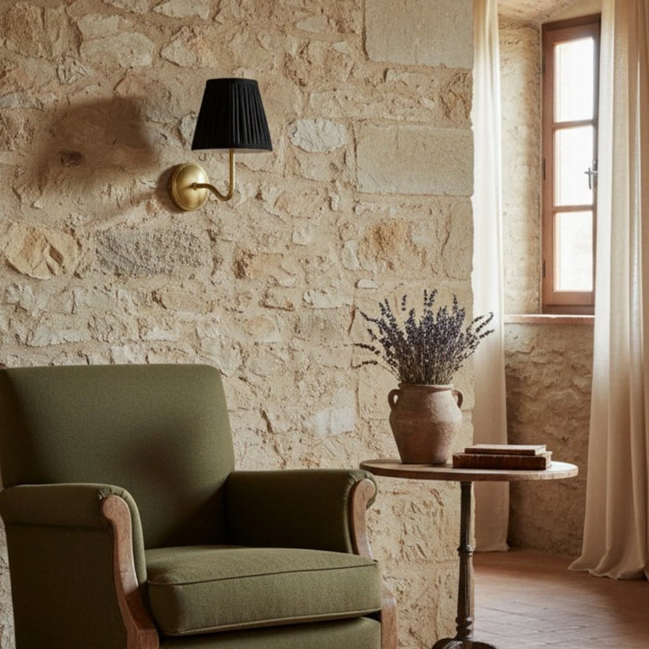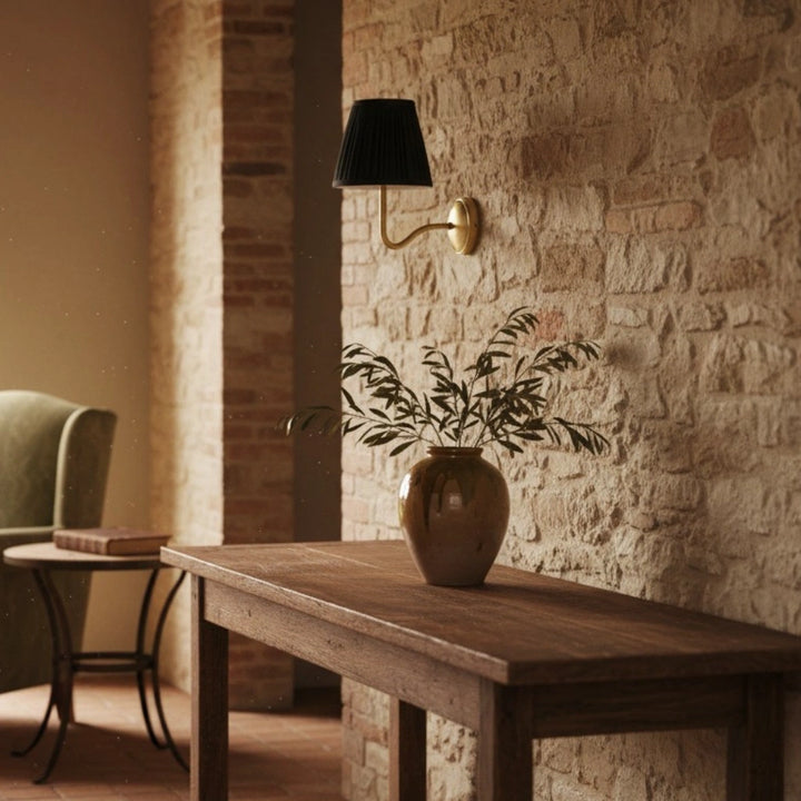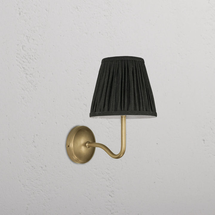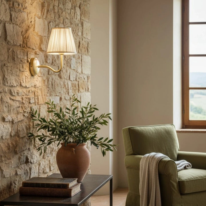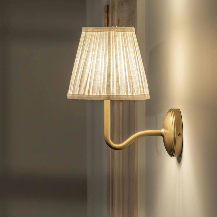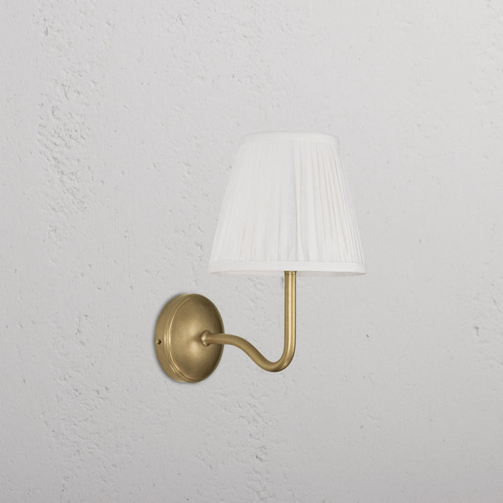 Deze wandlamp heeft een geplooide lampenkap gemaakt van een linnen- en katoenmengsel, gecombineerd met een bronzen lampframe. Hij kan overal worden geïnstalleerd en voegt een vleugje textuur en vintage charme toe aan je interieur.