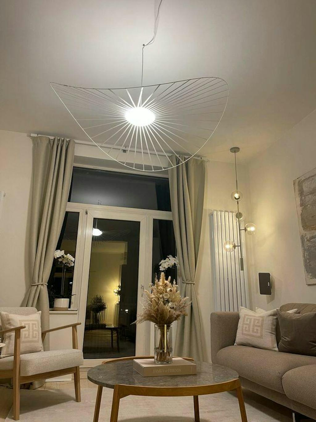 Zaklasyfikowana do bardzo dużych żyrandoli, nasza lampa wisząca jest zaskakująco lekka, co pozwala jej delikatnie tańczyć na wietrze.
