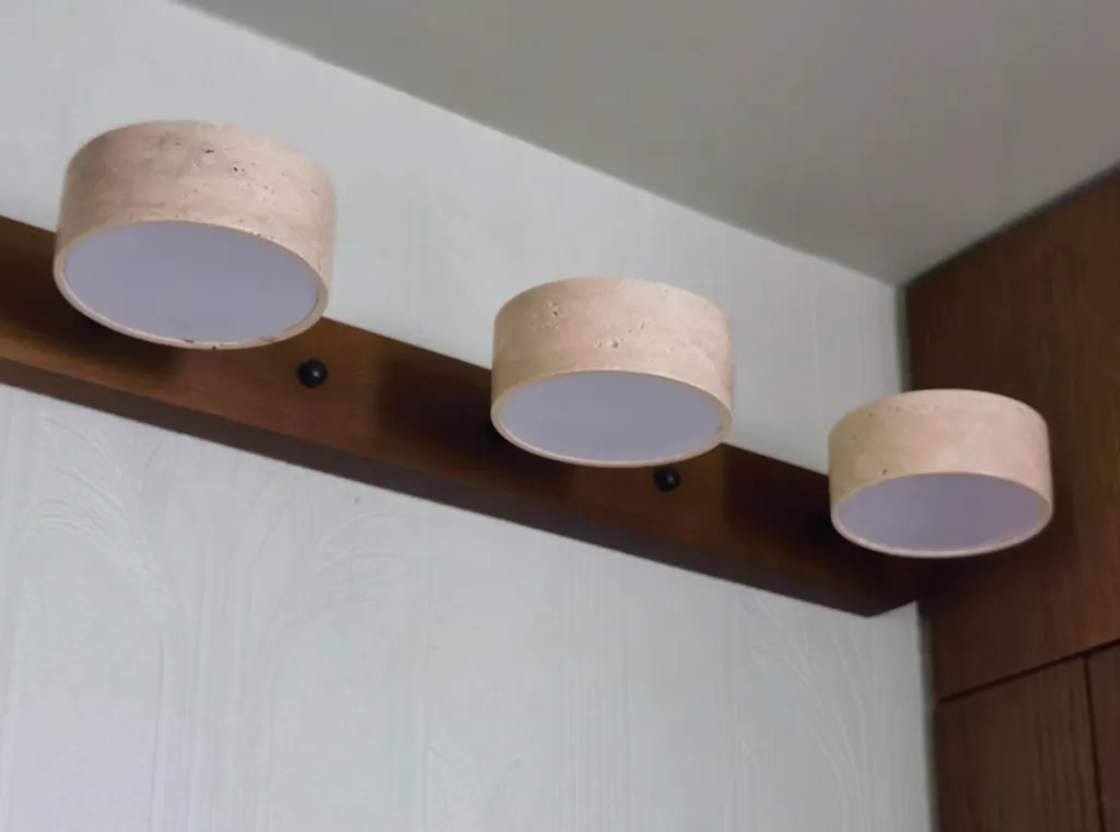 Wykonany z naturalnego trawertynu i drewna, ten kinkiet ucieleśnia ciepły, uspokajający minimalizm Japandi, łącząc tekstury z ziemistymi tonami dla spokojnej elegancji.