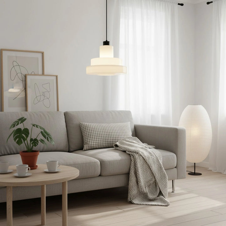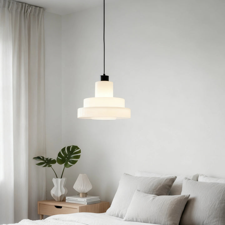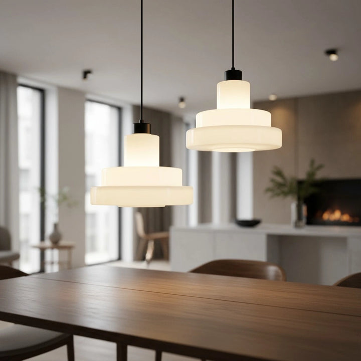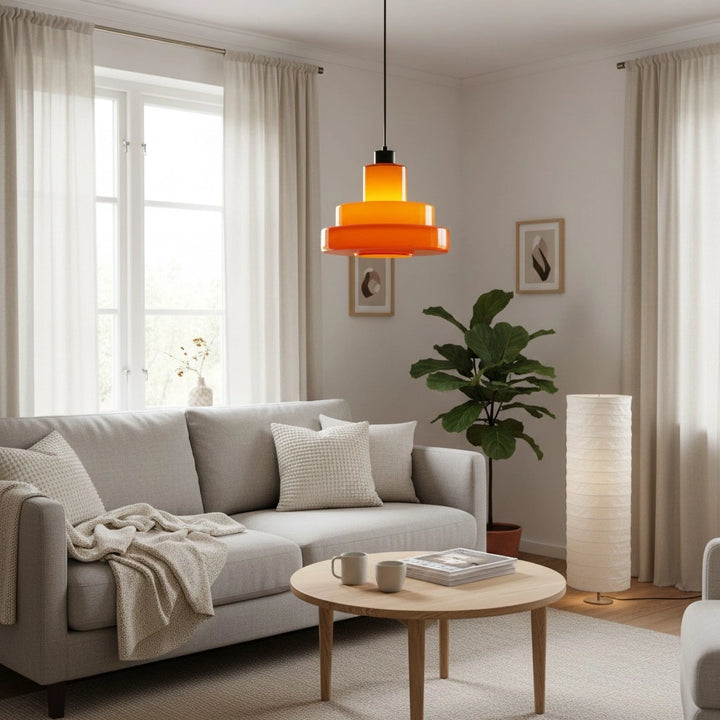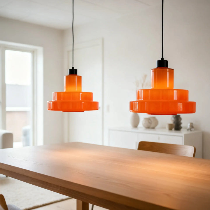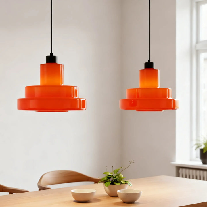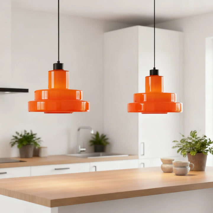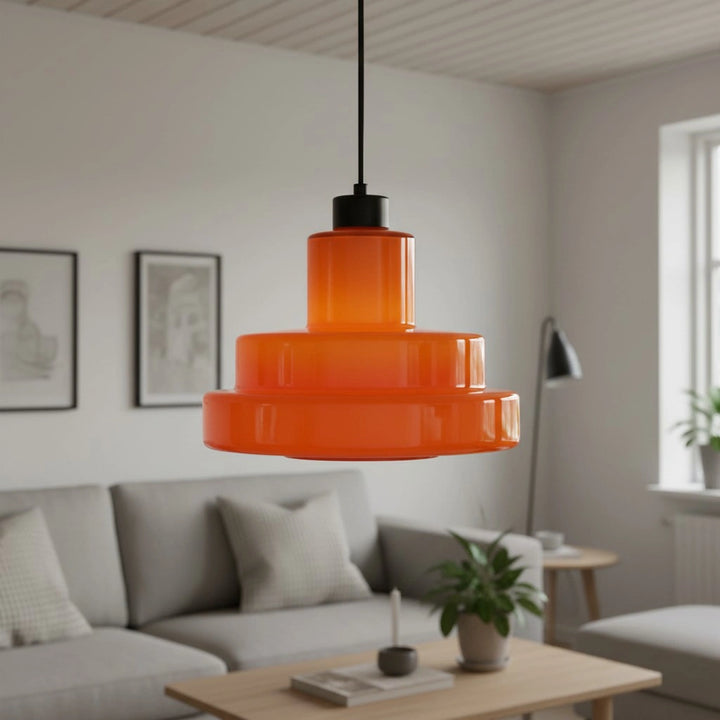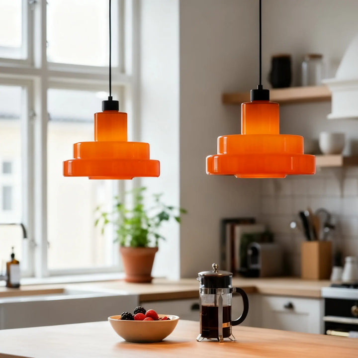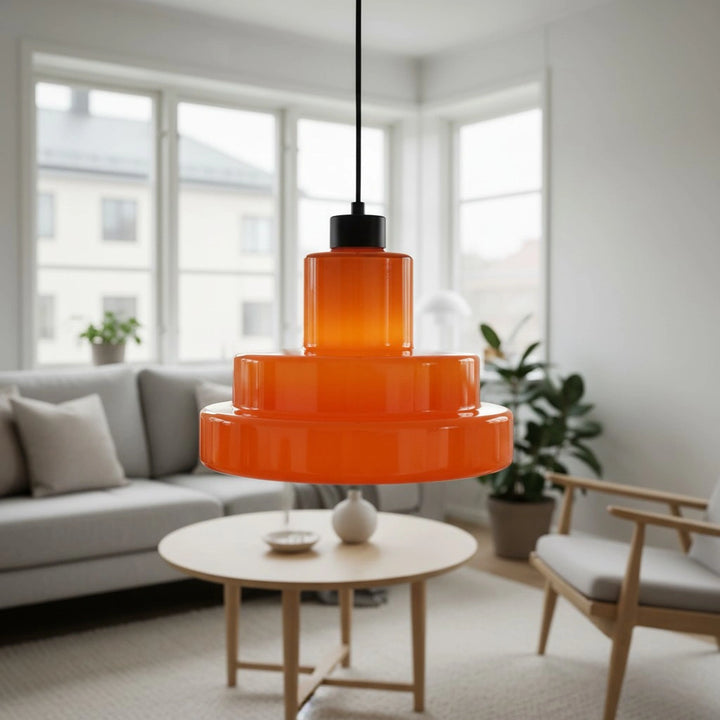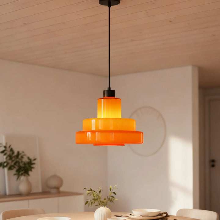 This pendant light is made of orange or white glass, featuring a multi-tiered cake-like design that is vibrant and eye-catching. It is suitable for installation in the kitchen, living room, and dining room.