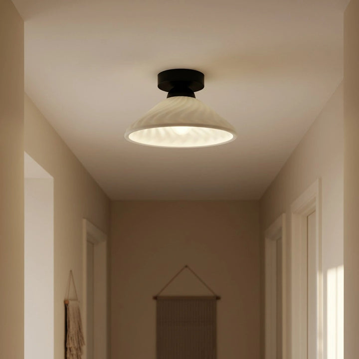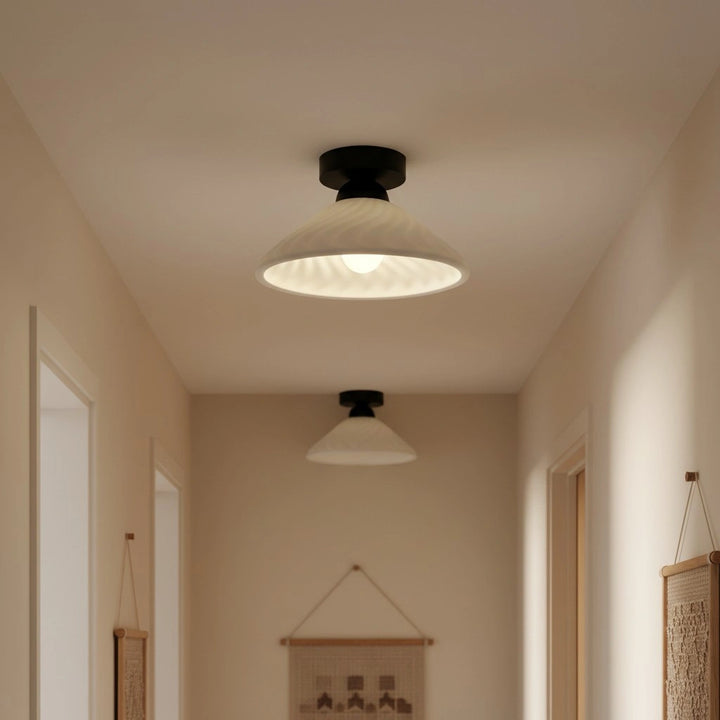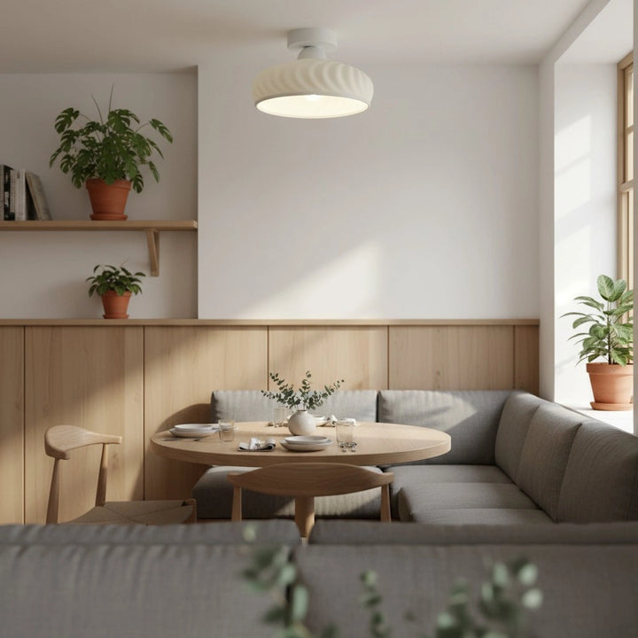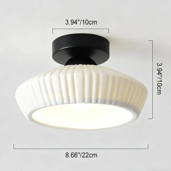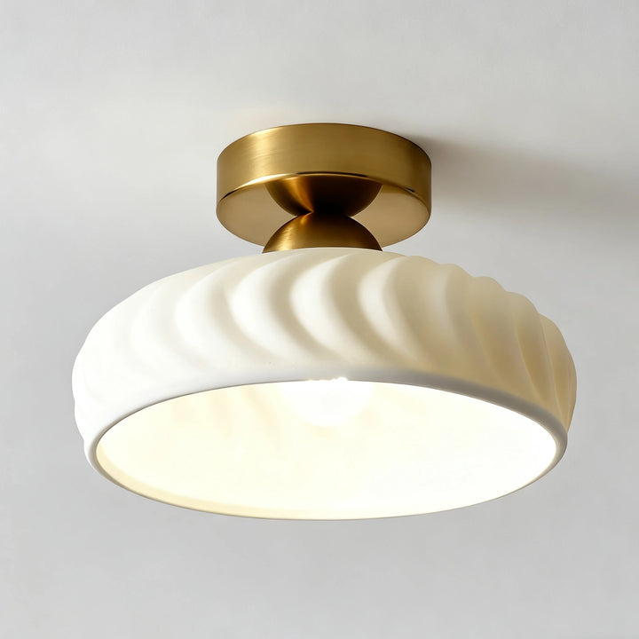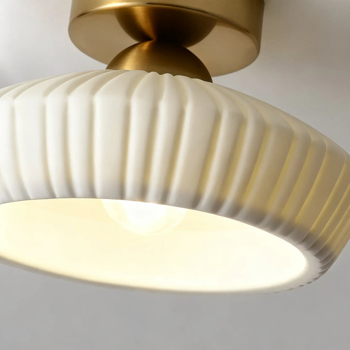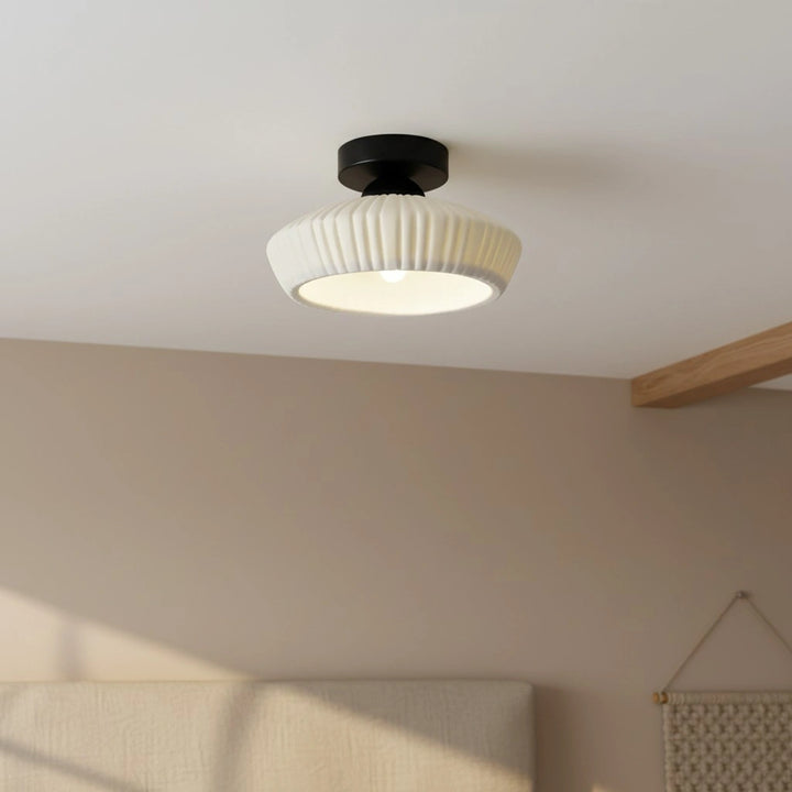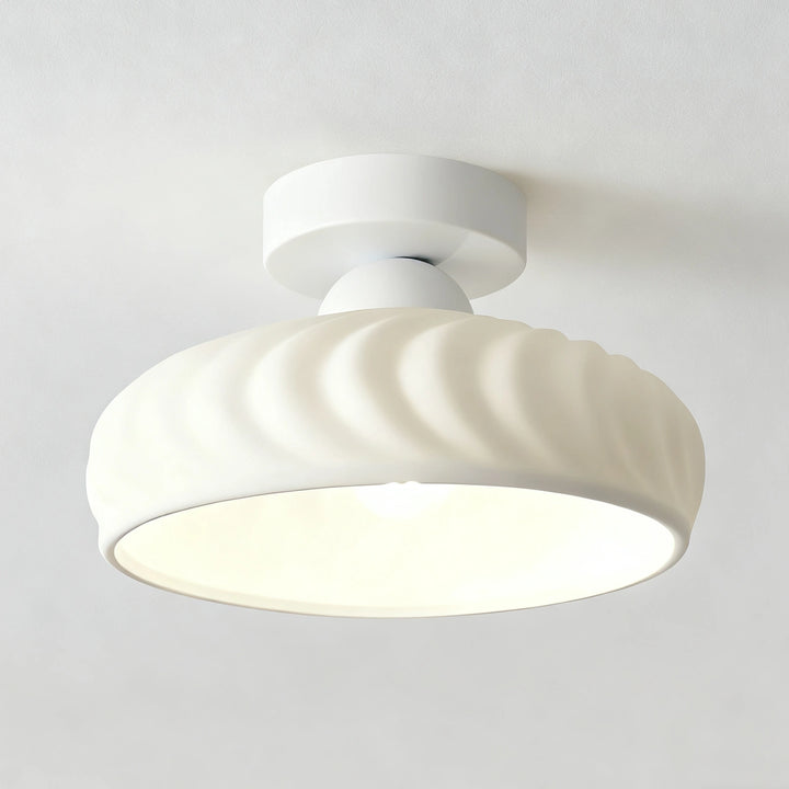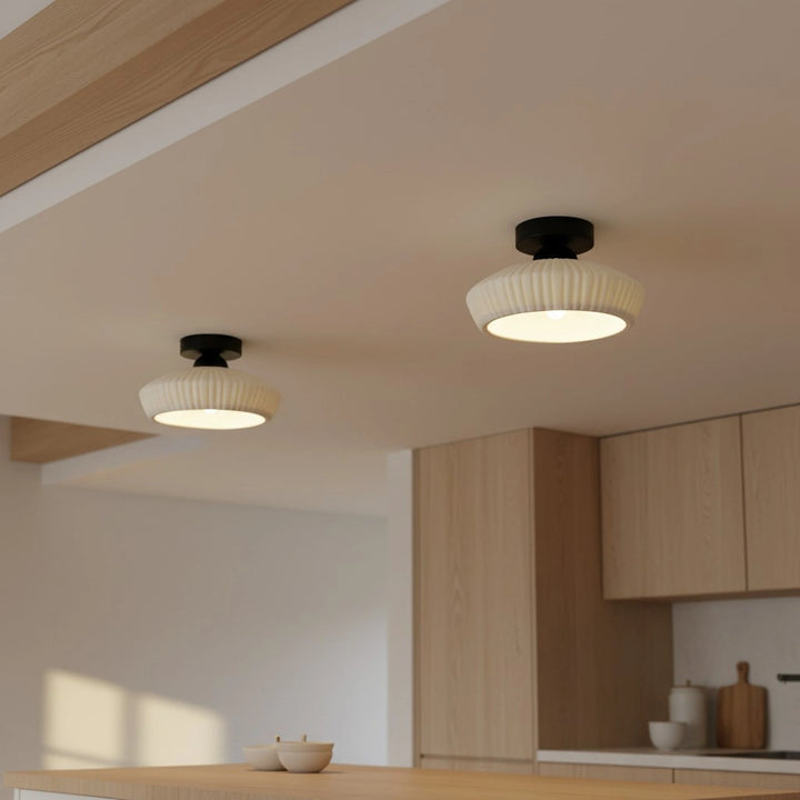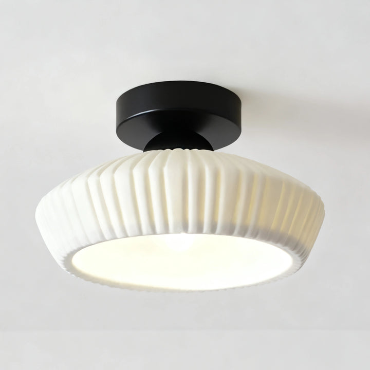 This semi-recessed ceiling light features a modern, minimalist design and a ceramic lampshade available in a variety of unique textures to suit different styling needs.