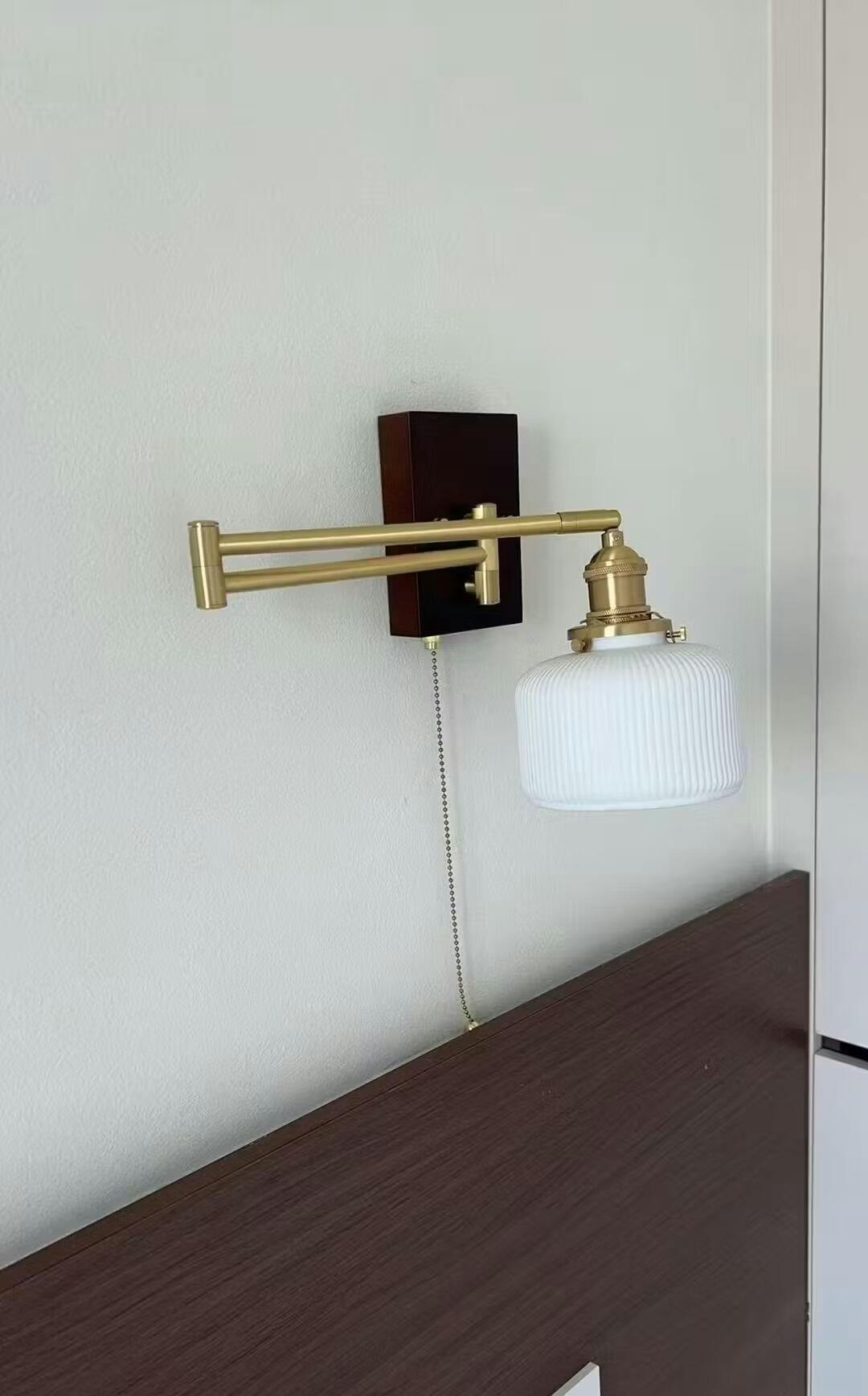 Elevate any room with this timeless wall lamp. A warm metal arm and walnut wood base pair beautifully with the ribbed white ceramic shade, ideal for bedrooms, living rooms, or reading nooks.