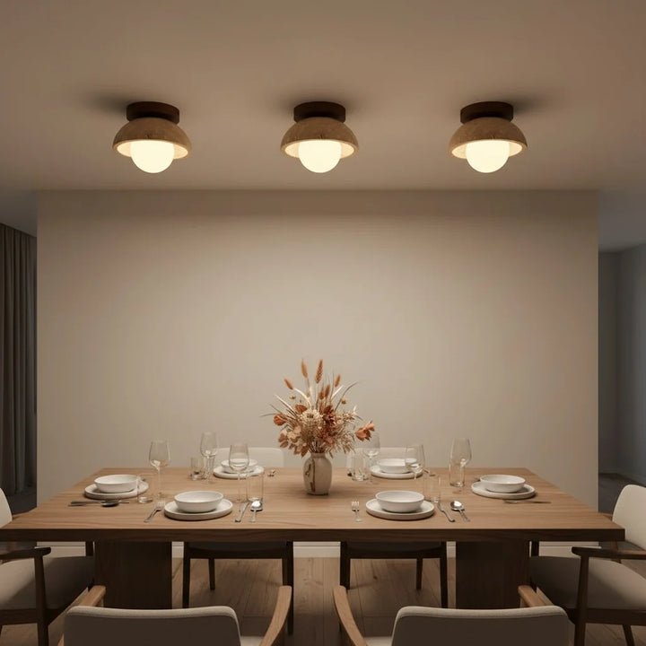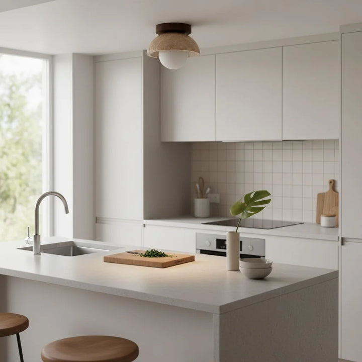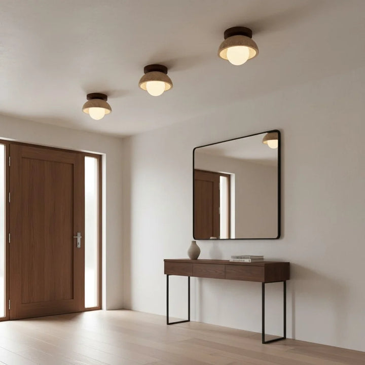 This travertine ceiling light is crafted from travertine with subtle pits and textures, making each lamp unique. Suitable for bedrooms, living rooms, kitchen islands, hallways, entryways, and more, it embodies the wabi-sabi aesthetic