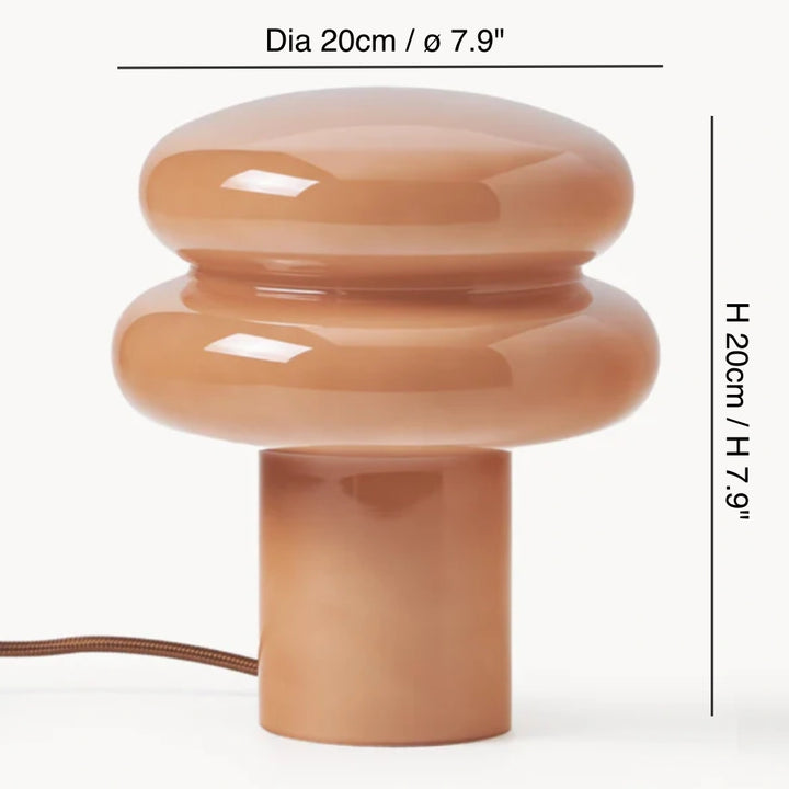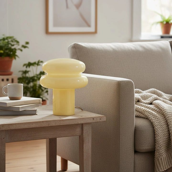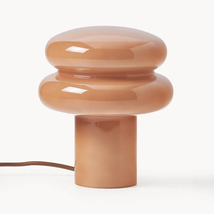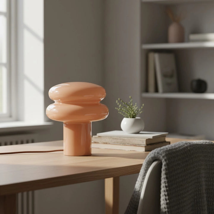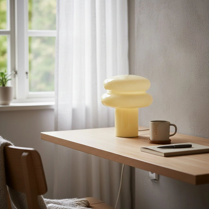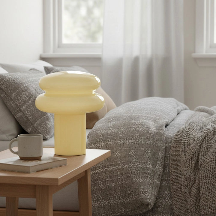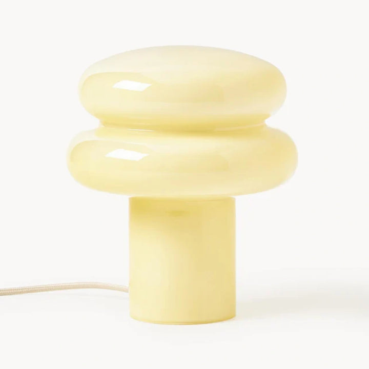 This Bauhaus-style table lamp features an adorable mushroom shape, is made of opal glass with a smooth, rounded surface, and is available in two colors.