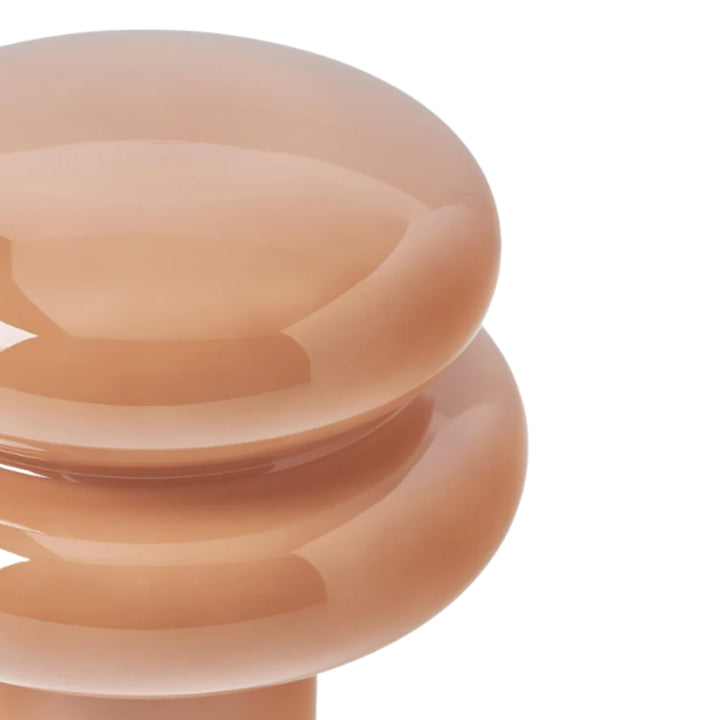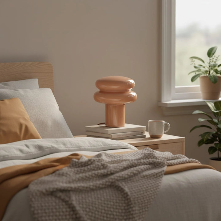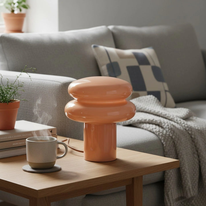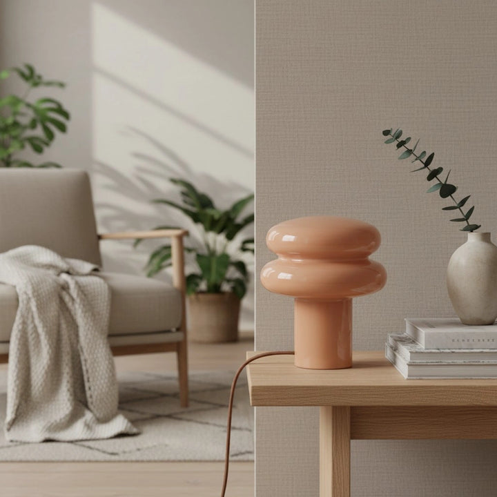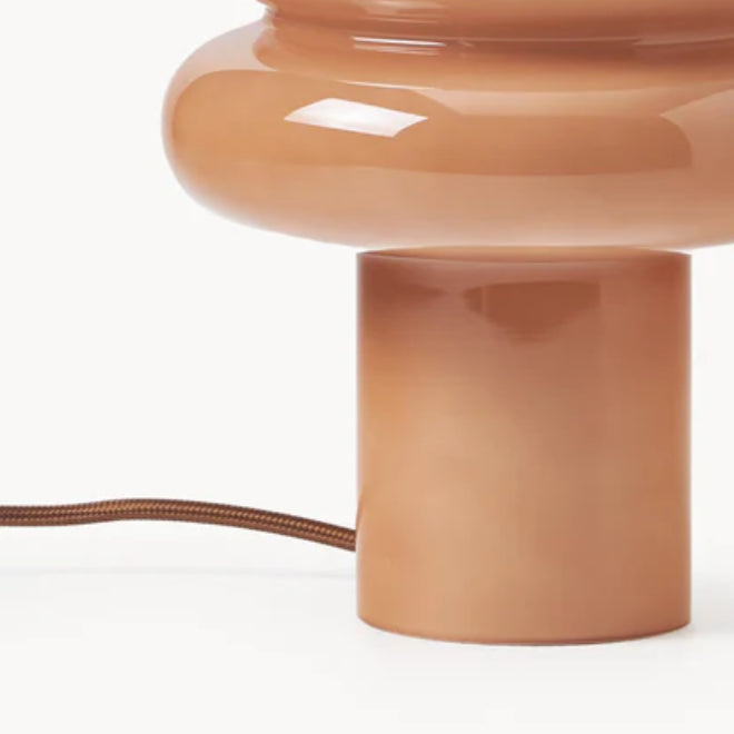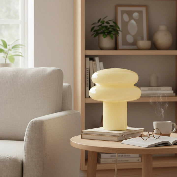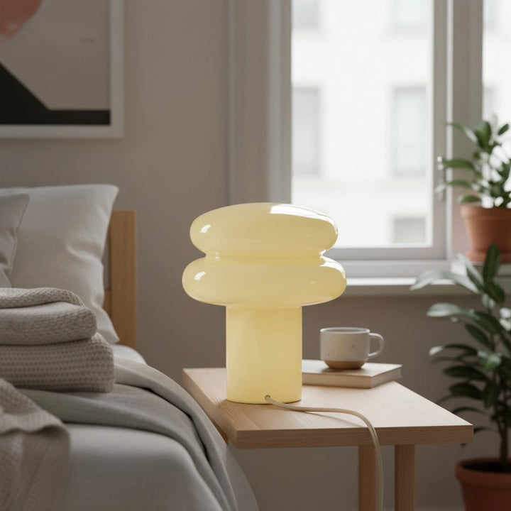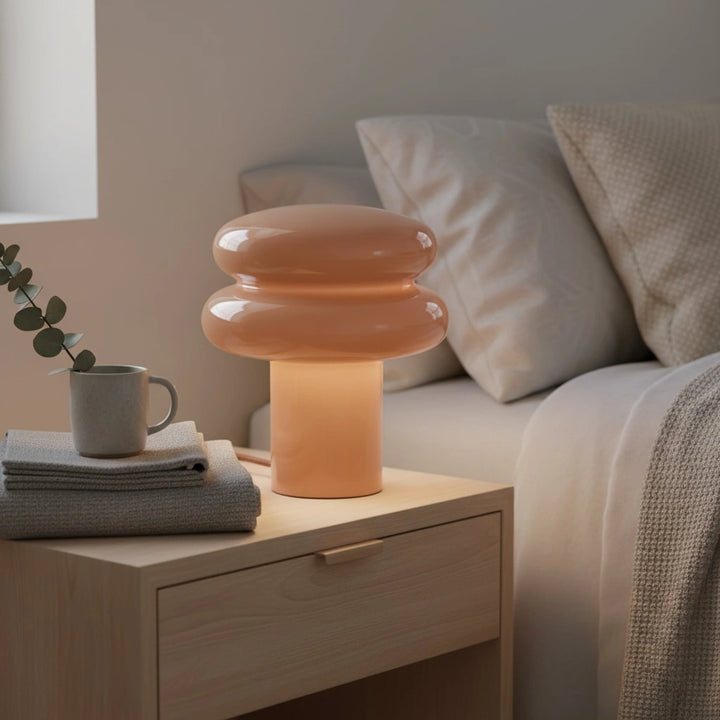 This Bauhaus-style table lamp features an adorable mushroom shape, is made of opal glass with a smooth, rounded surface, and is available in two colors.