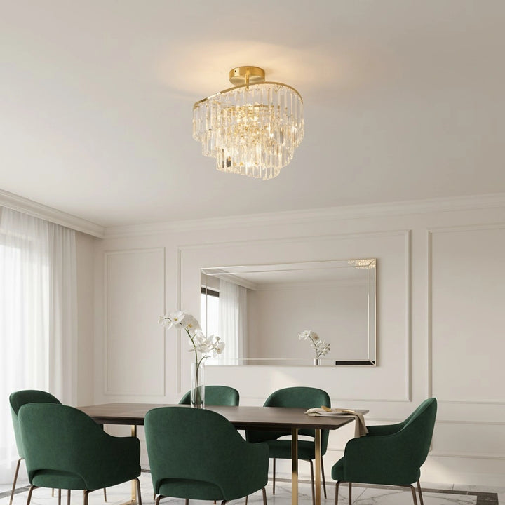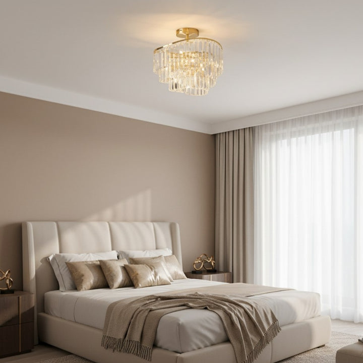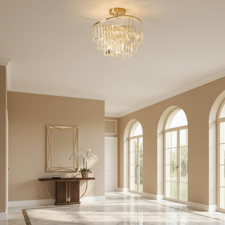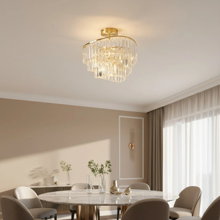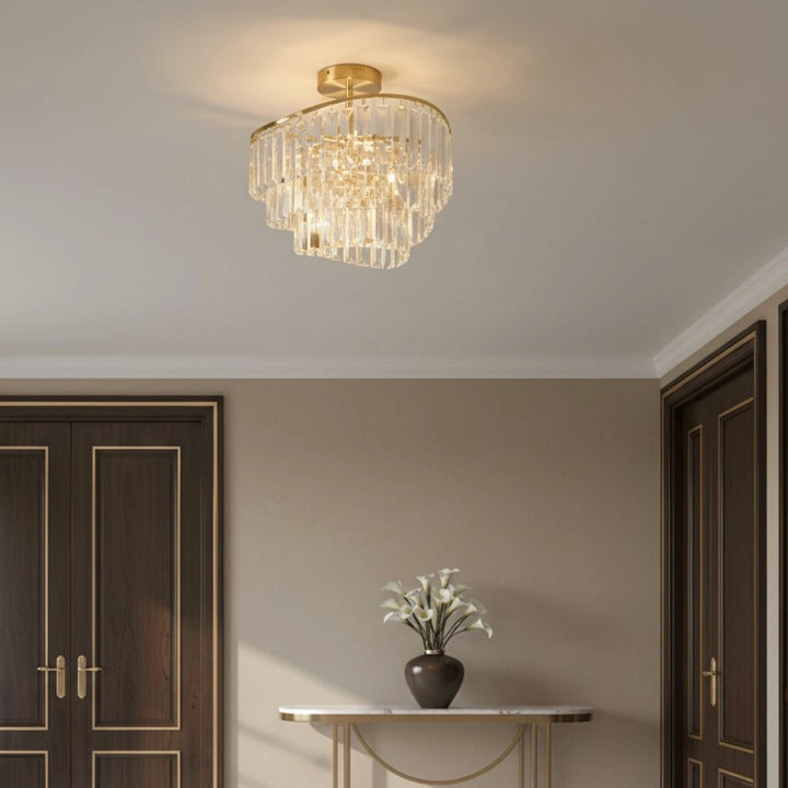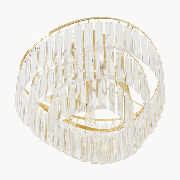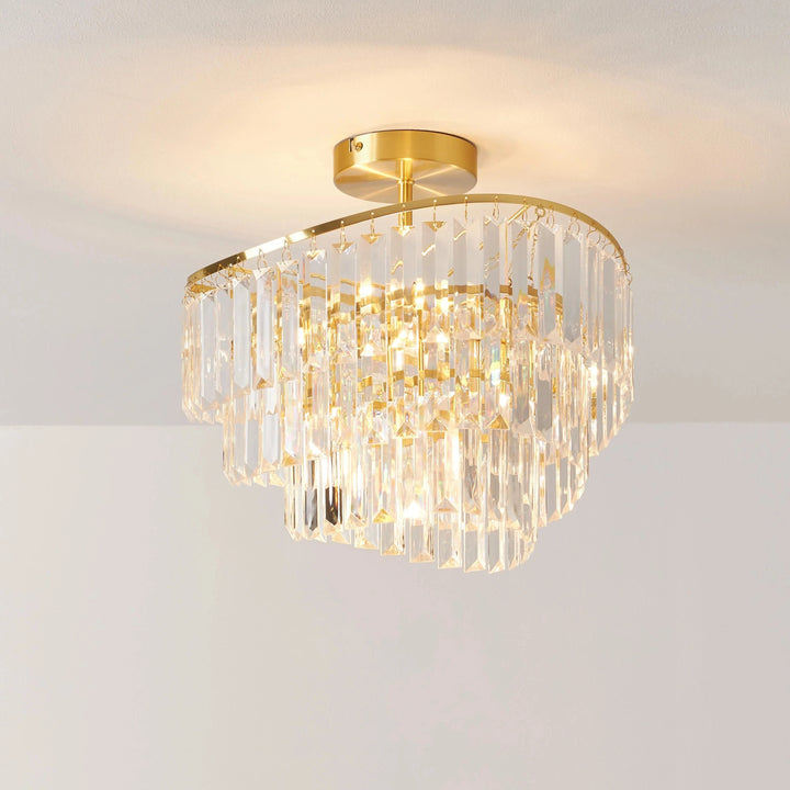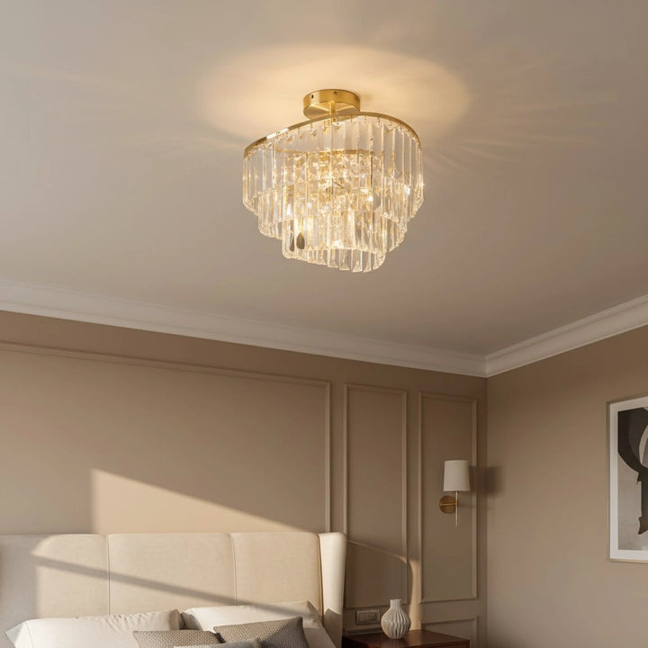 This ceiling light features multiple layers of precision-cut crystal prisms suspended above a polished gold metal frame. The stacked crystal elements reflect and refract light, creating a dazzling ambient halo.