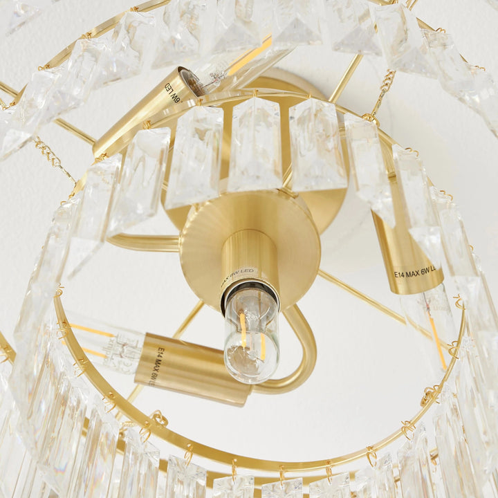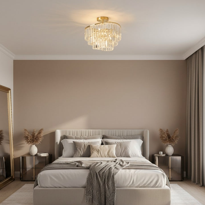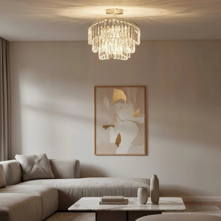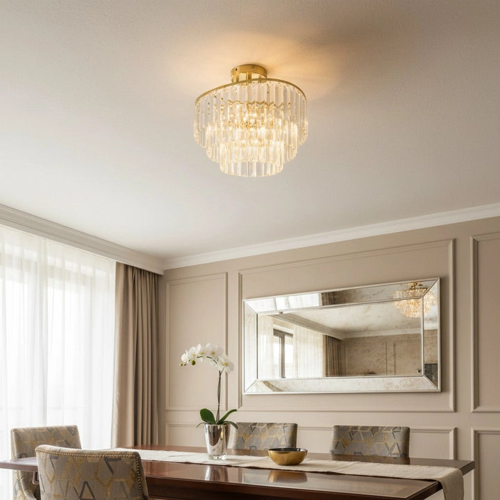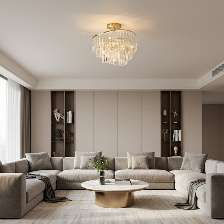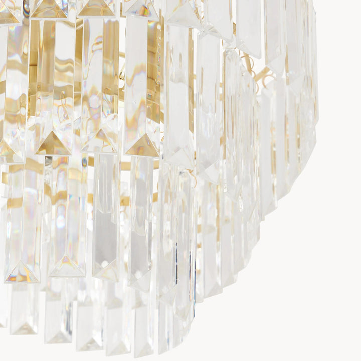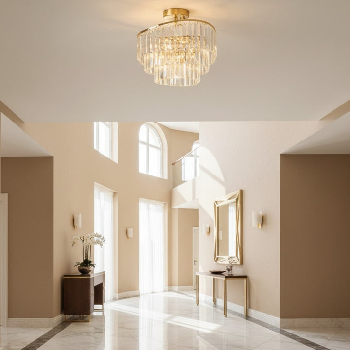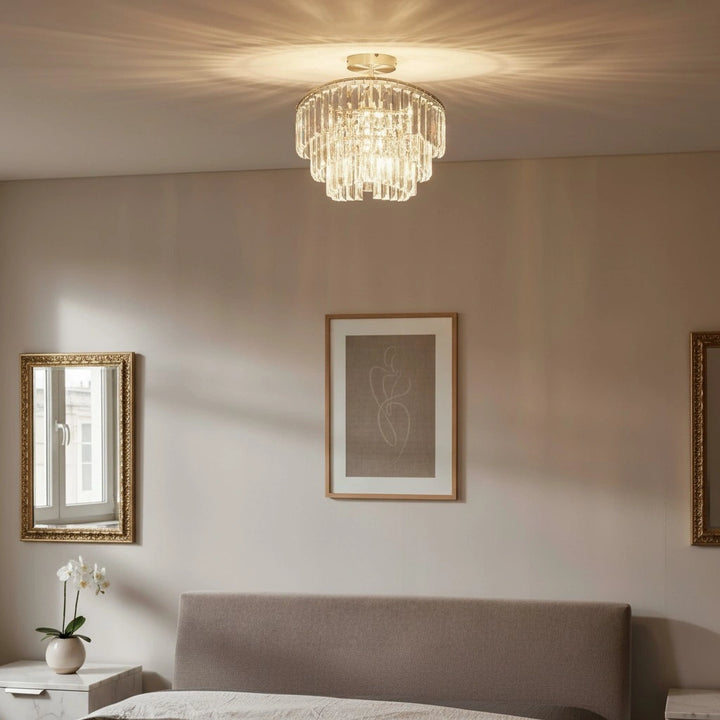 This ceiling light features multiple layers of precision-cut crystal prisms suspended above a polished gold metal frame. The stacked crystal elements reflect and refract light, creating a dazzling ambient halo.