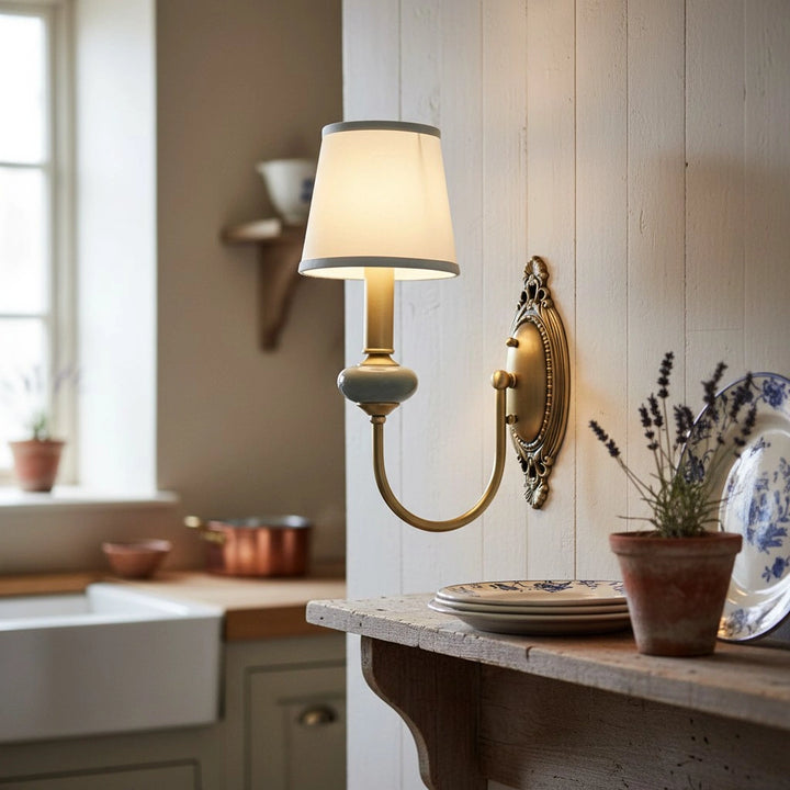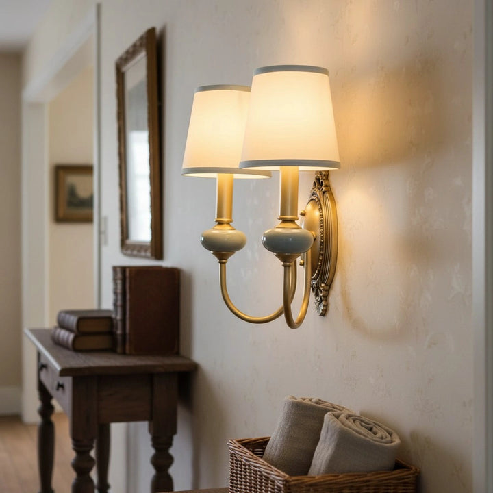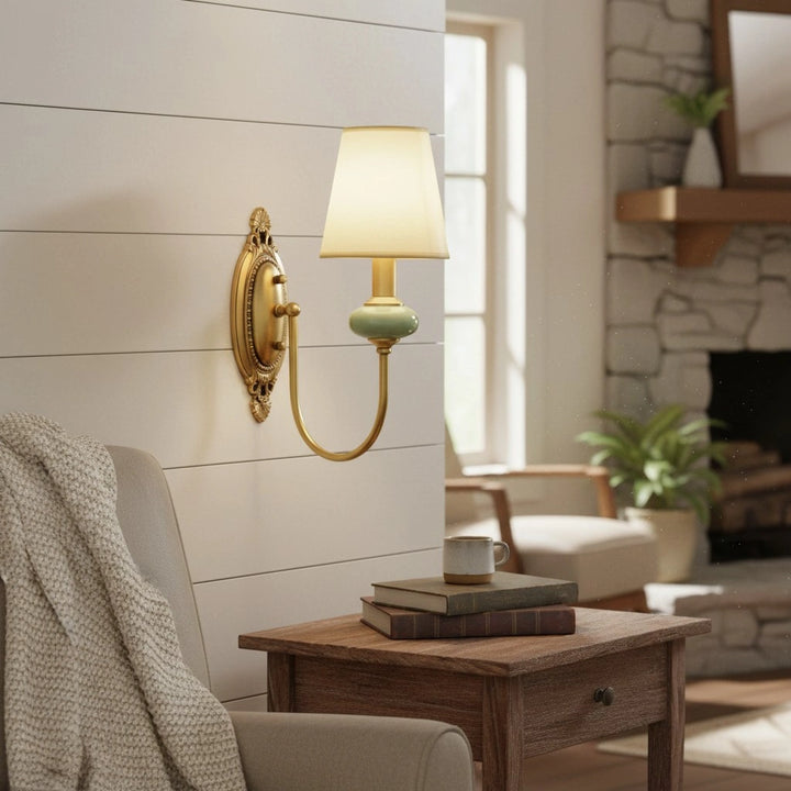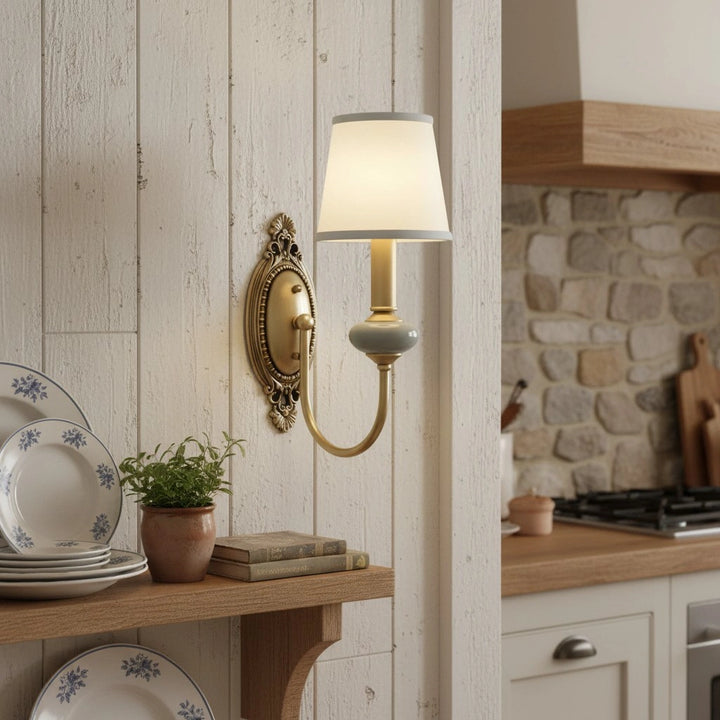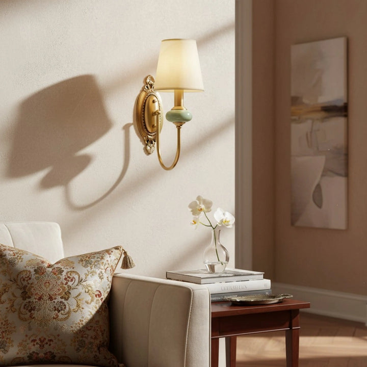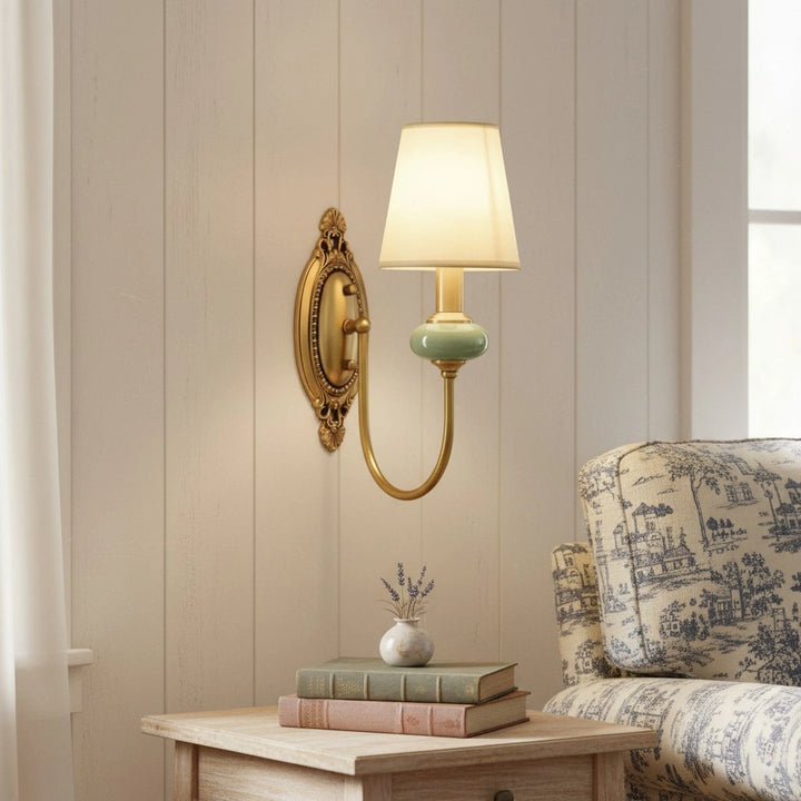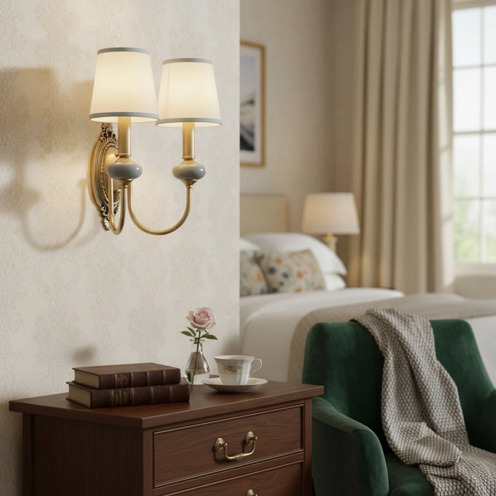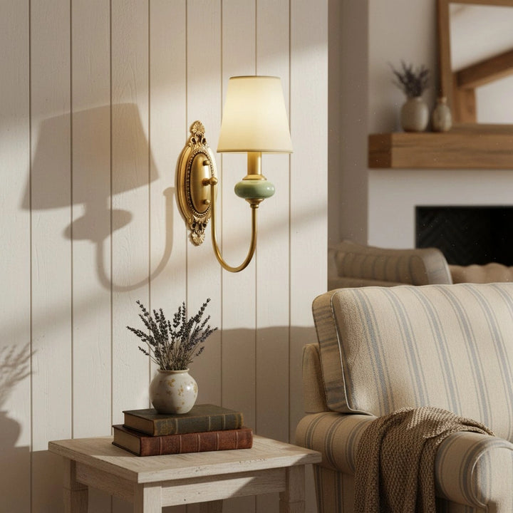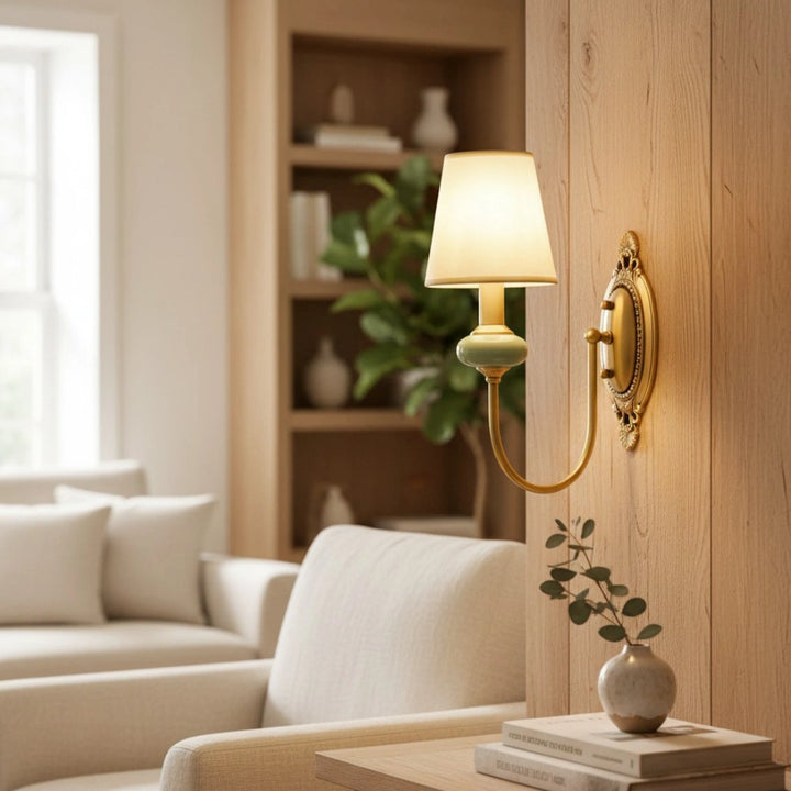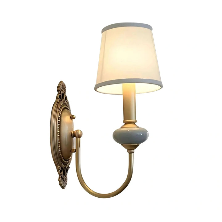 This retro wall lamp features an elegant curved metal arm and delicate ceramic accents, paired with a soft fabric lampshade, making it both classic and elegant.