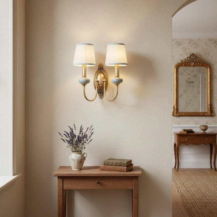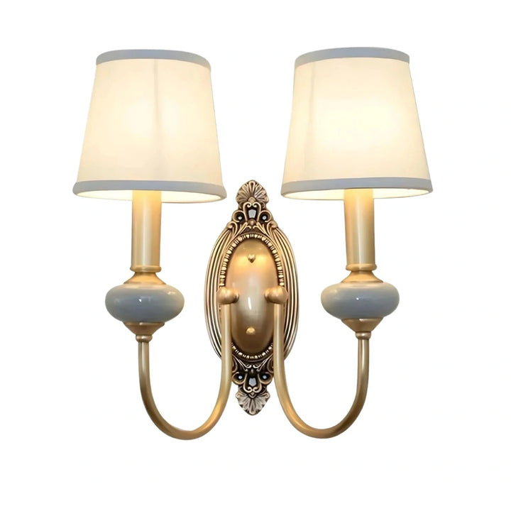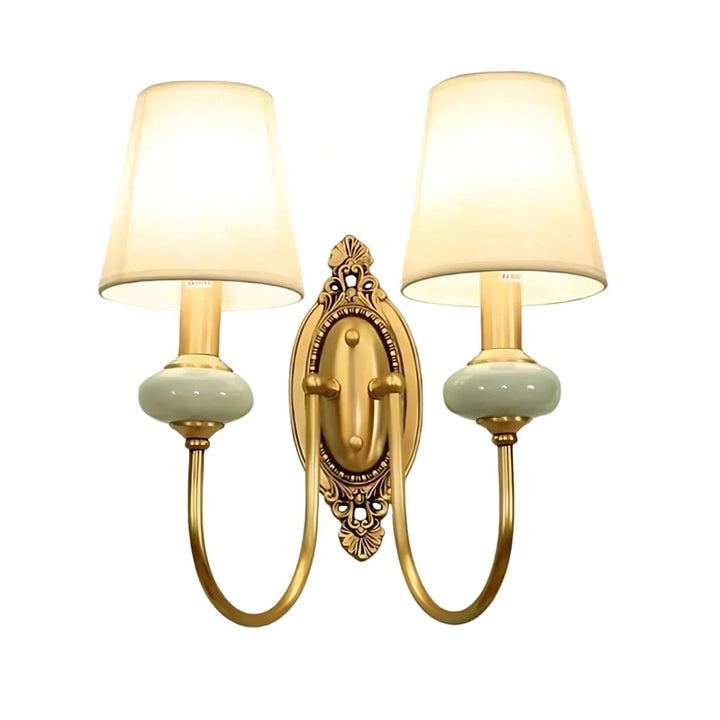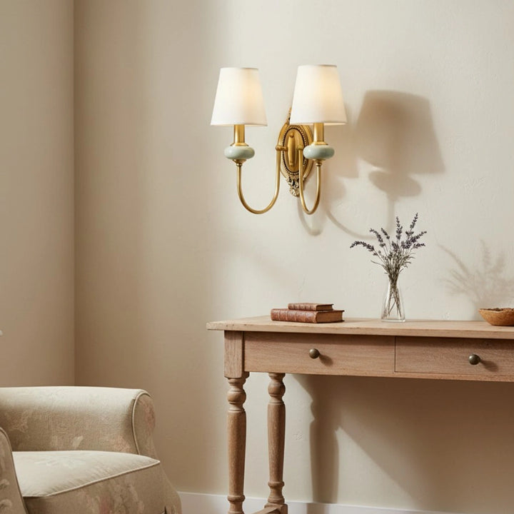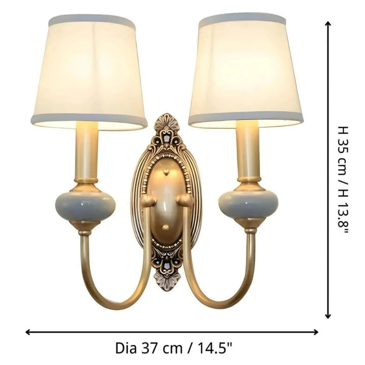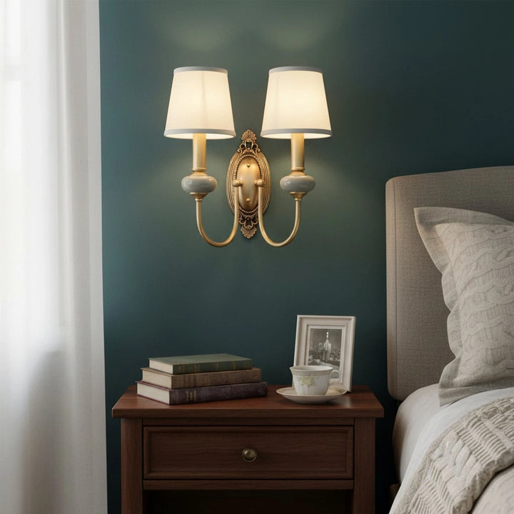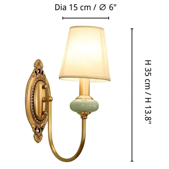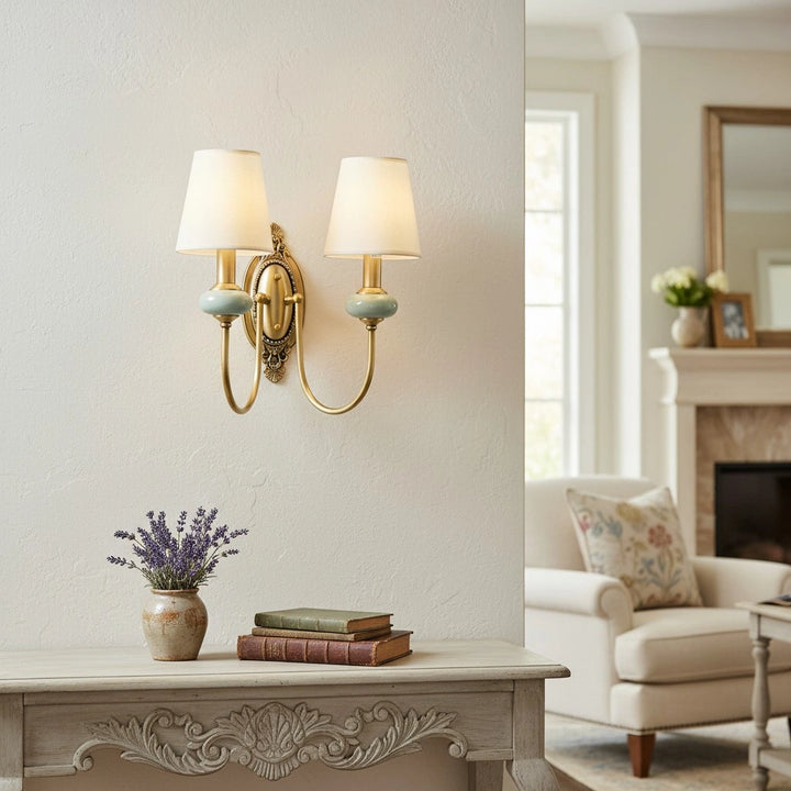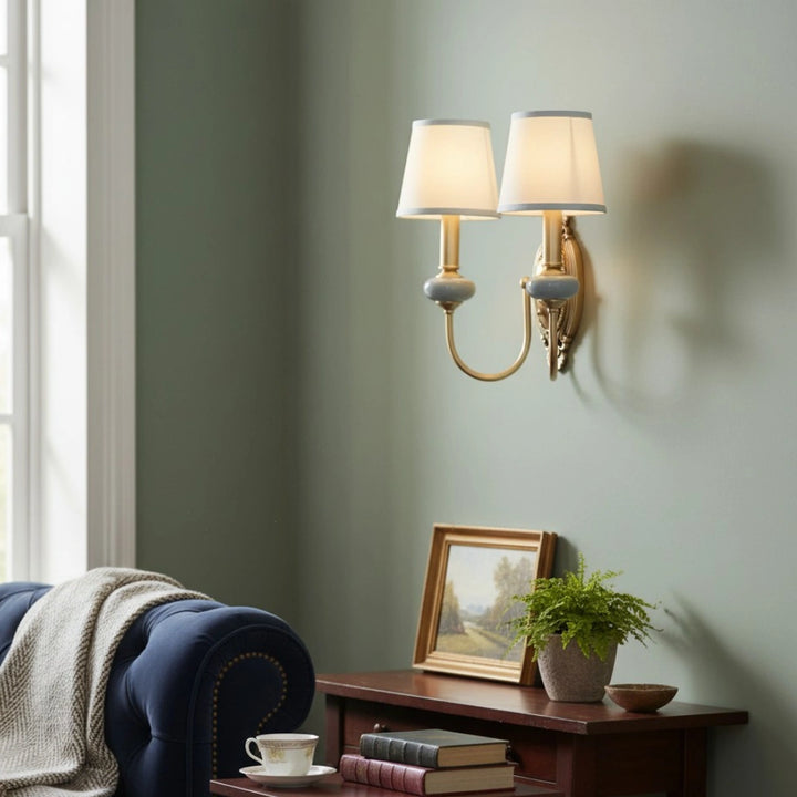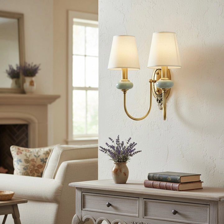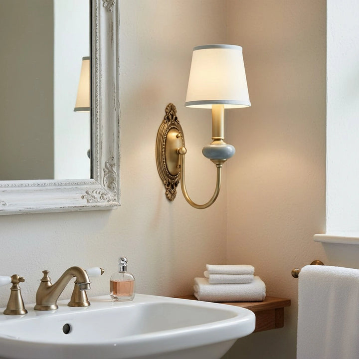 This retro wall lamp features an elegant curved metal arm and delicate ceramic accents, paired with a soft fabric lampshade, making it both classic and elegant.