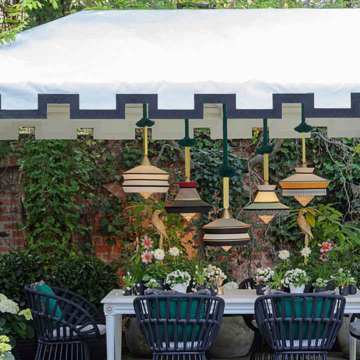 The vintage contrasting outdoor pendant light is made of durable fabric material and is suitable for gardens, terraces, balconies, or outdoor dining areas.