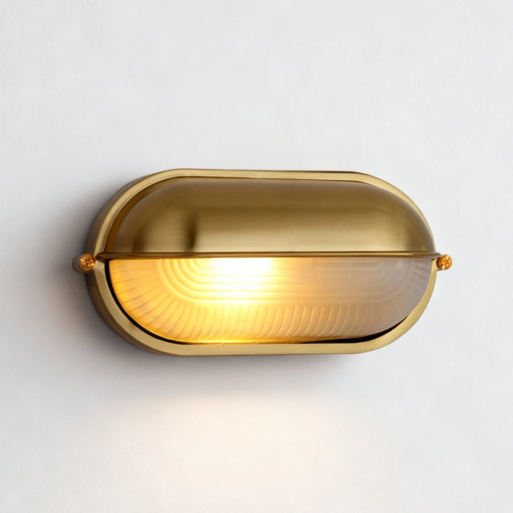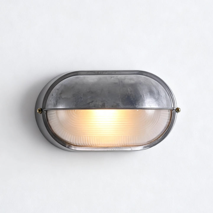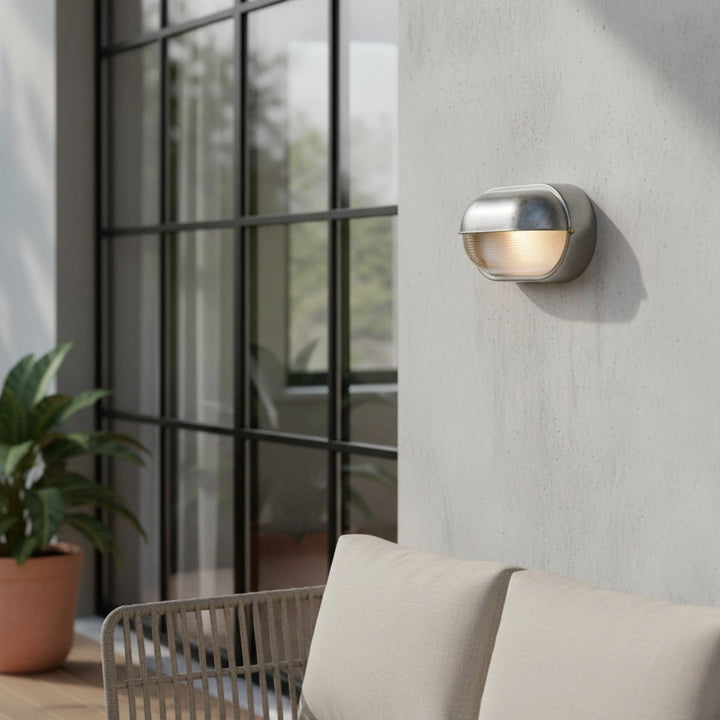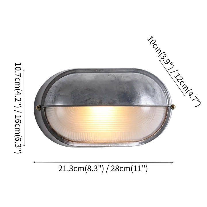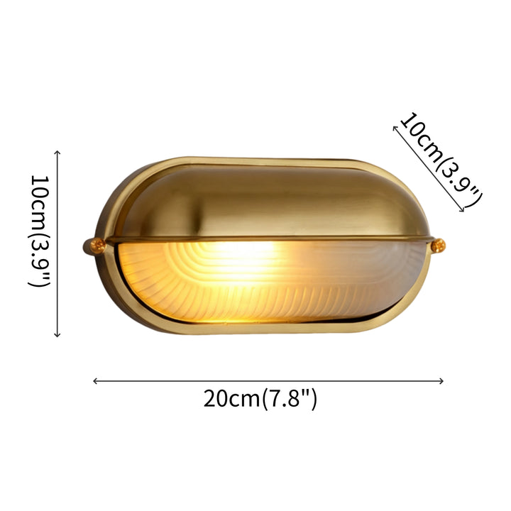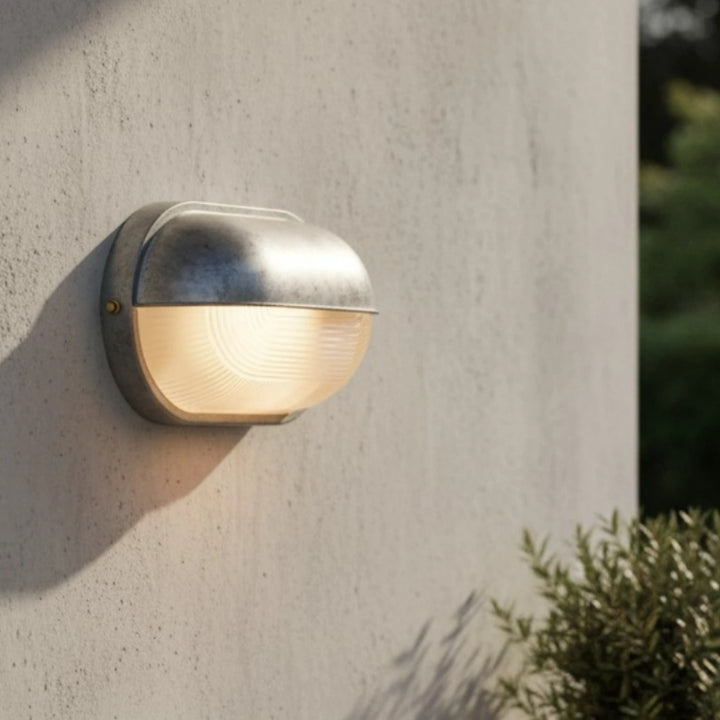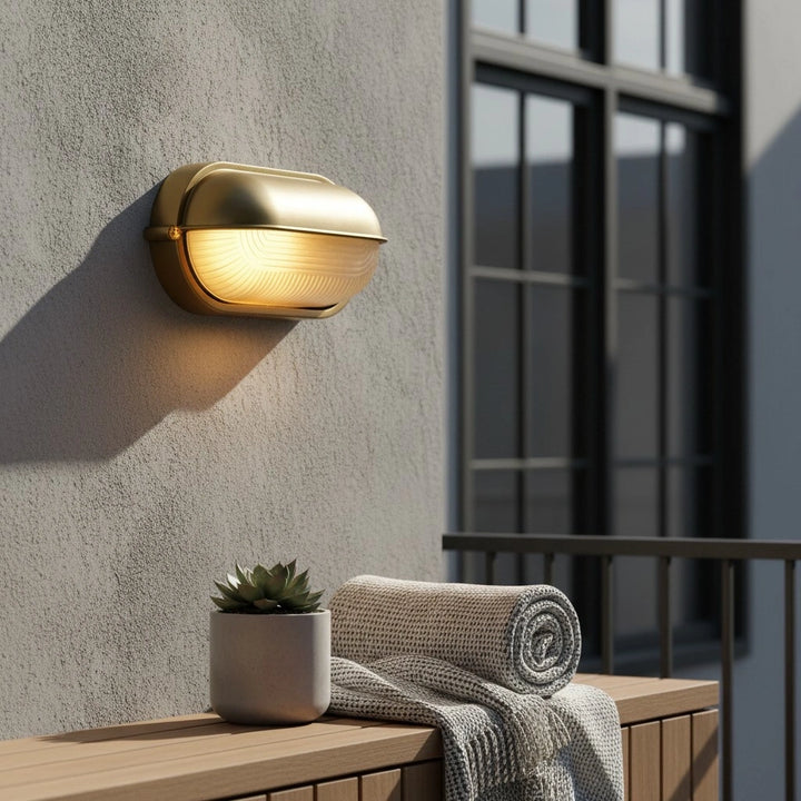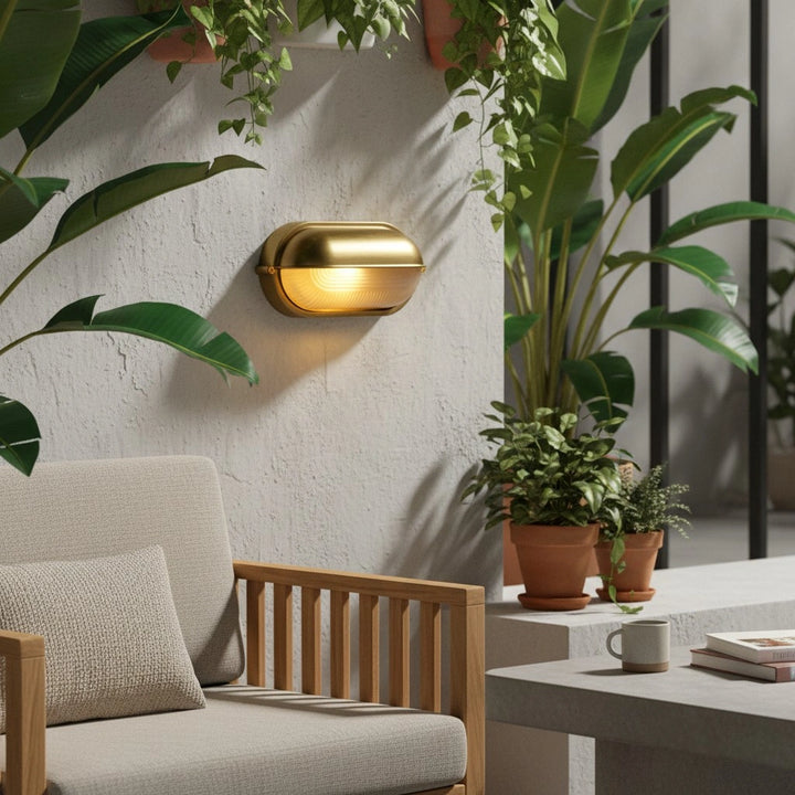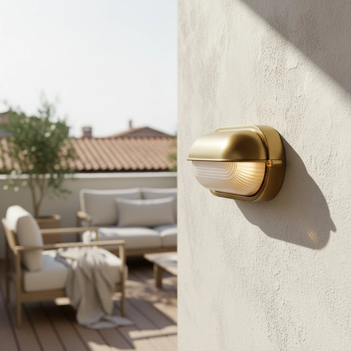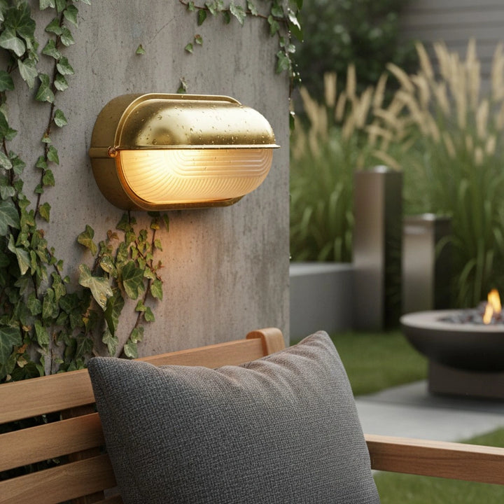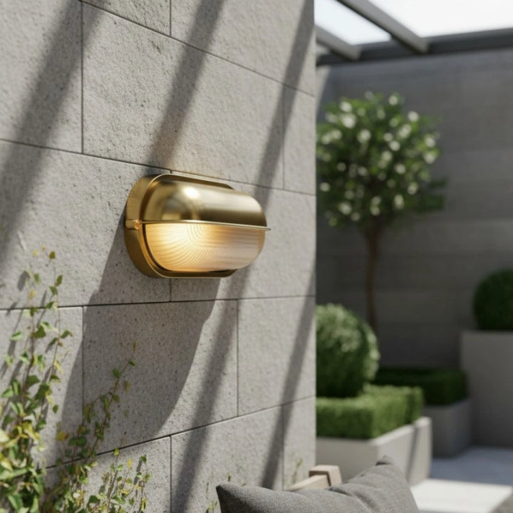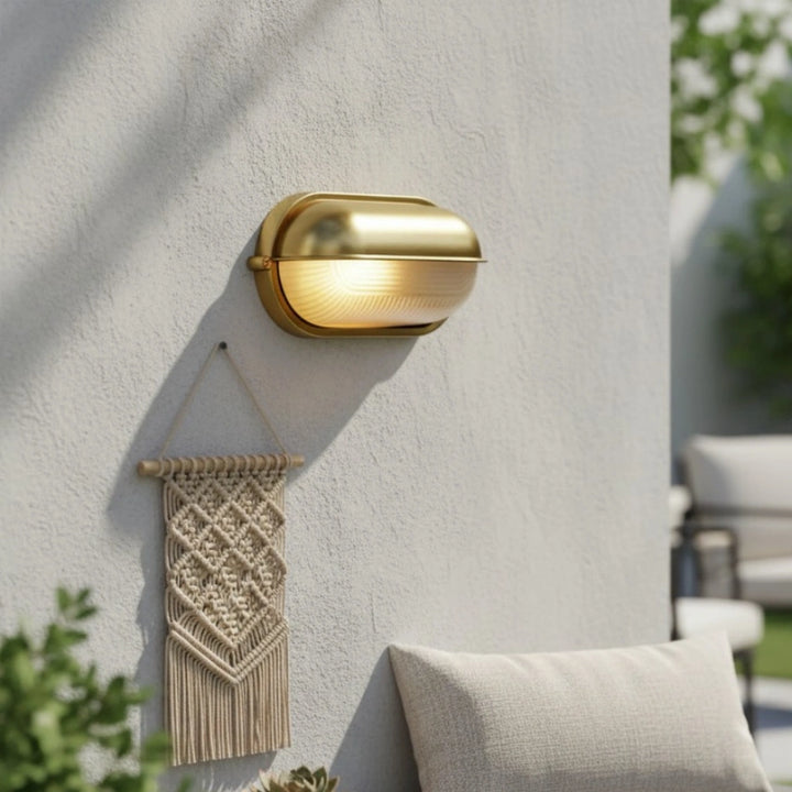This outdoor wall lamp features a simple round or oval shape, constructed from metal and glass, and is available in gold or silver finishes. Its IP65 waterproof rating ensures it's weather-resistant.