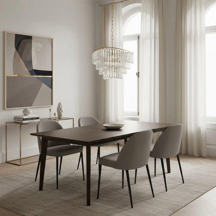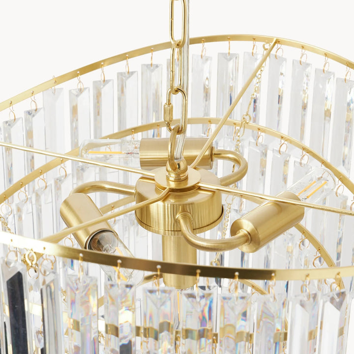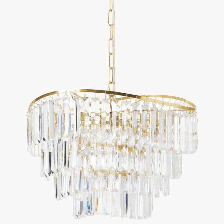 Crafted from metal and acrylic glass, this chandelier's sleek silhouette combines classic sophistication with modern allure, perfect for living rooms, dining rooms, and foyers.