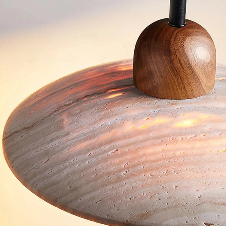 This lamp is composed of a travertine lampshade, a wooden lamp cap, and metal details. The natural travertine has unique, naturally formed textures.