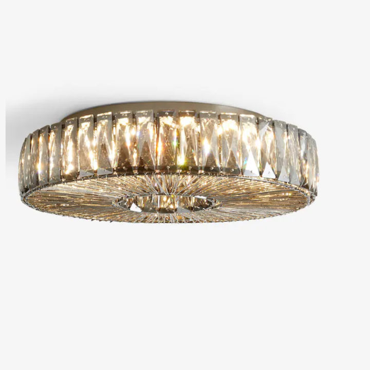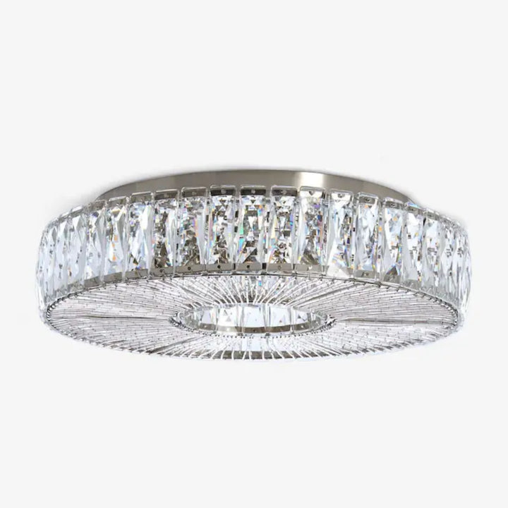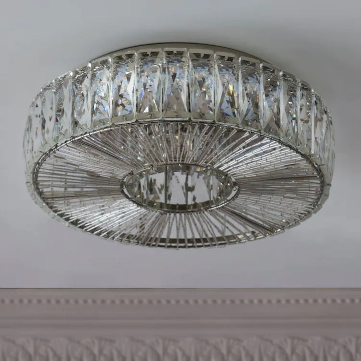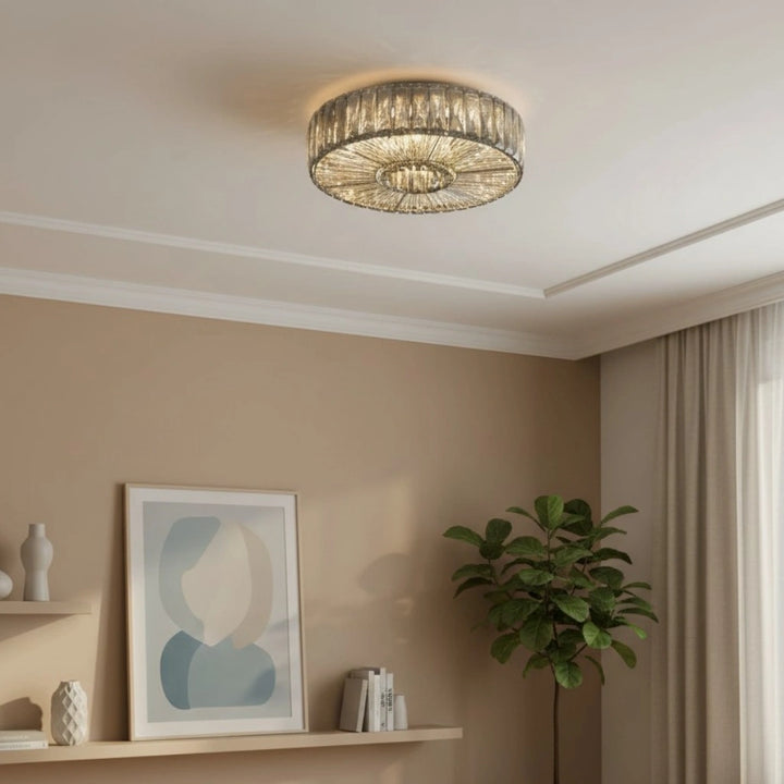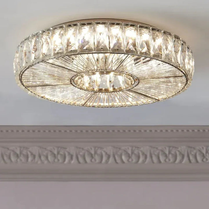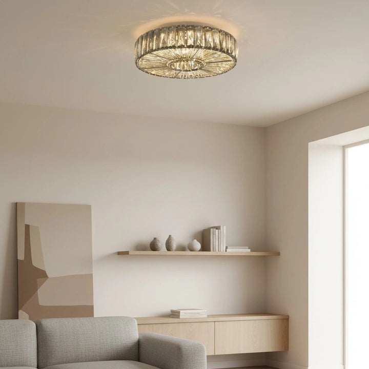 This recessed ceiling lamp features a smooth circular profile, paired with multi-sided glass and polished metal frames, making it suitable for living rooms and dining rooms.