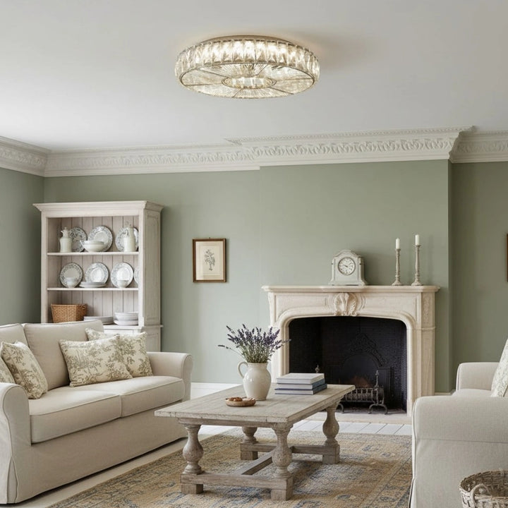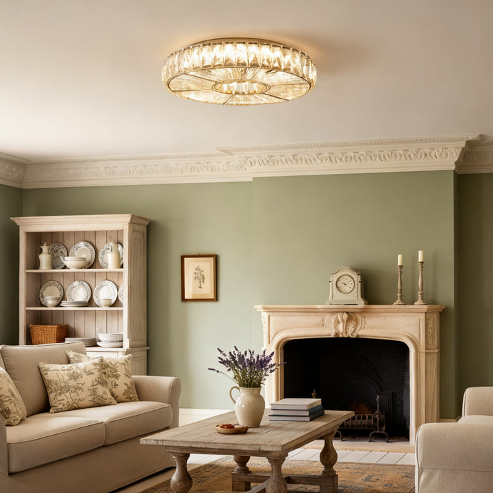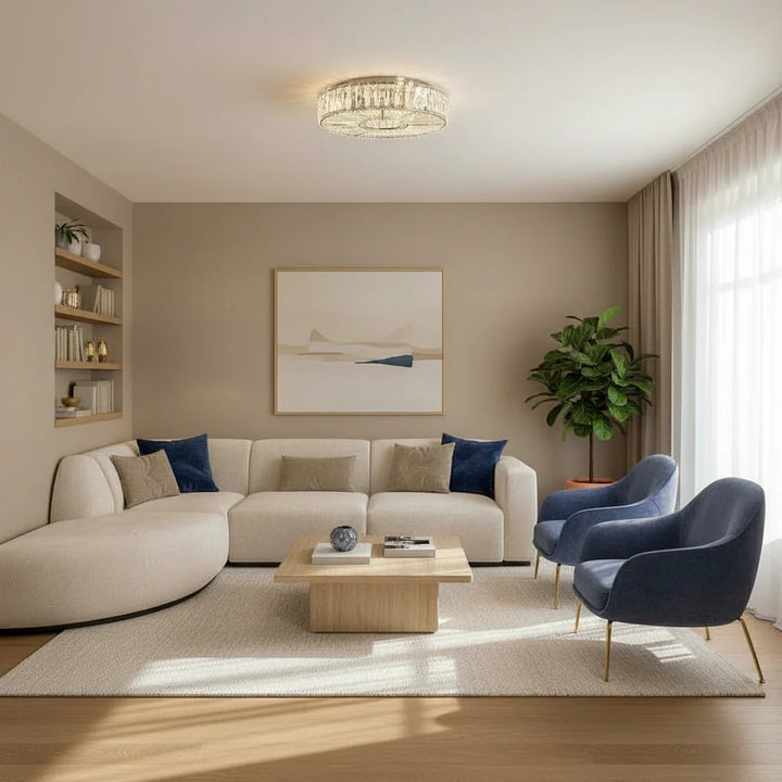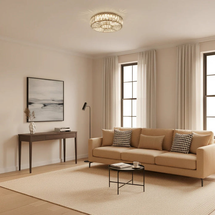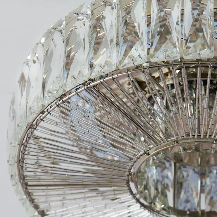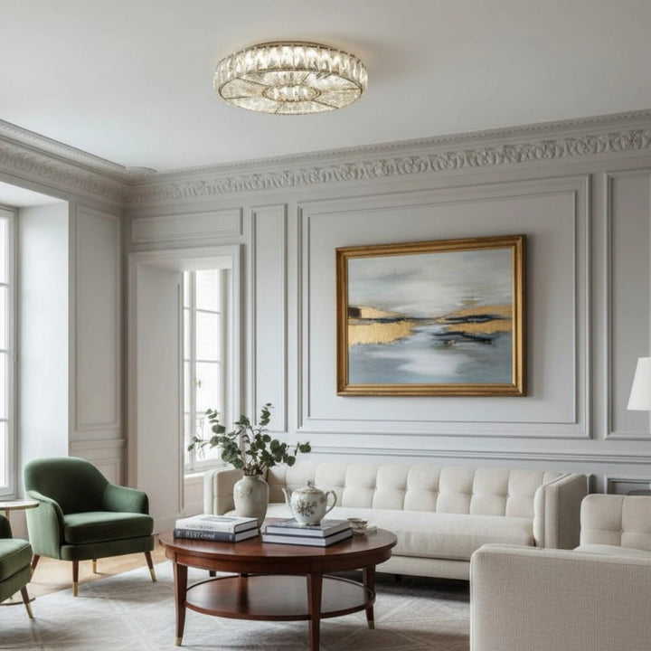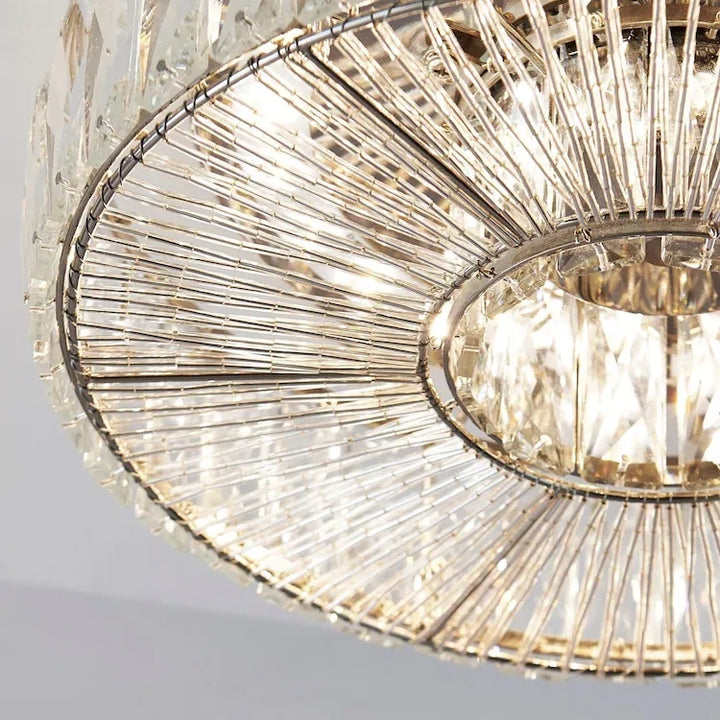 This recessed ceiling lamp features a smooth circular profile, paired with multi-sided glass and polished metal frames, making it suitable for living rooms and dining rooms.