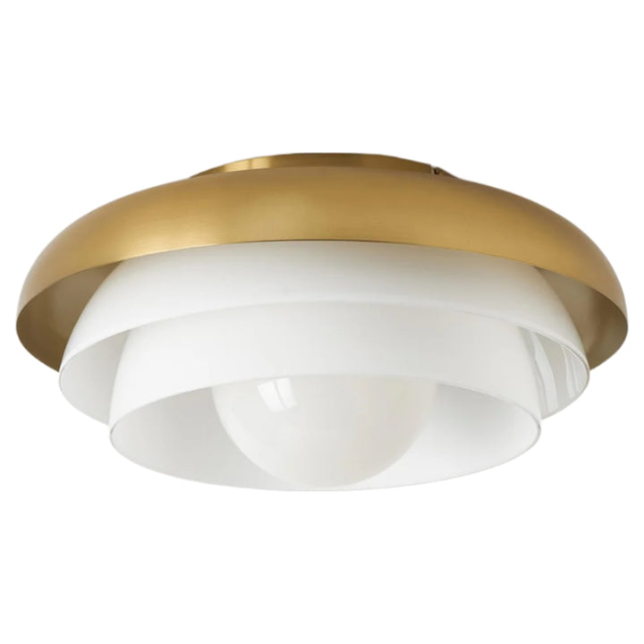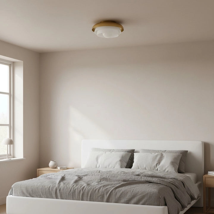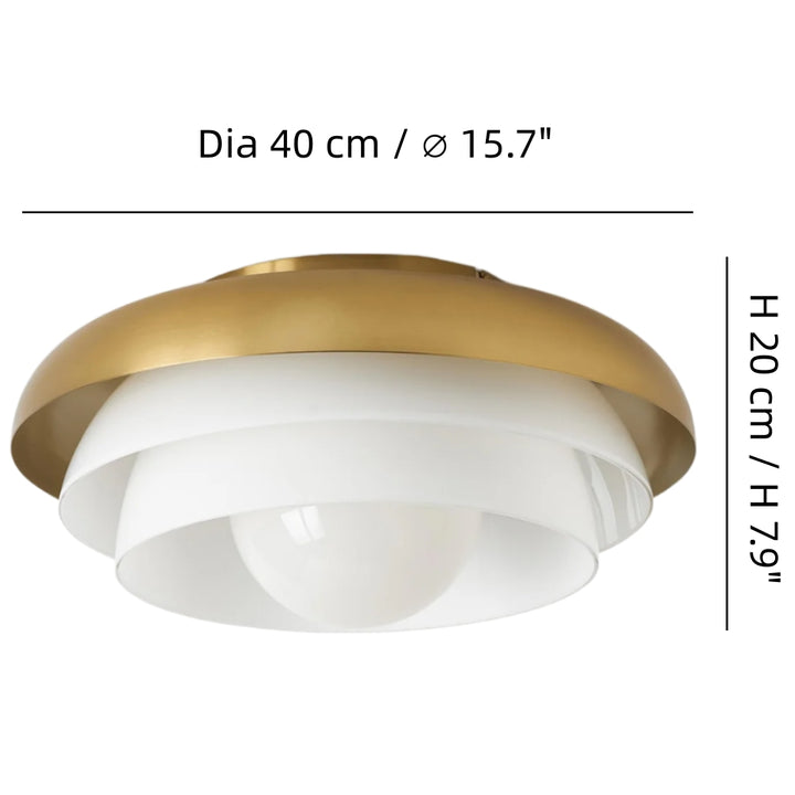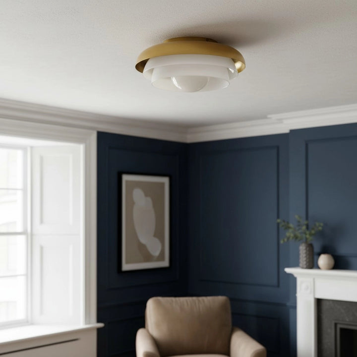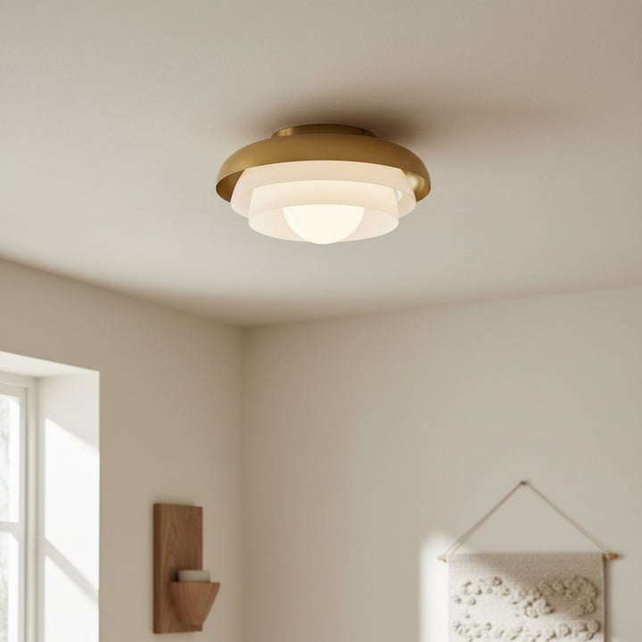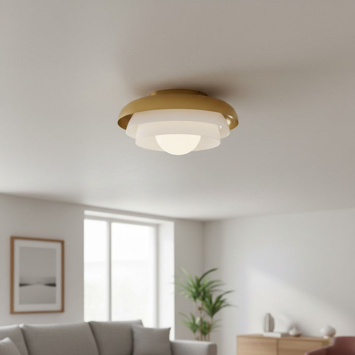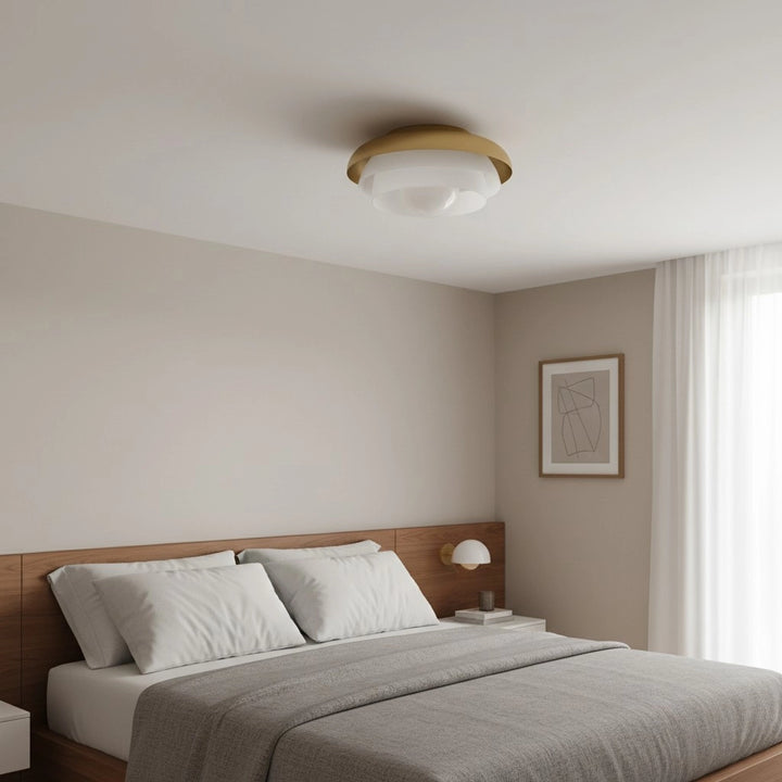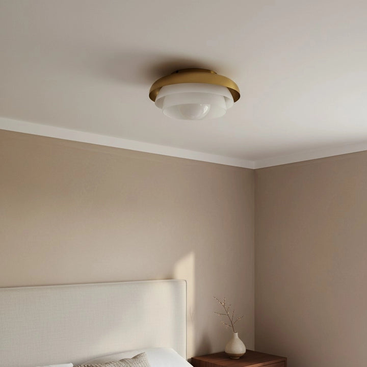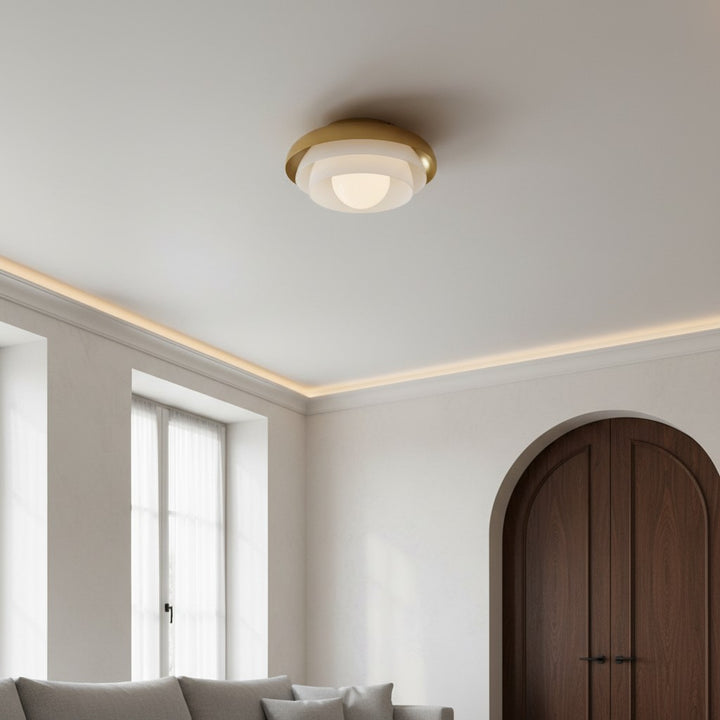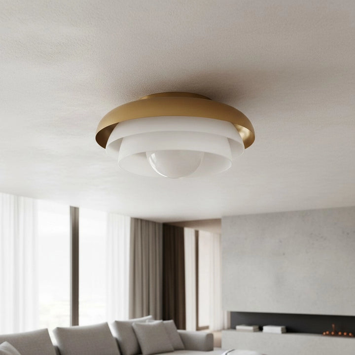 This layered ceiling light, with its contrasting metal and glass materials, emits a warm and elegant glow, making it a sophisticated choice for living rooms, bedrooms, or hallways. It transforms an ordinary ceiling space into a stylish and inviting visual focal point.
