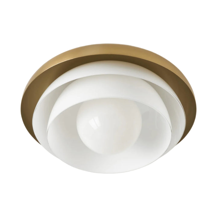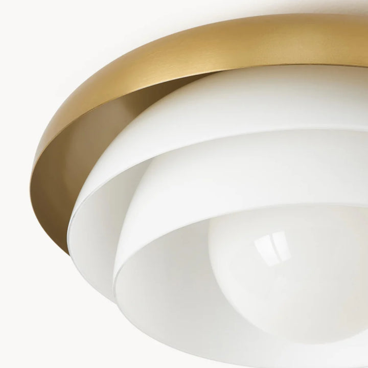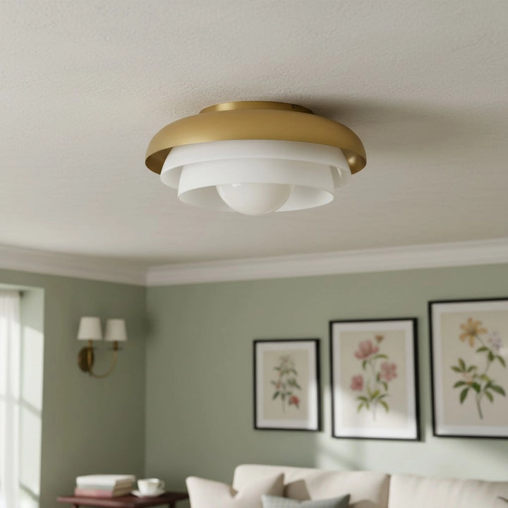 This ceiling light features a metal outer ring and a multi-layered glass shade, emitting a soft, diffused light. Its clean, flowing lines can elevate the style of an entryway or living space.