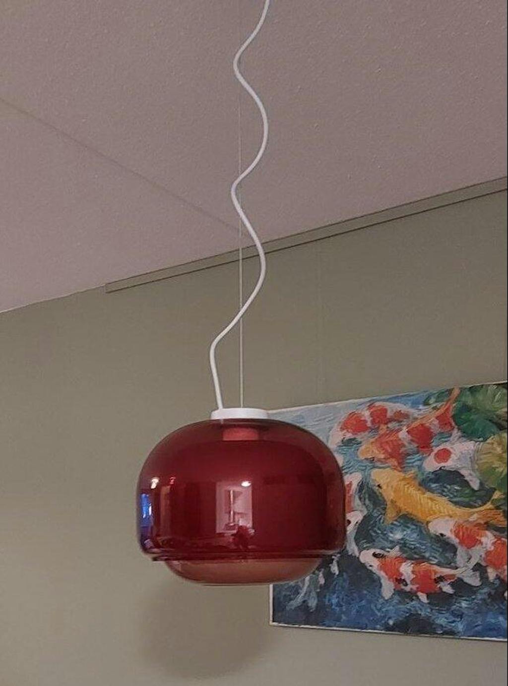 The Spherical Colorful Glass Pendant Light has a distinctive double - mushroom shape, with smooth curved outer and inner spheres working in harmony, and comes in multiple colors like green, grey, orange, pink, red to match decor styles.