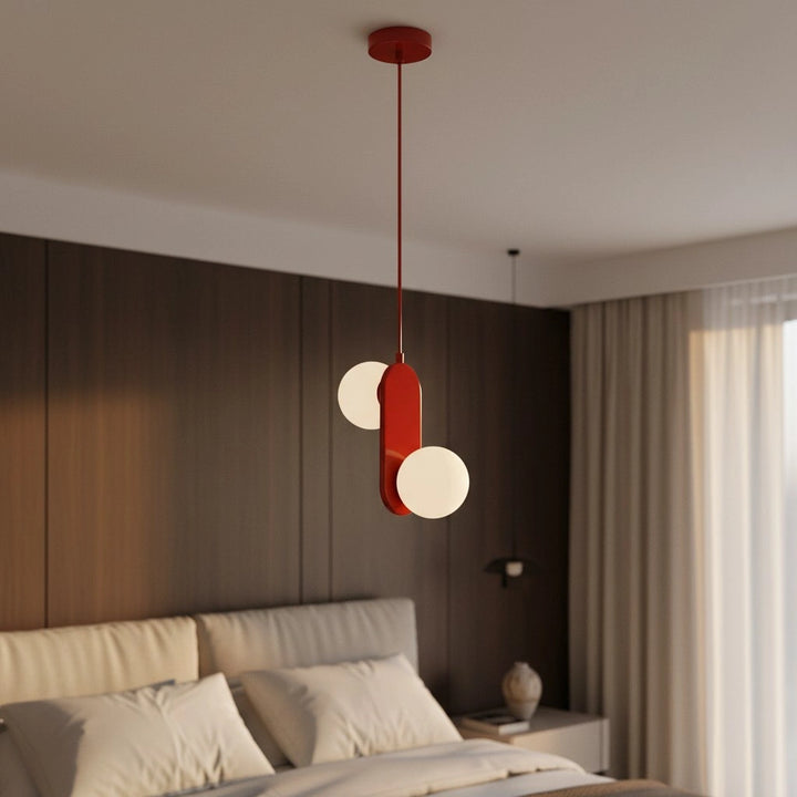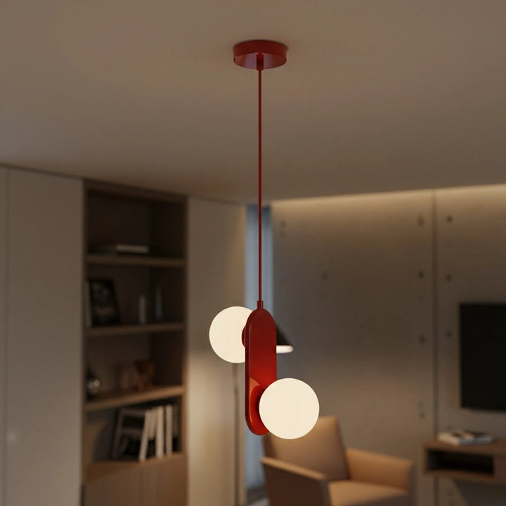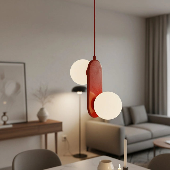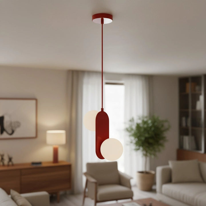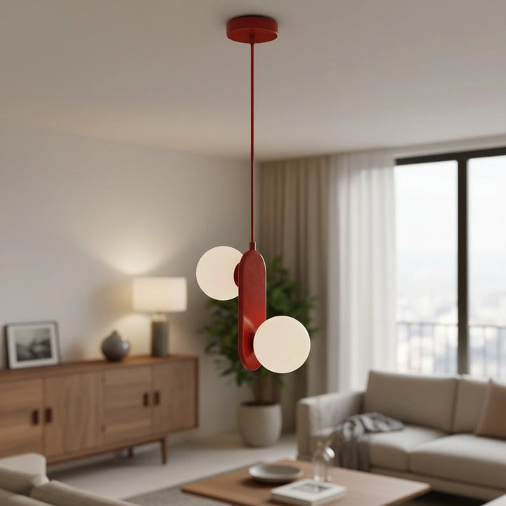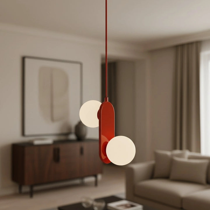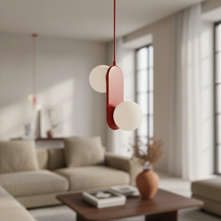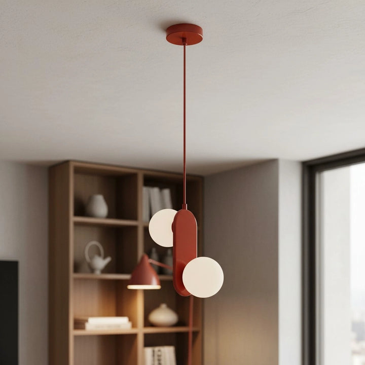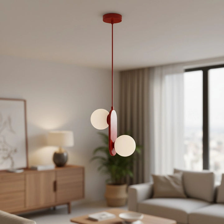 This chandelier features a vibrant epoxy resin-coated terracotta-colored ironwork paired with double protein spheres, giving it an artistic silhouette.