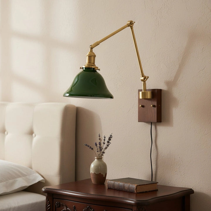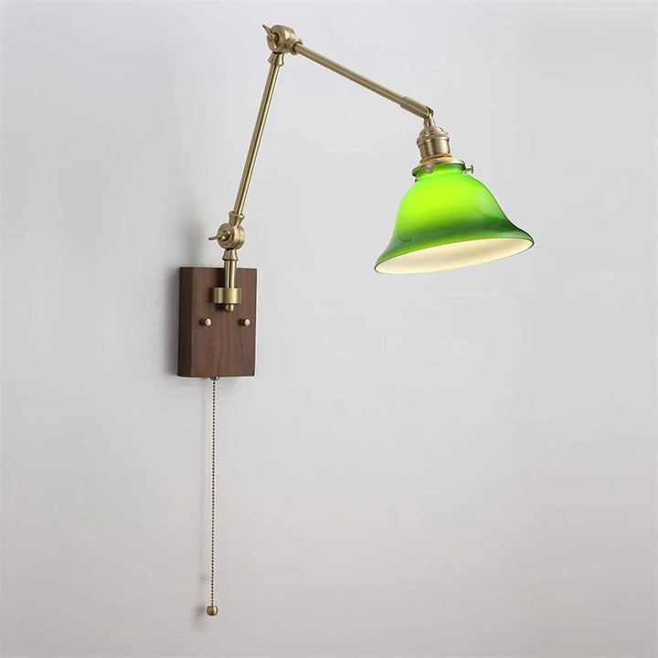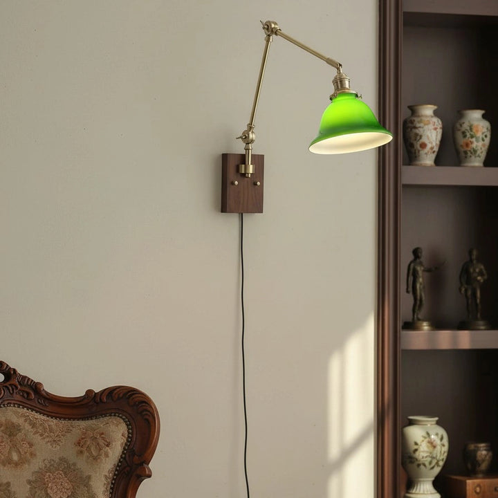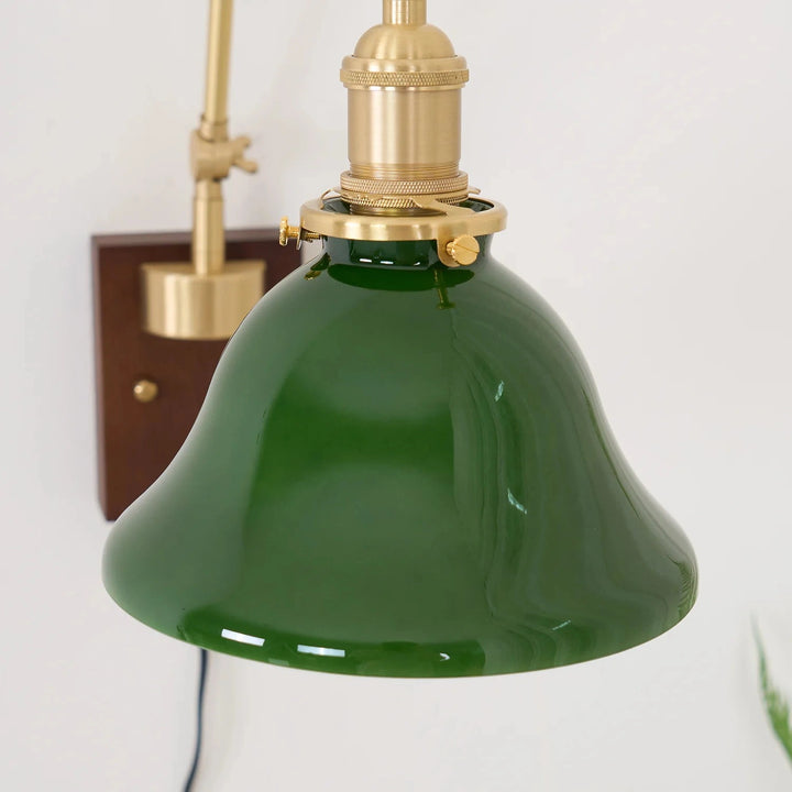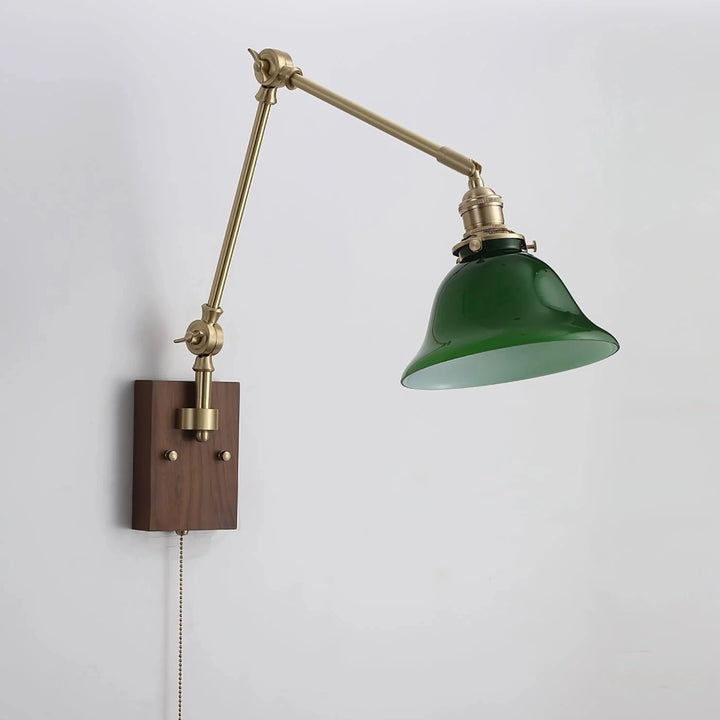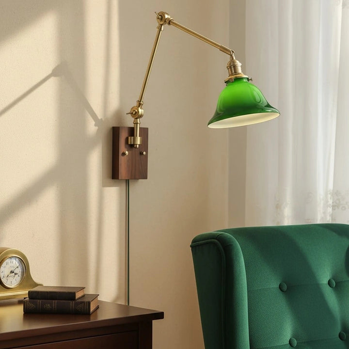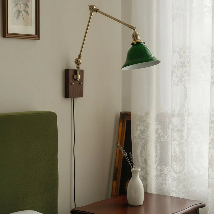 This swing-arm wall lamp features adjustable light height and is available with white and green shades. The classic brass frame suits a variety of styles. It's an excellent choice whether installed in a bedroom, living room, or study.