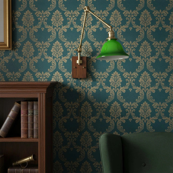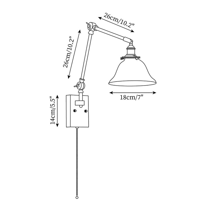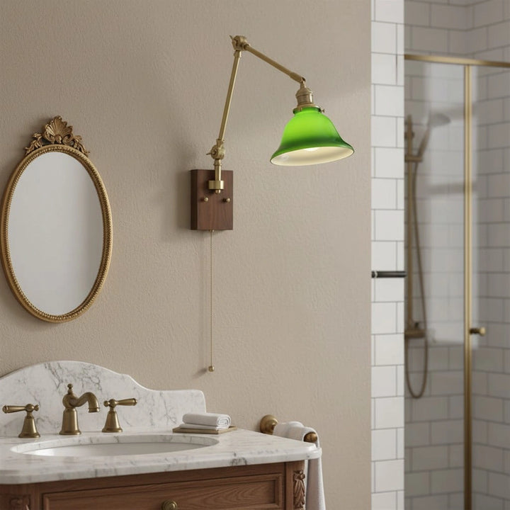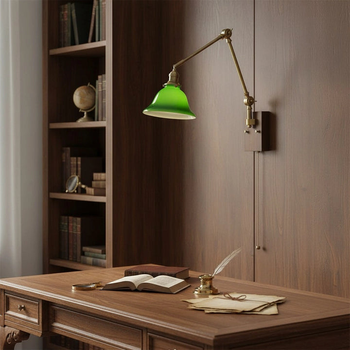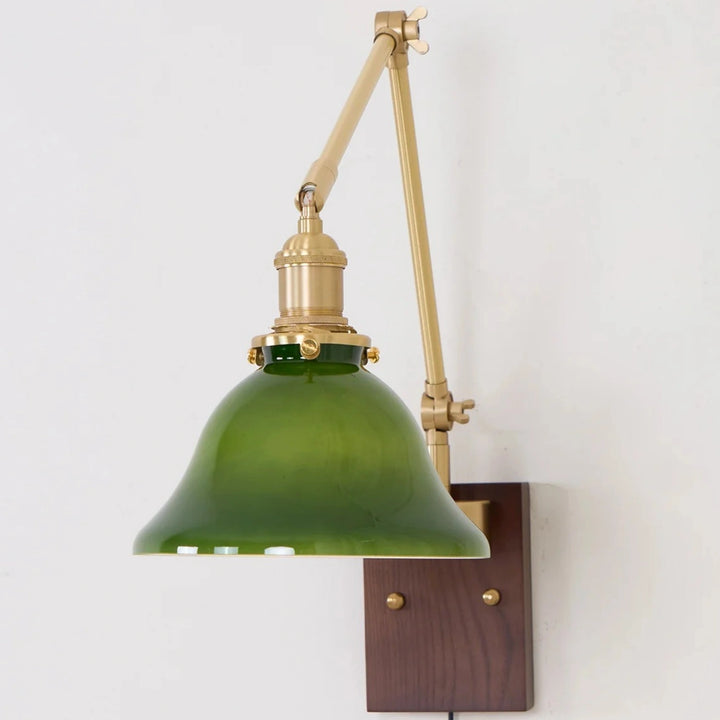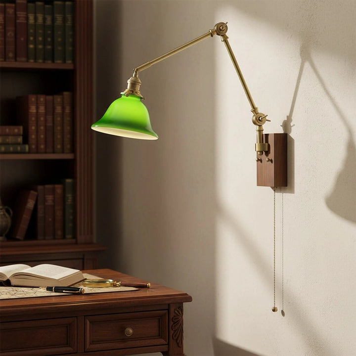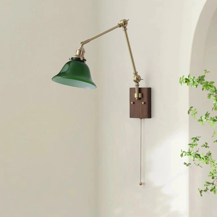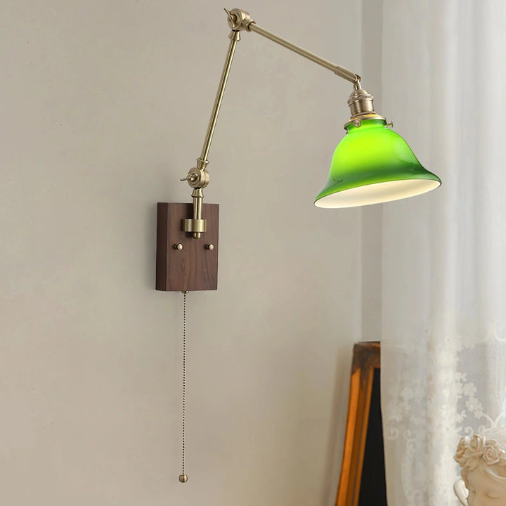 This swing-arm wall lamp features adjustable light height and is available with white and green shades. The classic brass frame suits a variety of styles. It's an excellent choice whether installed in a bedroom, living room, or study.