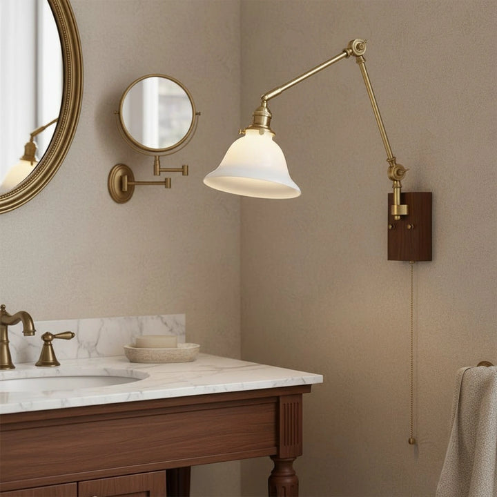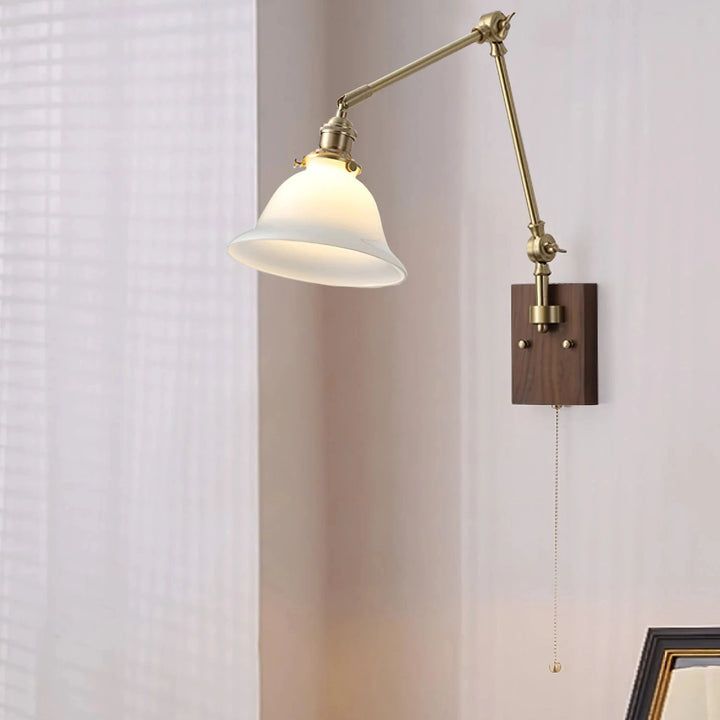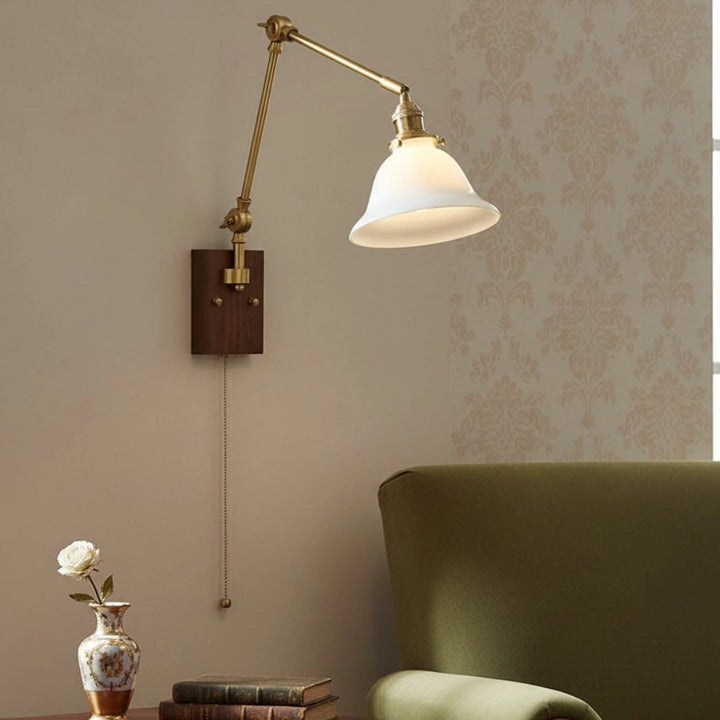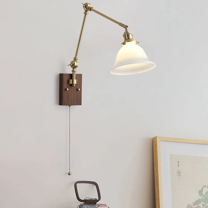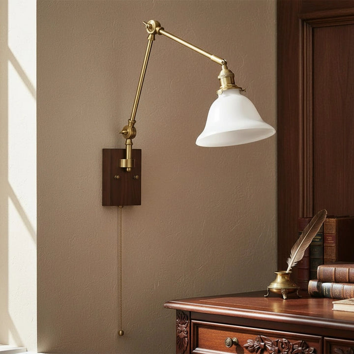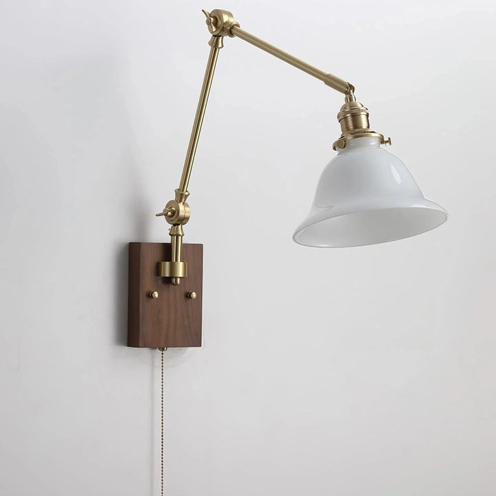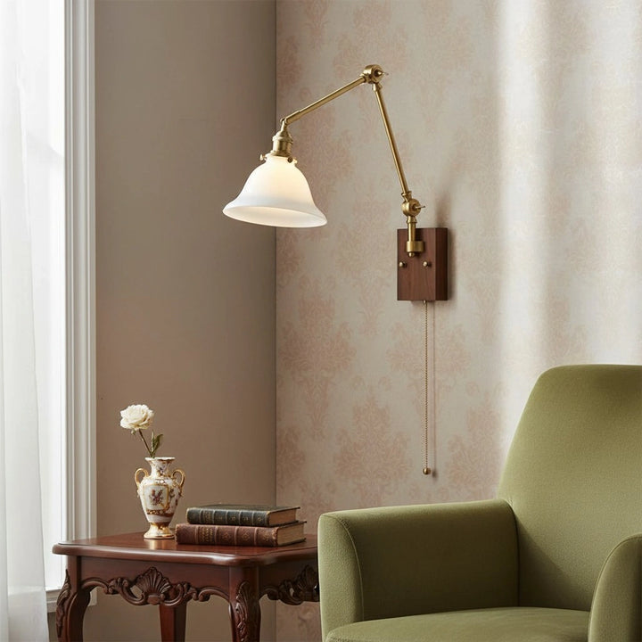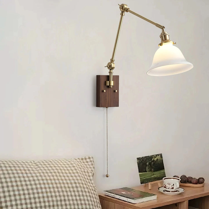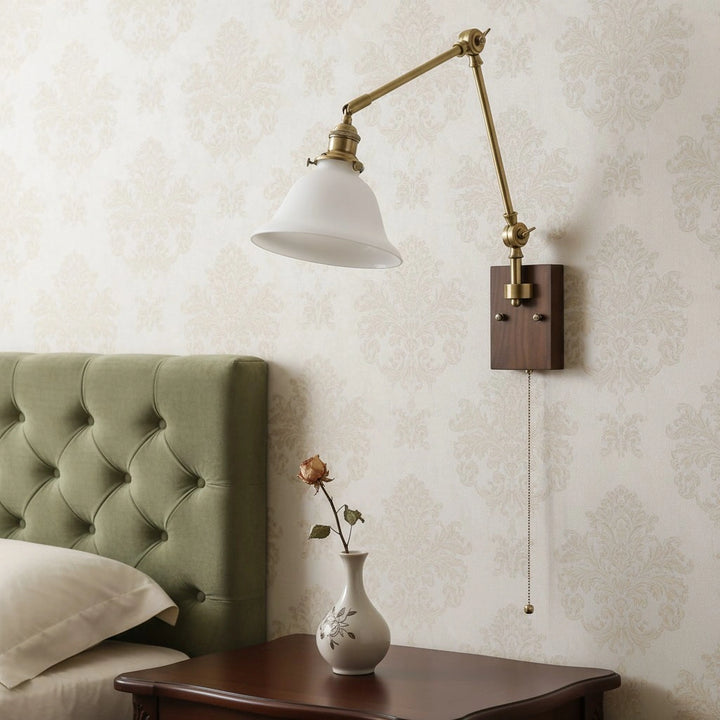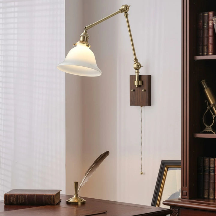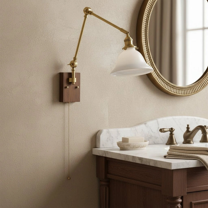 This wall lamp features an adjustable rocker arm crafted from premium brass and a richly textured walnut wood base, exuding a vintage elegance that makes it perfect for a reading nook, bedside table, or living room.