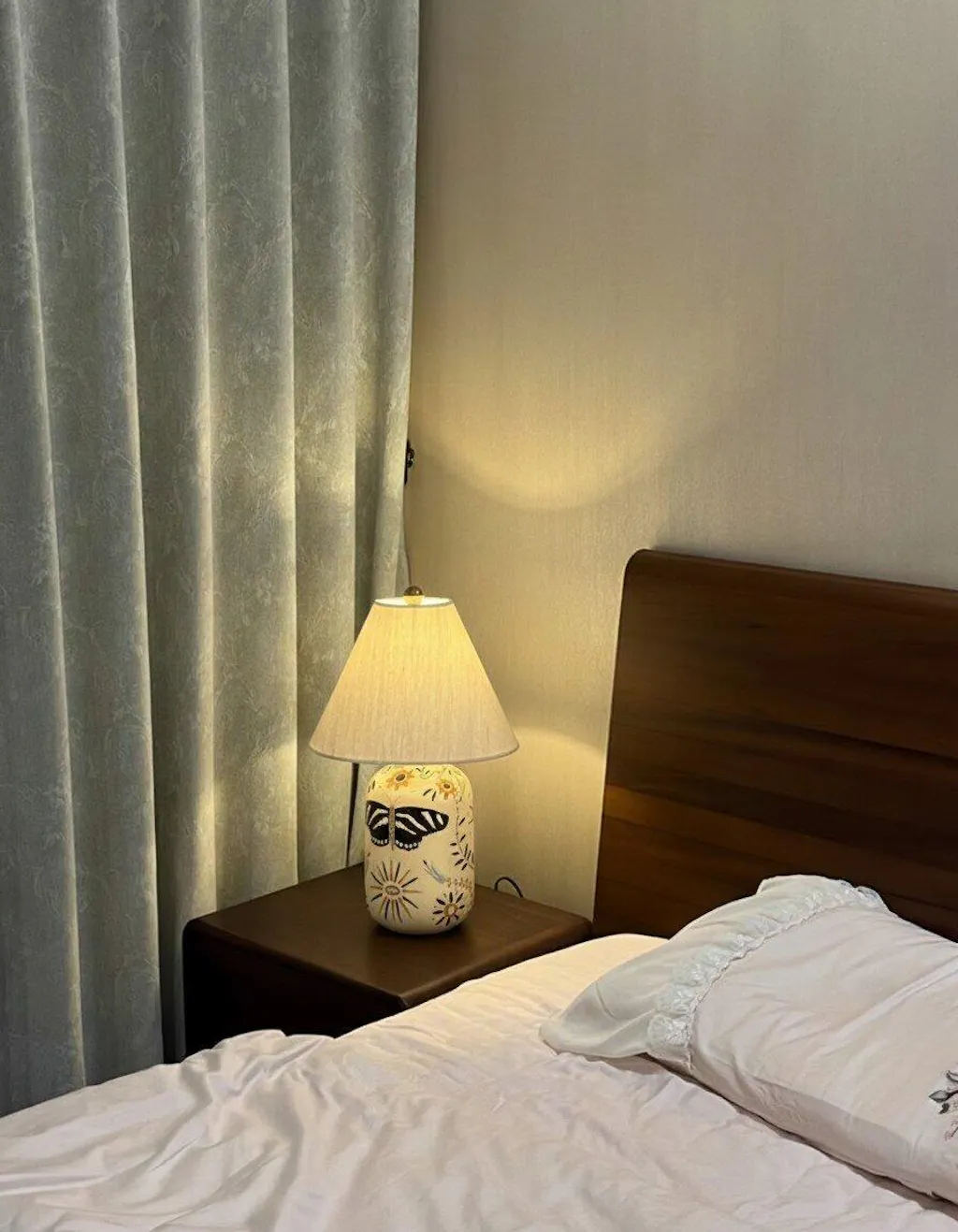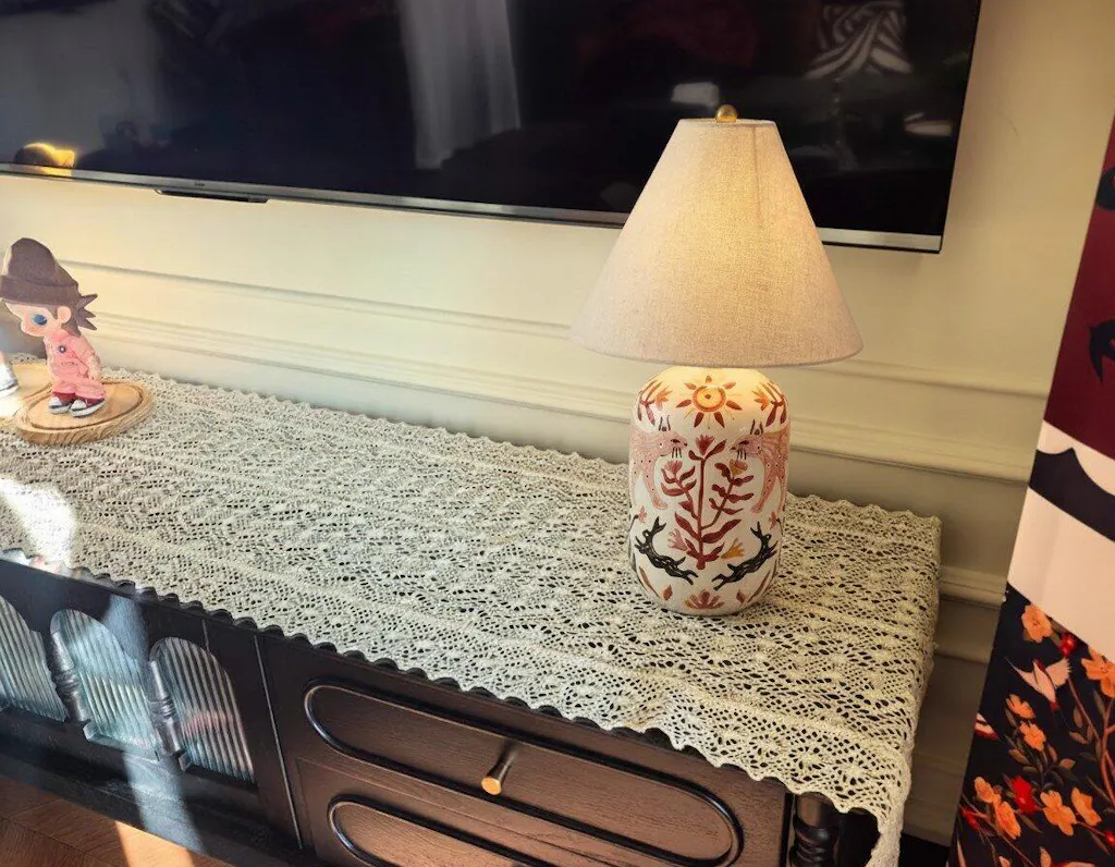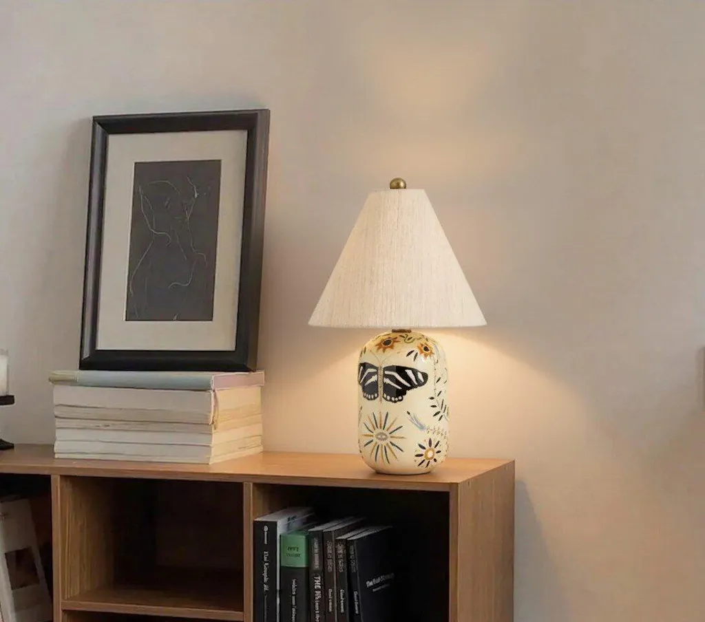 O candeeiro de mesa apresenta bases cerâmicas pintadas à mão e abat-jours em linho, projetando uma luz quente e encantadora. Ideal para salas de estar, combinando charme artesanal com design têxtil suave.