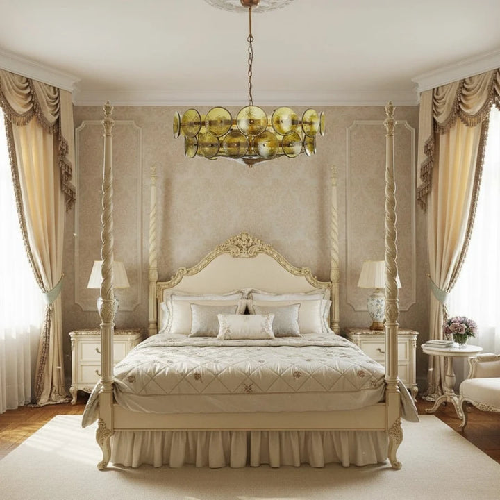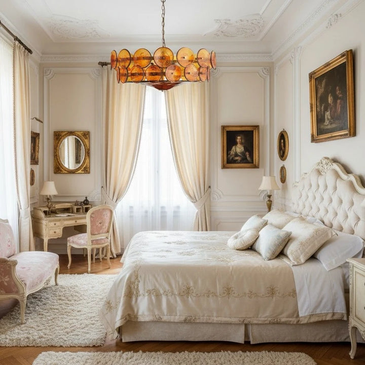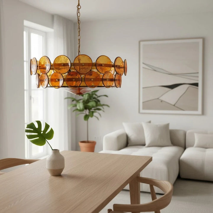 O candeeiro de vidro Murano âmbar apresenta discos circulares em camadas em tons ricos, combinando charme vintage com sofisticação intemporal. A estrutura metálica em bronze adiciona detalhe clássico, tornando-o perfeito para salas de jantar elegantes e espaços de estar acolhedores.