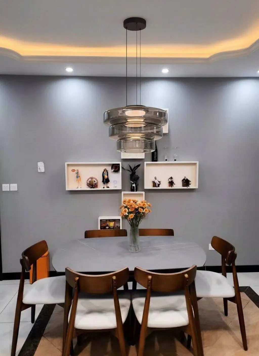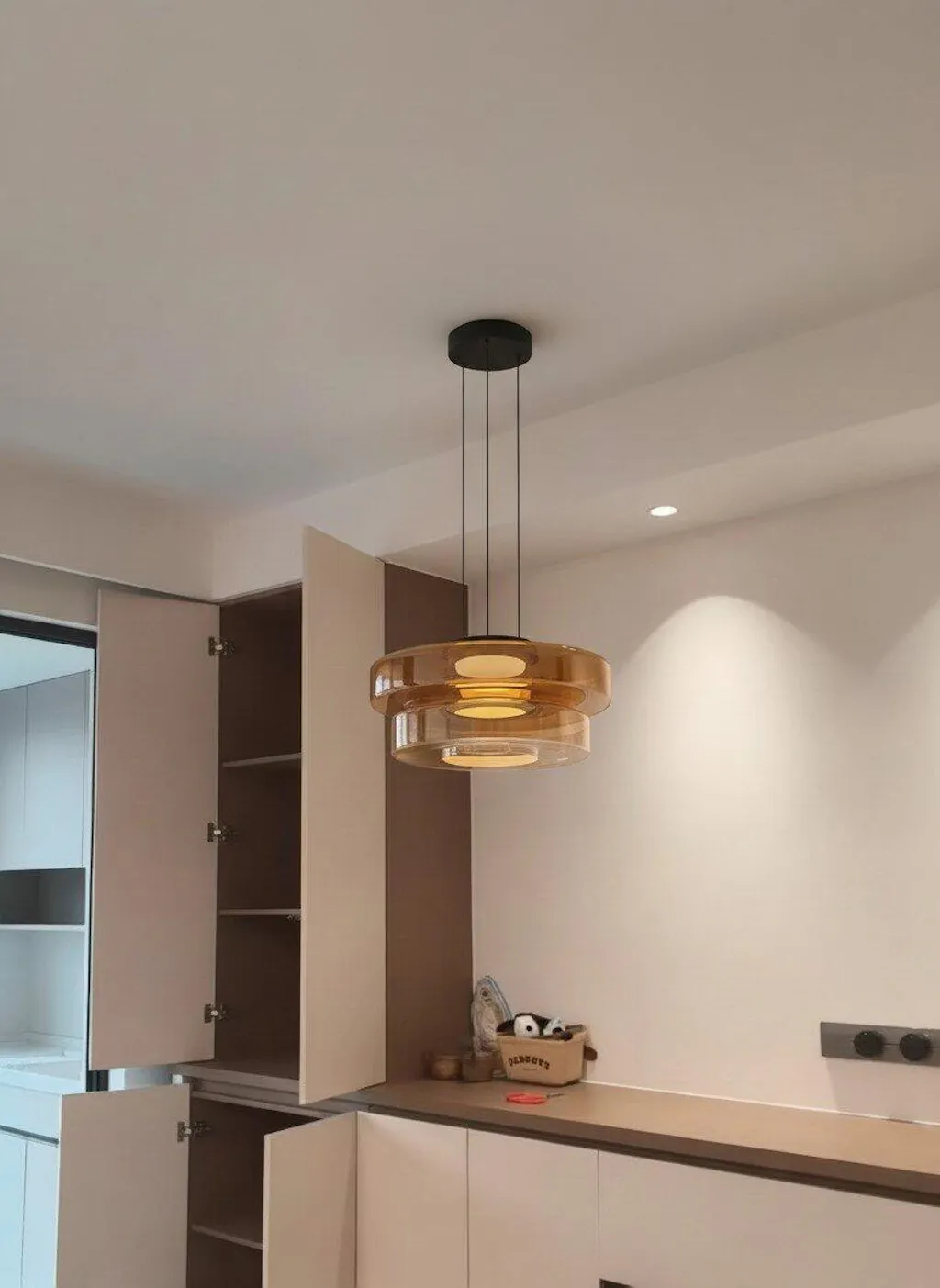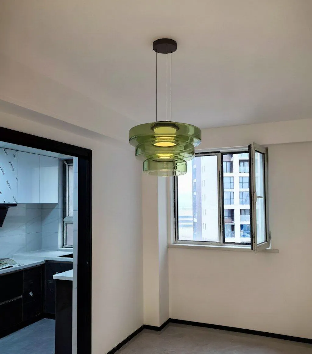 O candeeiro de teto com design de vidro em disco de três camadas é uma fusão do estilo industrial e do estilo nórdico. Apresentando um design intemporal de cúpula multicamada, este candeeiro é versátil e prático.