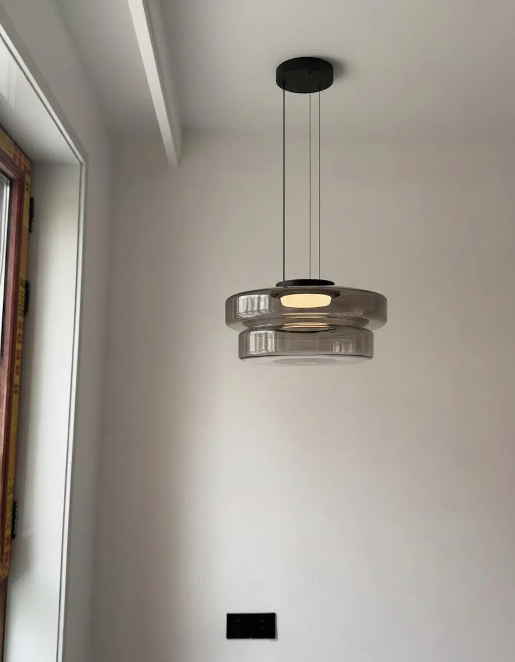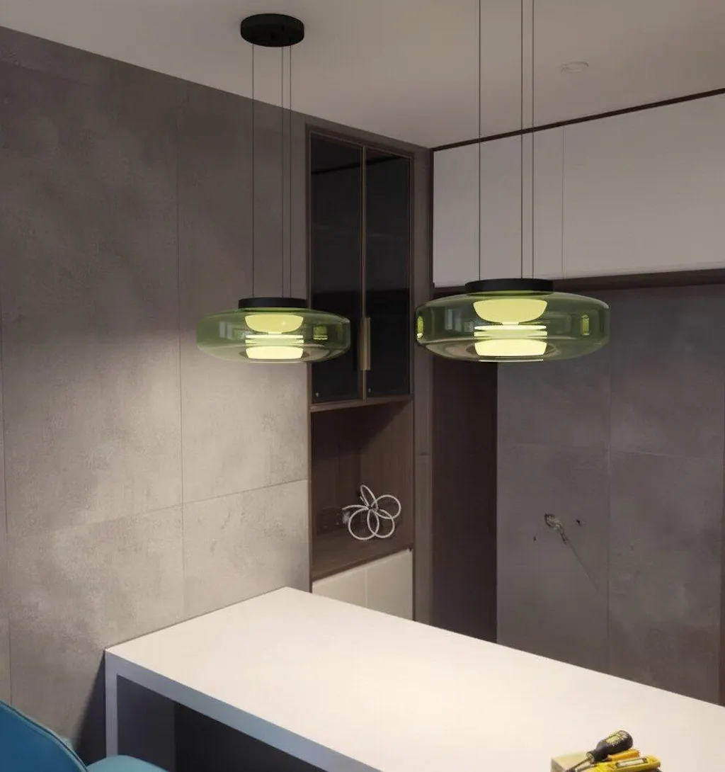 A luminária pendular com disco de vidro tem um charme inato graças à sua forma delicada, luz quente e à tranquilidade e equilíbrio inabalável que transmite.