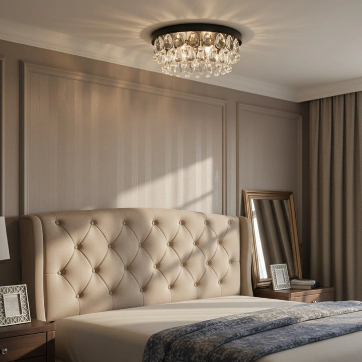 Esta luz de teto embutida é feita de cristais em forma de gota de chuva. É adequada para uso em quartos, salas de estar e salas de jantar.