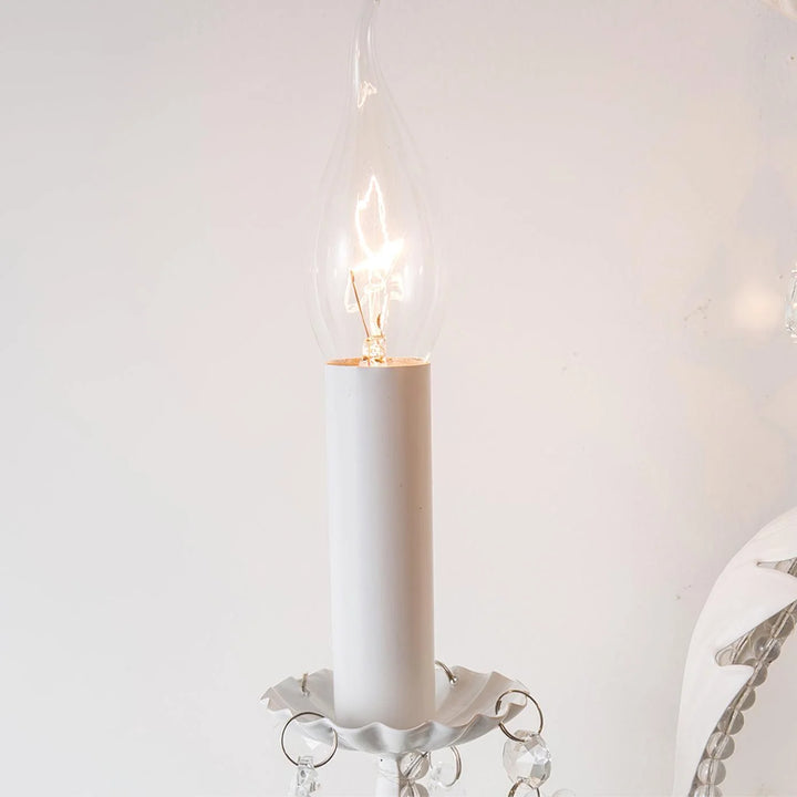 When the lights are on, the light shines through the candle-shaped lampposts and crystal pendants, refracting a soft yet dazzling glow. The combination of white metal carvings and crystals appears even more exquisite and luxurious under the warm light.