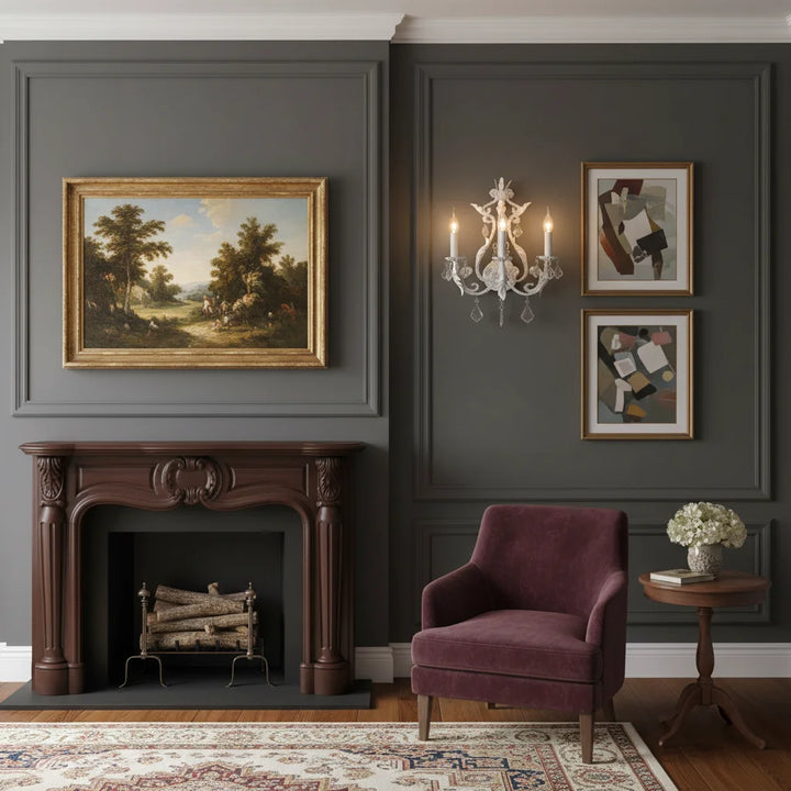 This European-style vintage wall lamp features delicate floral and scrollwork relief carvings, with flowing and dynamic metal components. It is also adorned with several uniquely shaped crystal pendants, making it suitable for French vintage or European classic style home spaces.