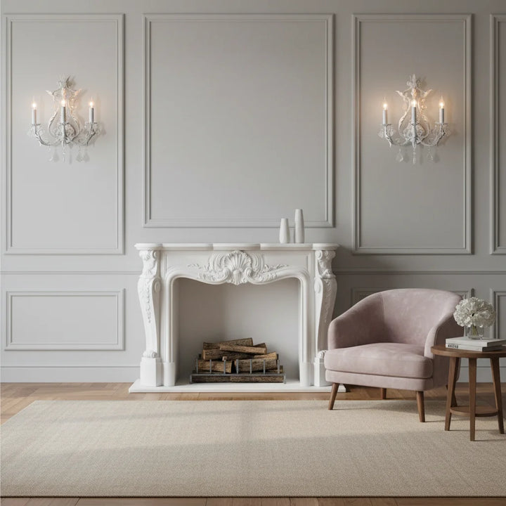 The design is highly artistic, with delicate and three-dimensional floral and scroll patterns carved on the white metal body, paired with a transparent crystal pendant. Even without light, it looks like a piece of European retro art, making it highly decorative.