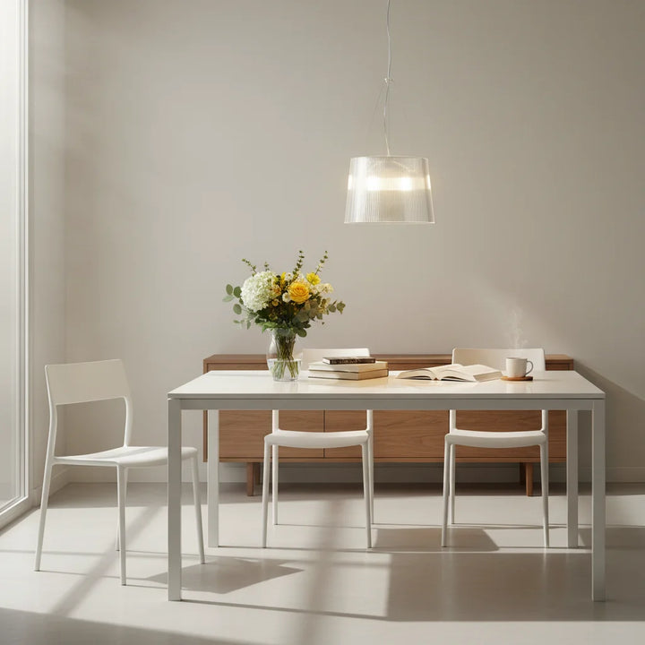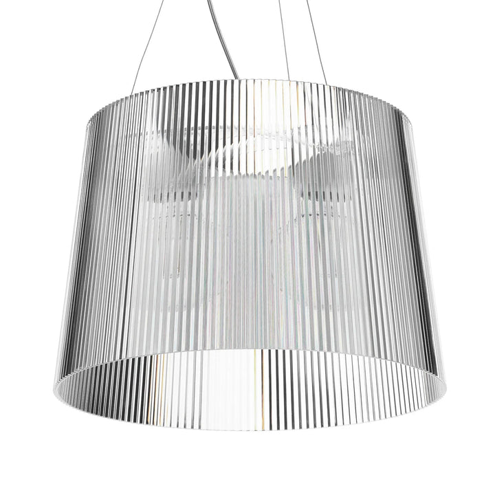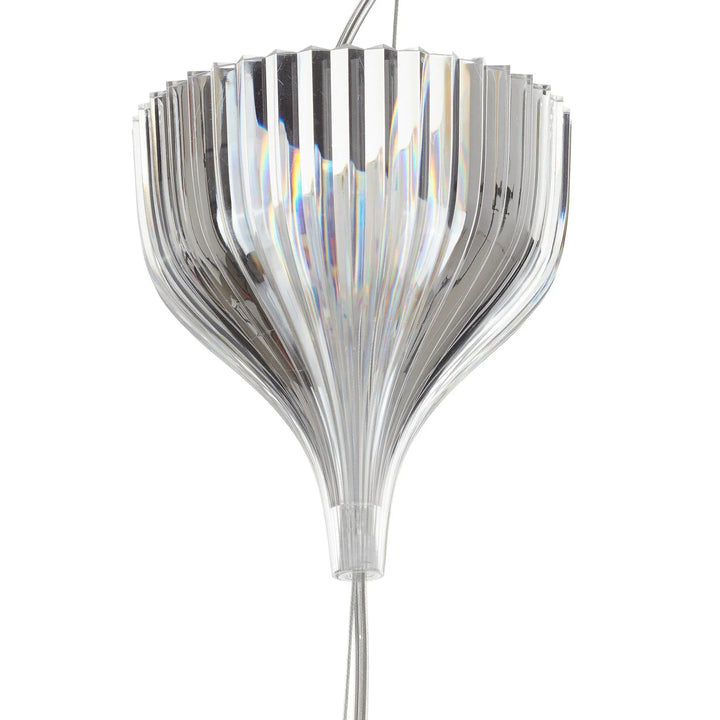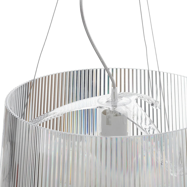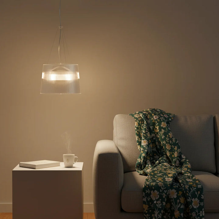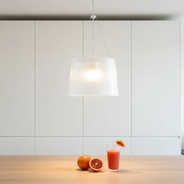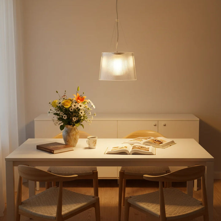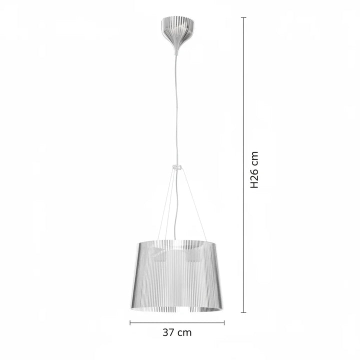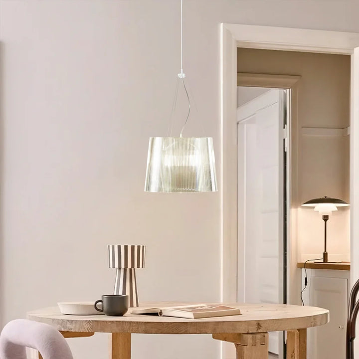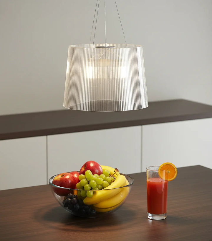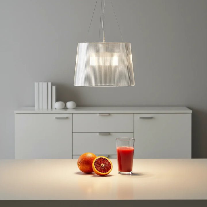 This chandelier is made of transparent PC material, featuring a cylindrical, pleated design that tapers slightly at the top, and a bright color. It is suitable for installation in kitchens, living rooms, and dining rooms.