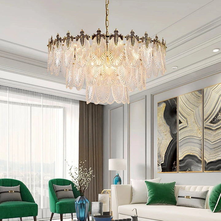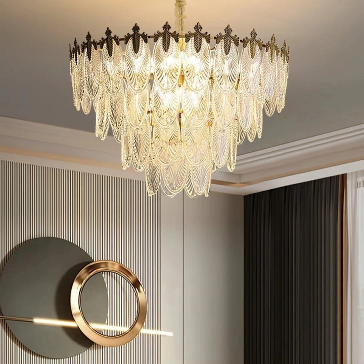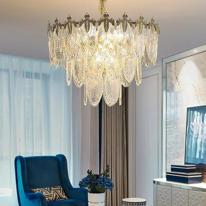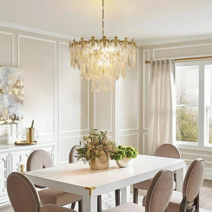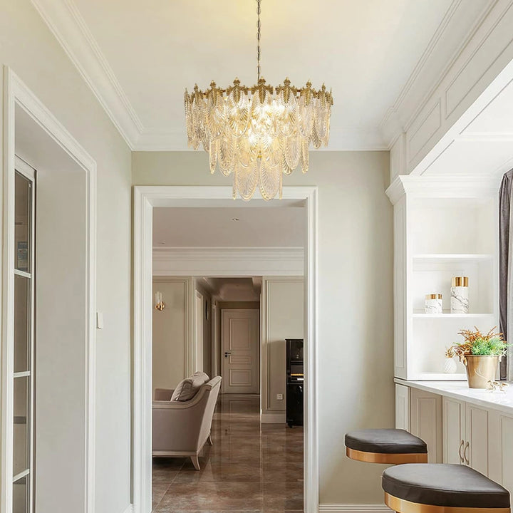 Este candeeiro de teto é feito de cristal, e a forma das folhas combinada com detalhes em latão adiciona um toque de luxo retro à estrutura. É perfeito para espaços como salas de jantar, salas de estar ou halls.