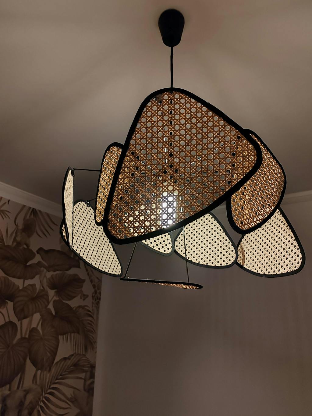- Rattanskärmen är kantad med ett tyg inspirerat av traditionella rattanskärmar.