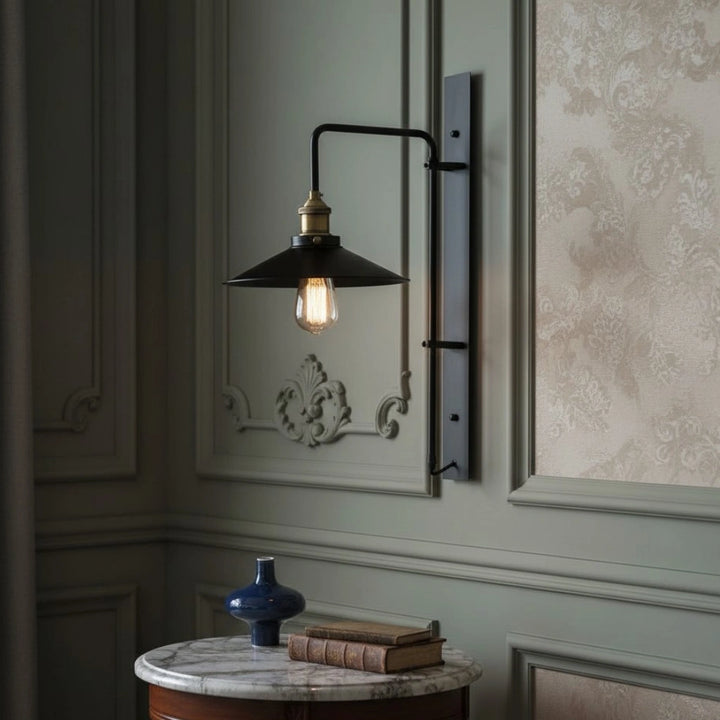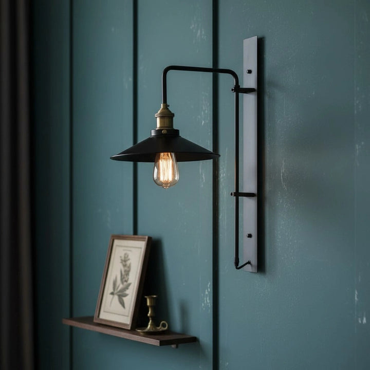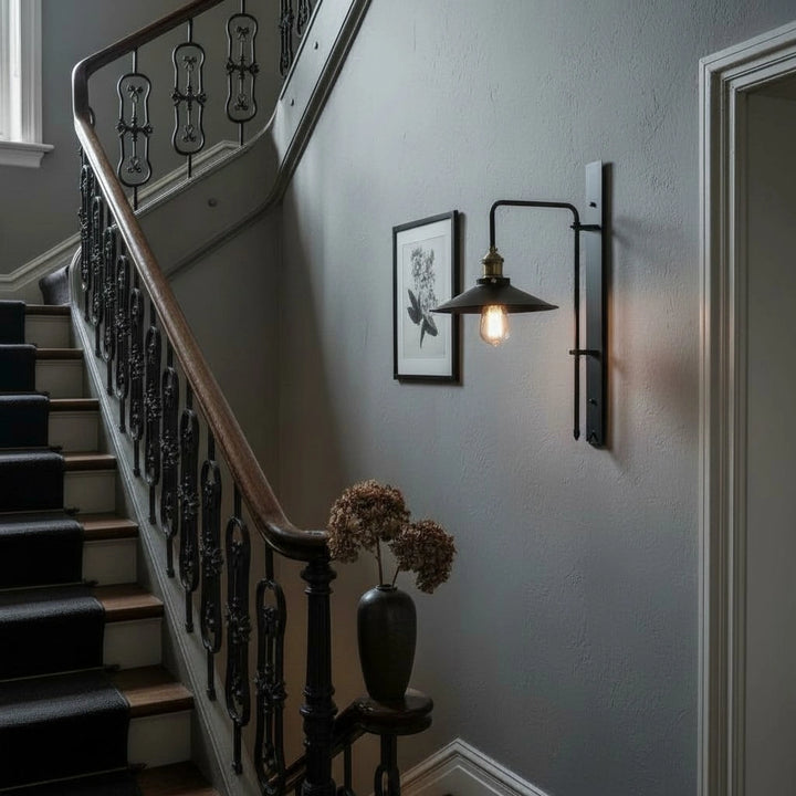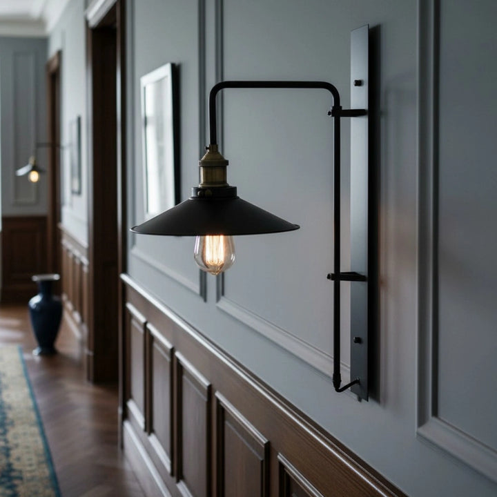 Denna vintage industriella vägglampa är gjord av järn och vinkeln på lampans huvud är justerbar. Passar för sovrum, korridorer, trapphus.